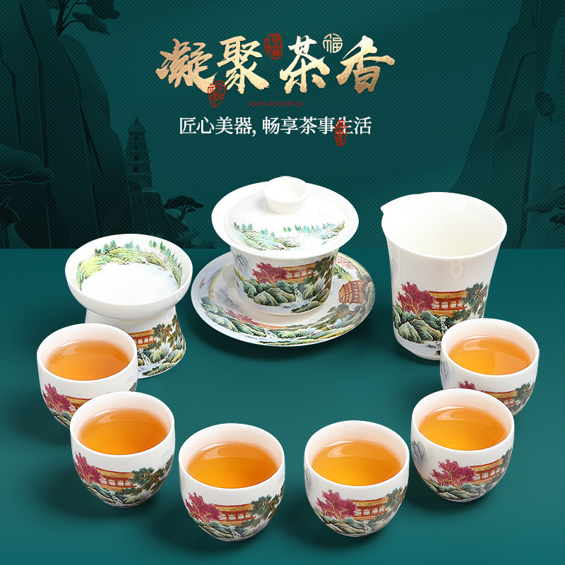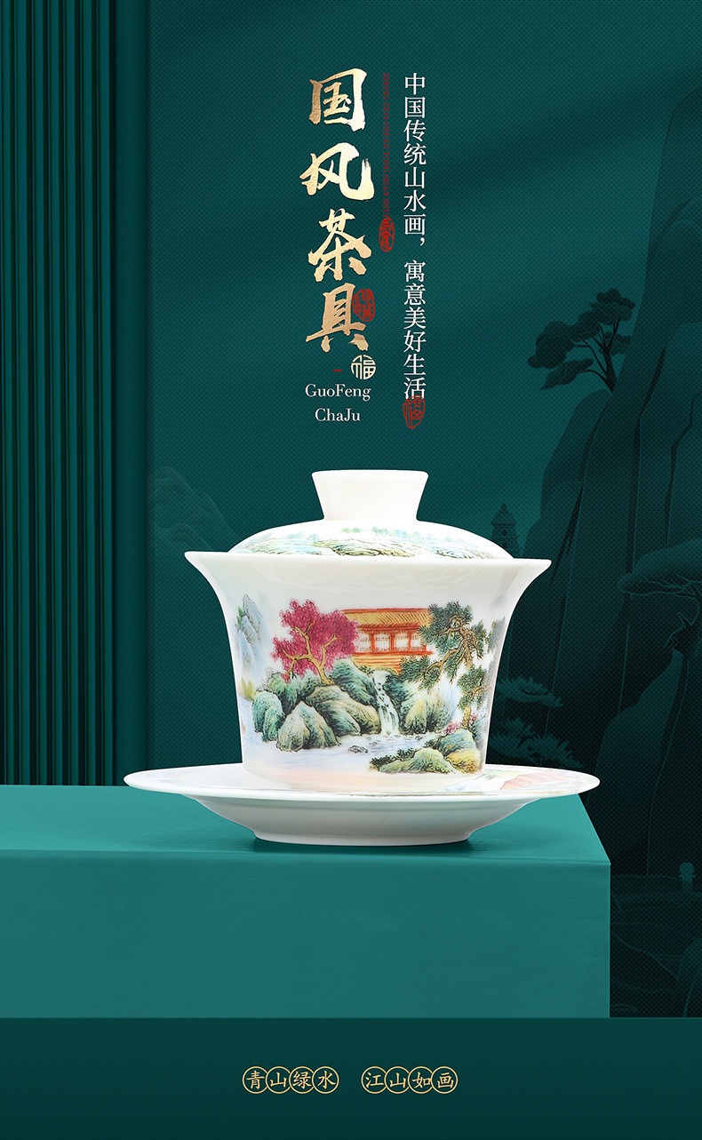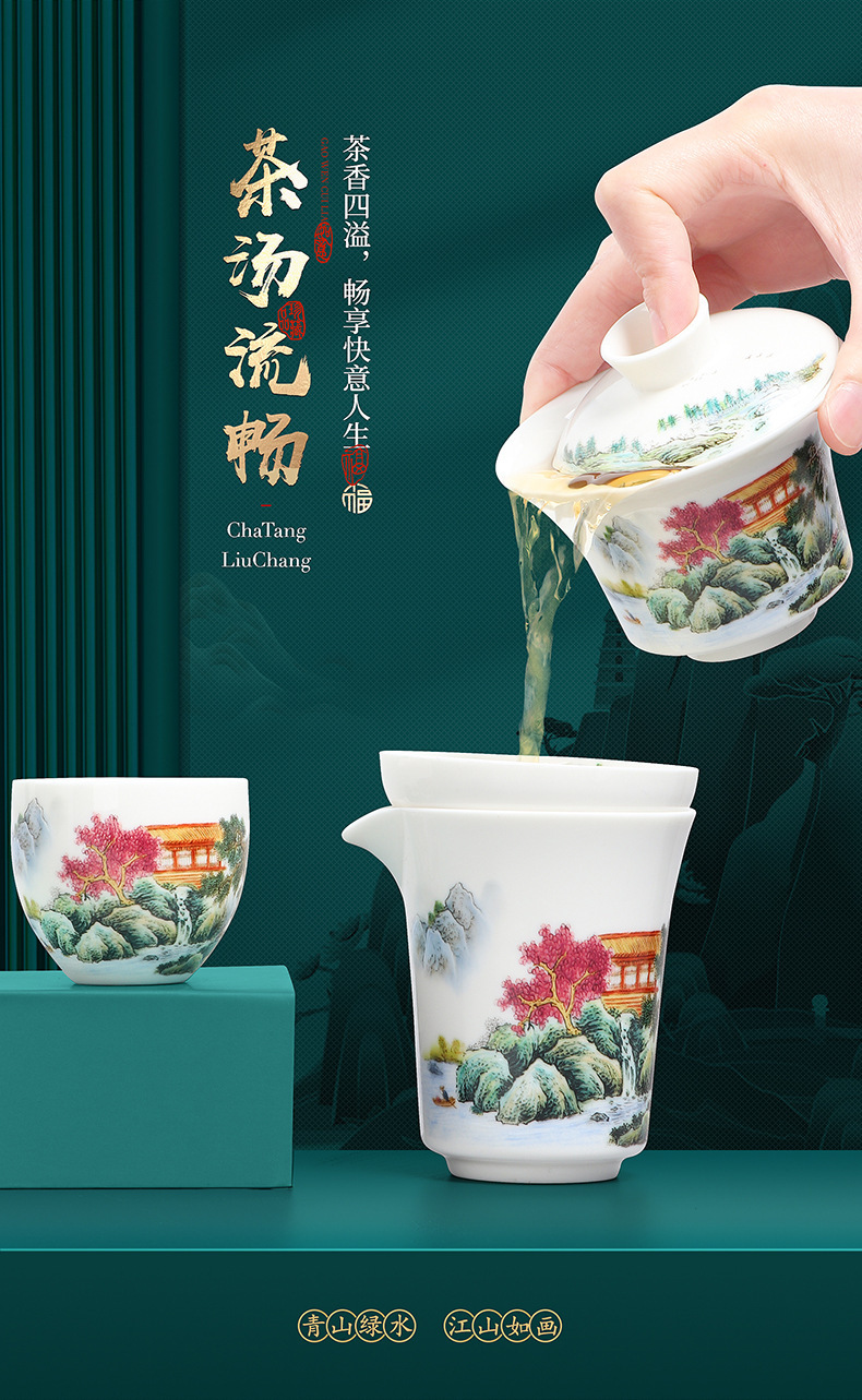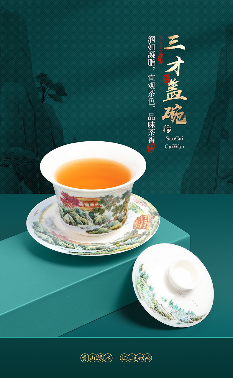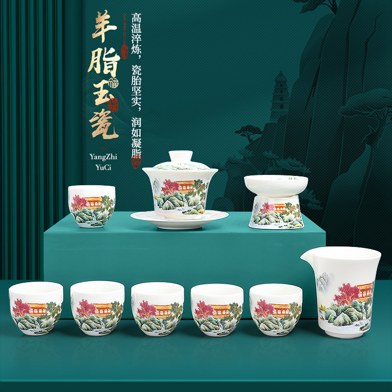 羊脂玉白瓷盖碗茶具套装功夫茶具家用高档三才盖碗千山万水礼品瓷