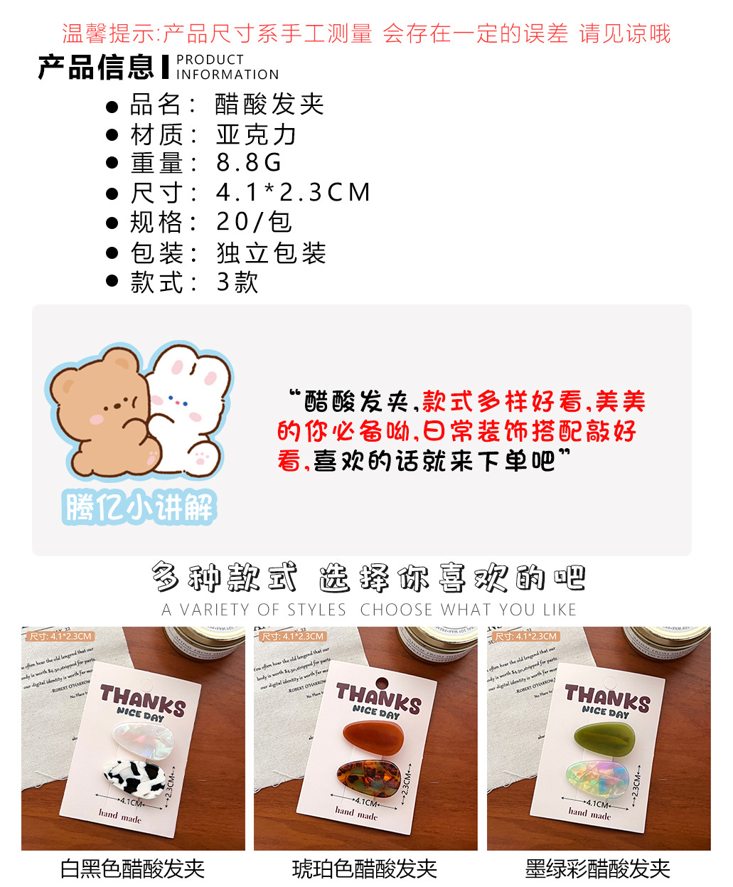 textured acetate fashion color contrast bang clip duckbill clip cute fat drops side small hairclip hairpin girls‘ hair accessories