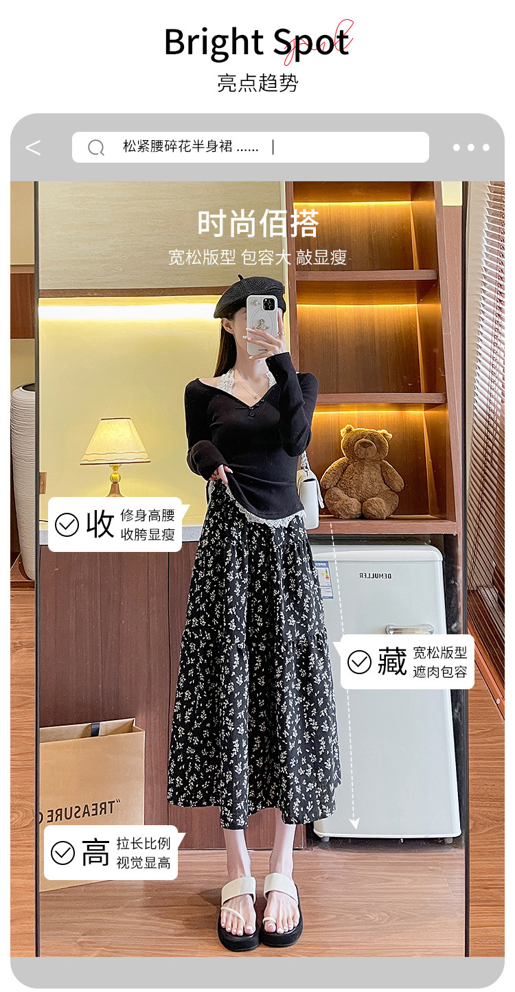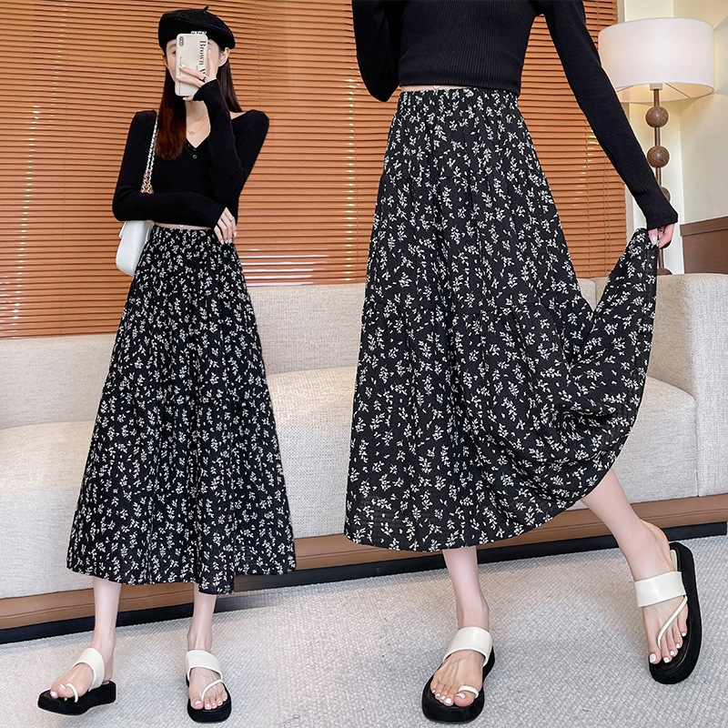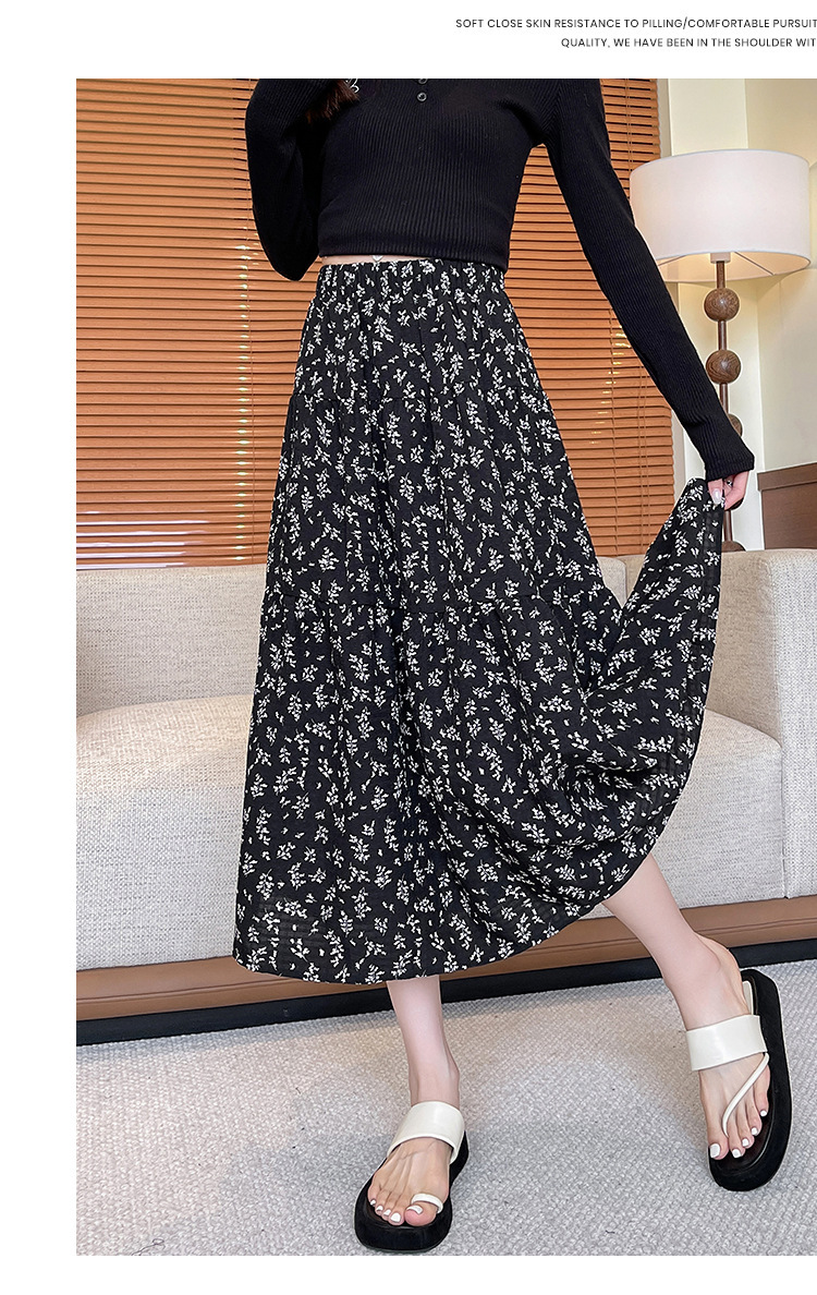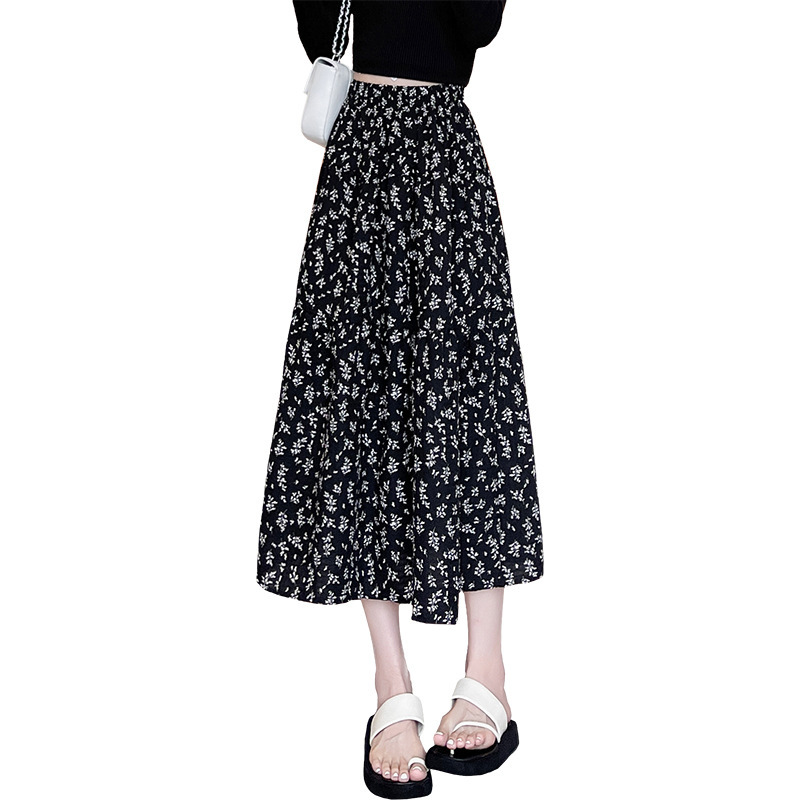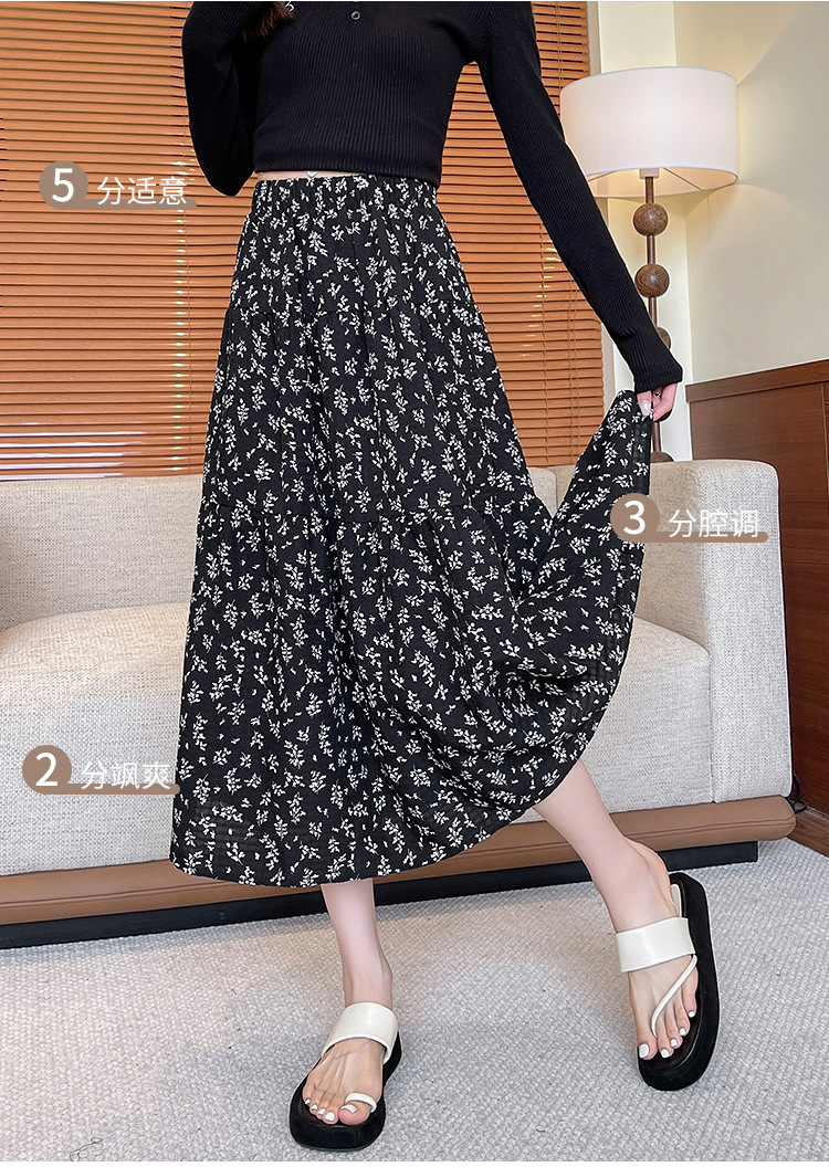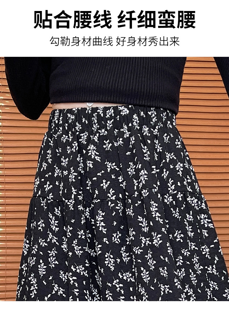 半身裙女春夏新款法式黑色碎花松紧腰显瘦遮胯秋冬高腰 a字中长裙