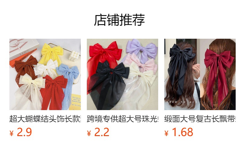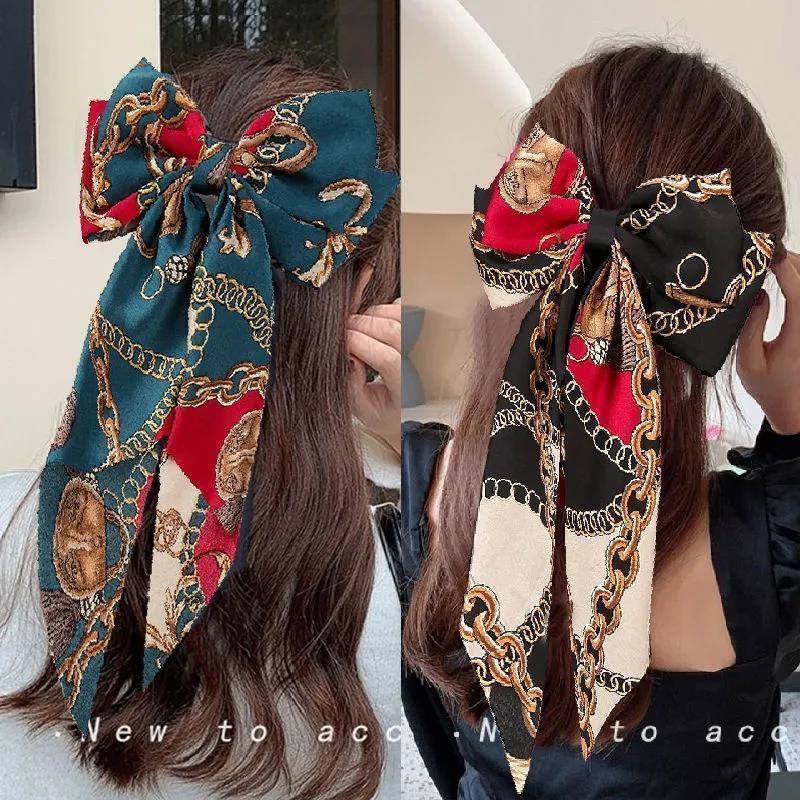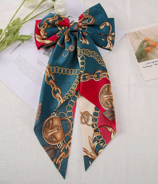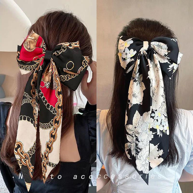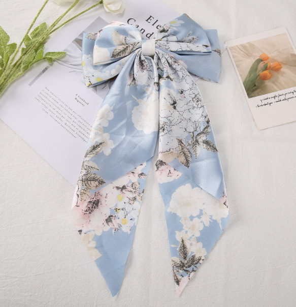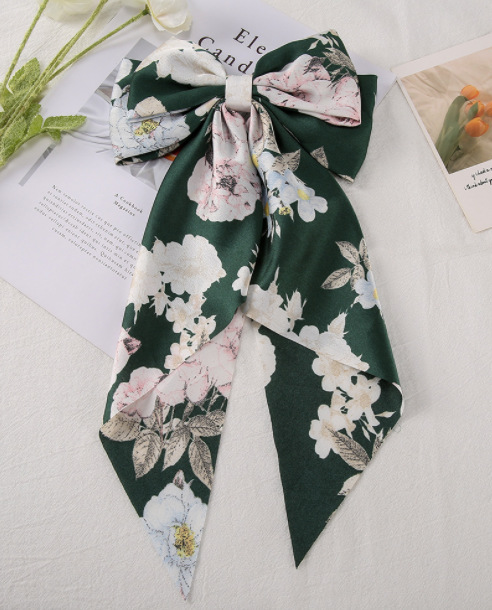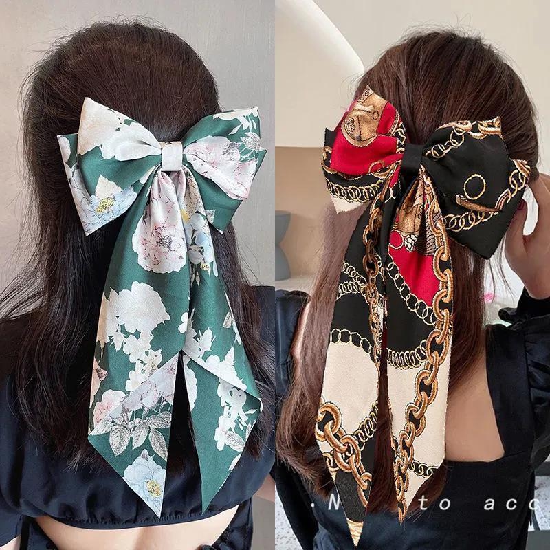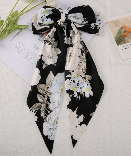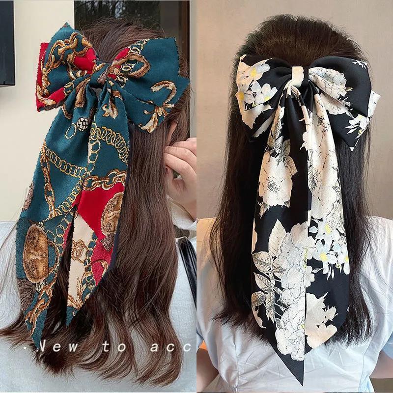 外贸专供复古缎面印花长飘带蝴蝶结发夹大号飘带蝴蝶结顶夹发饰