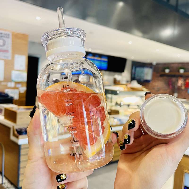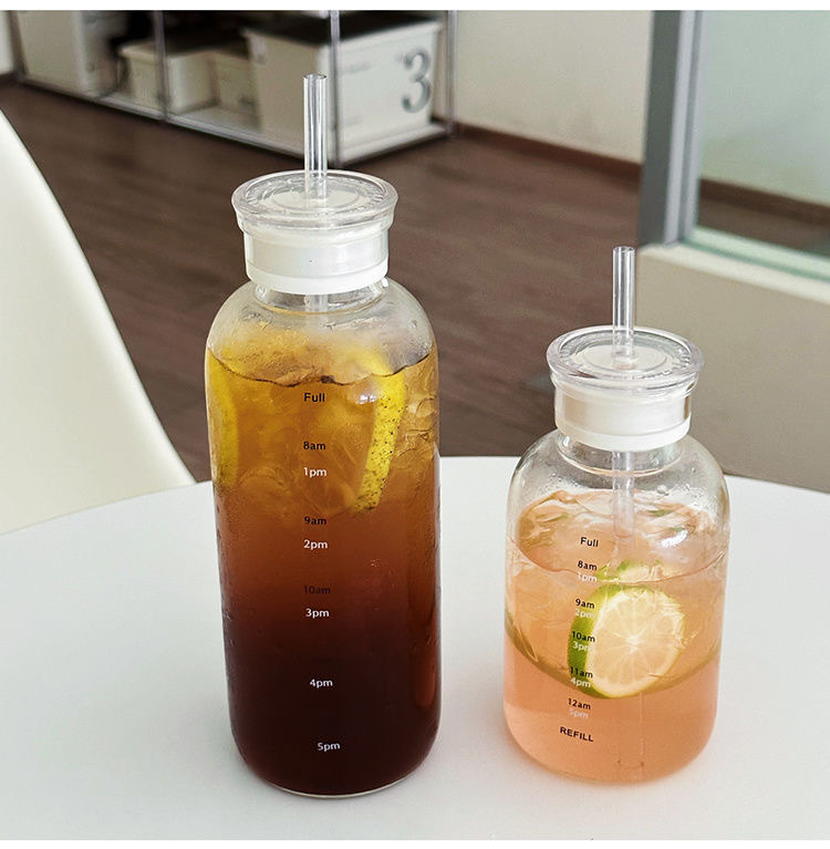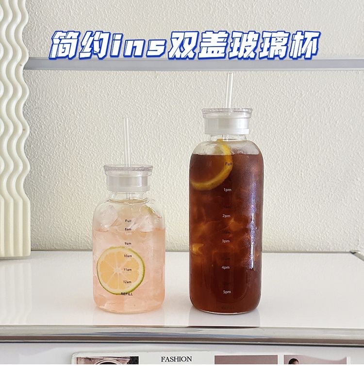 夏季新款简约家用吸管杯双盖时间刻度高硼硅玻璃水杯批发可做礼品