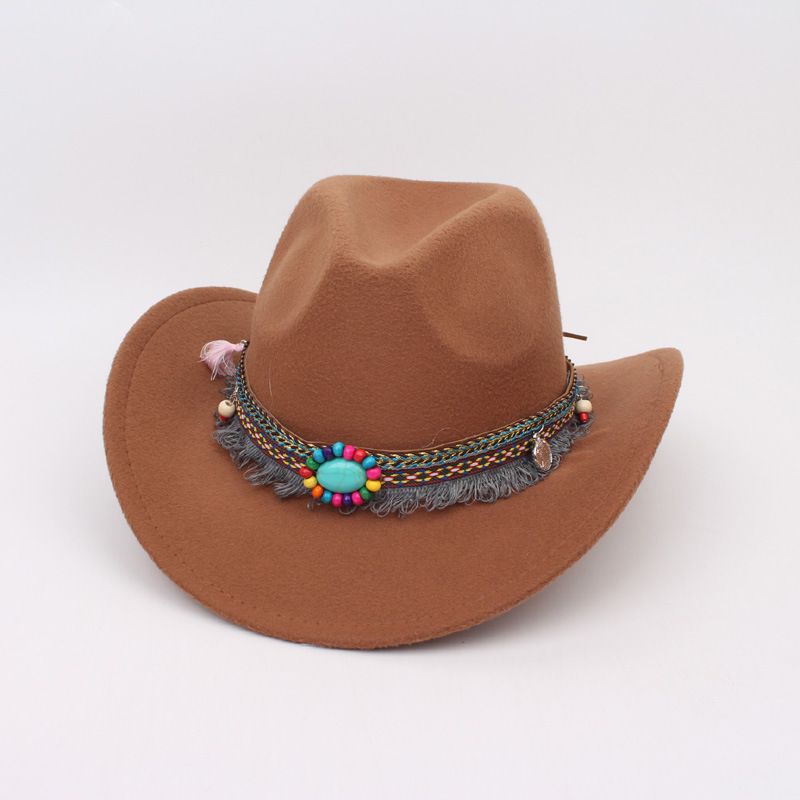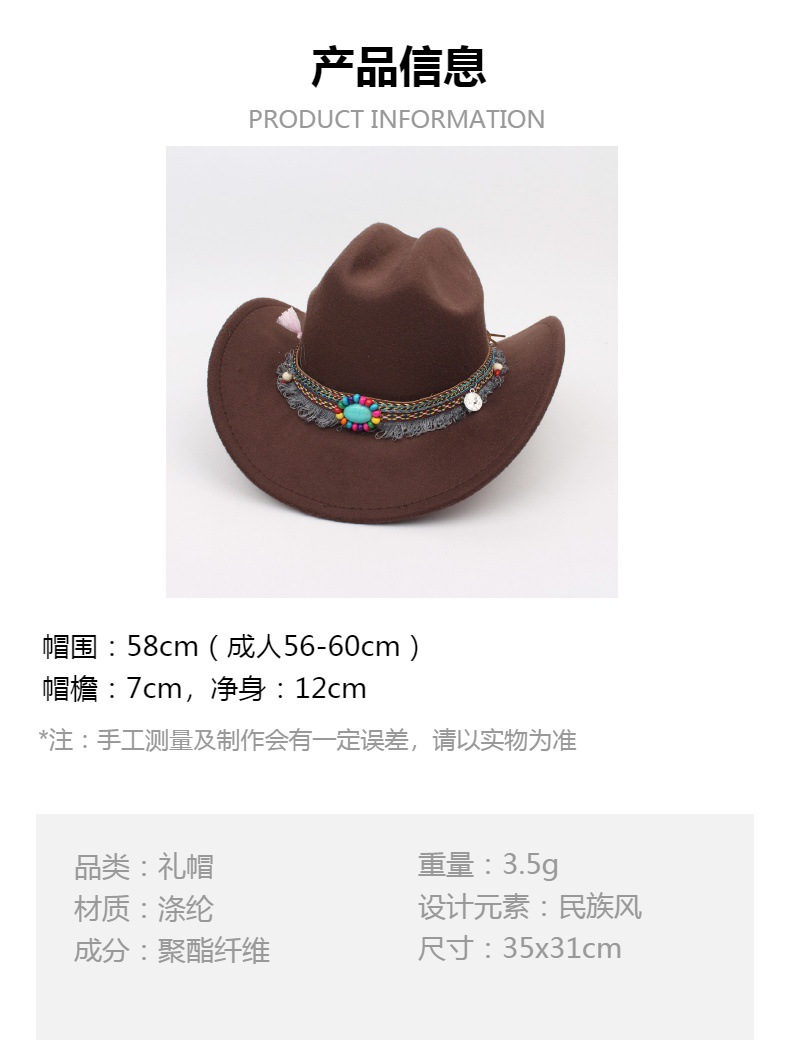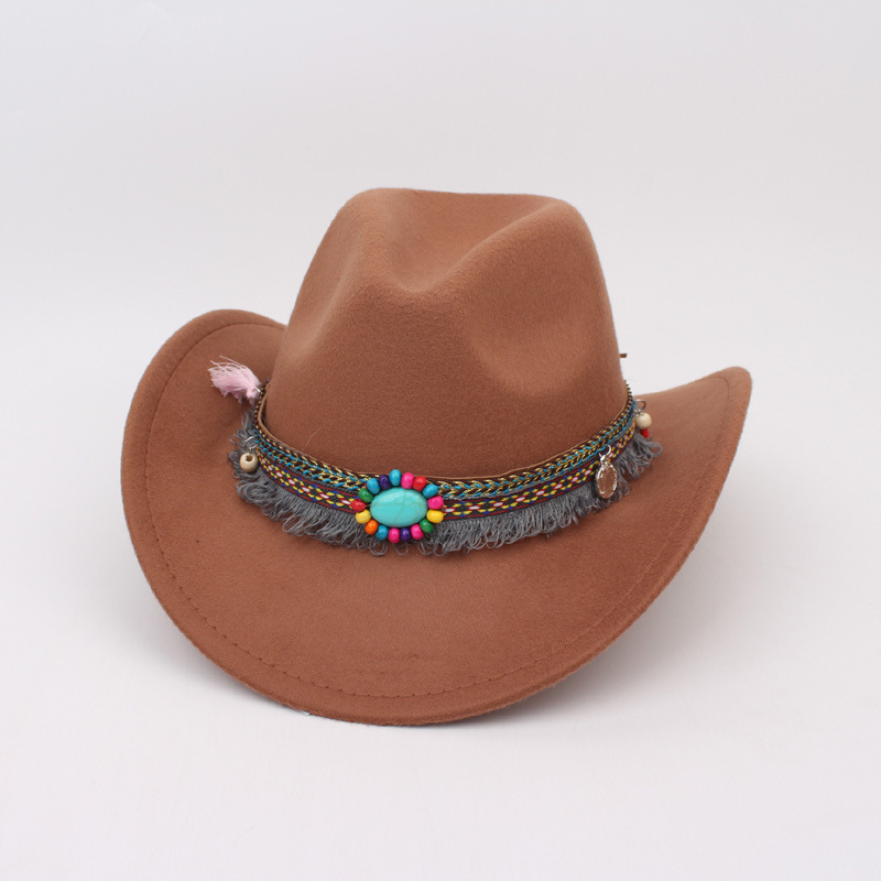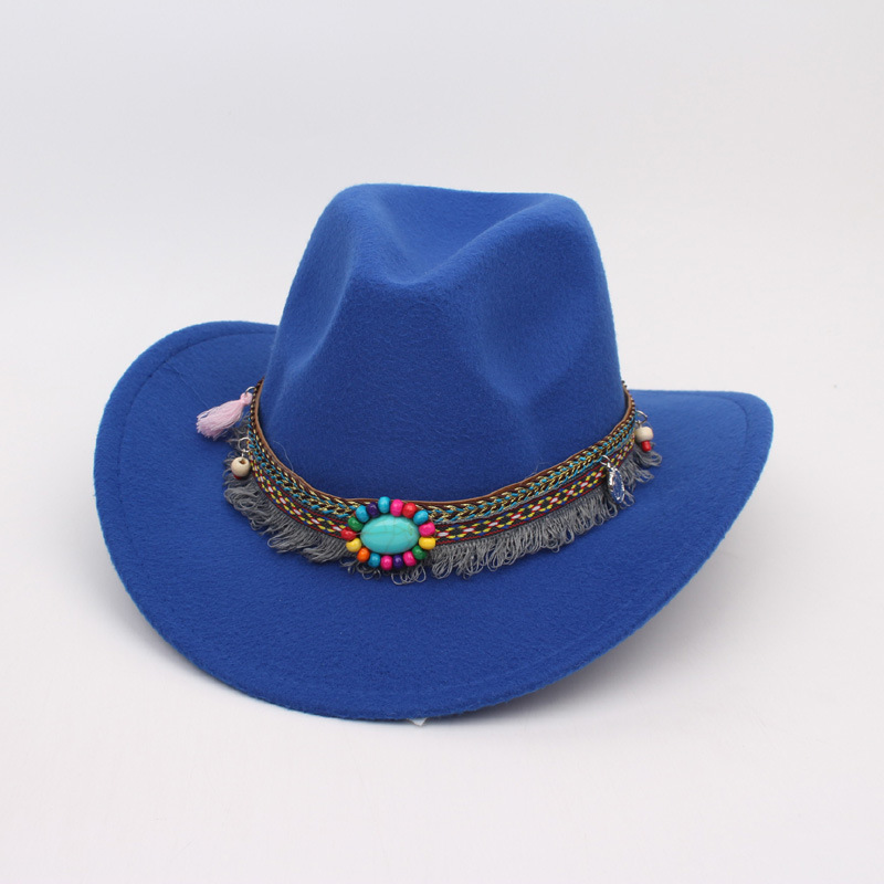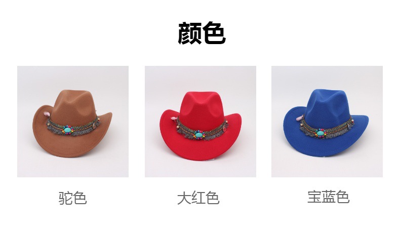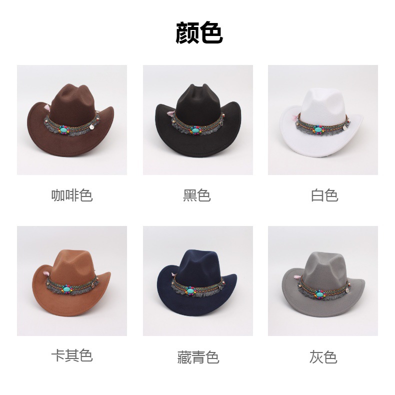 跨境少数民族礼帽流苏西部牛仔帽爵士帽绿松石毛毡帽卷边藏式帽子
