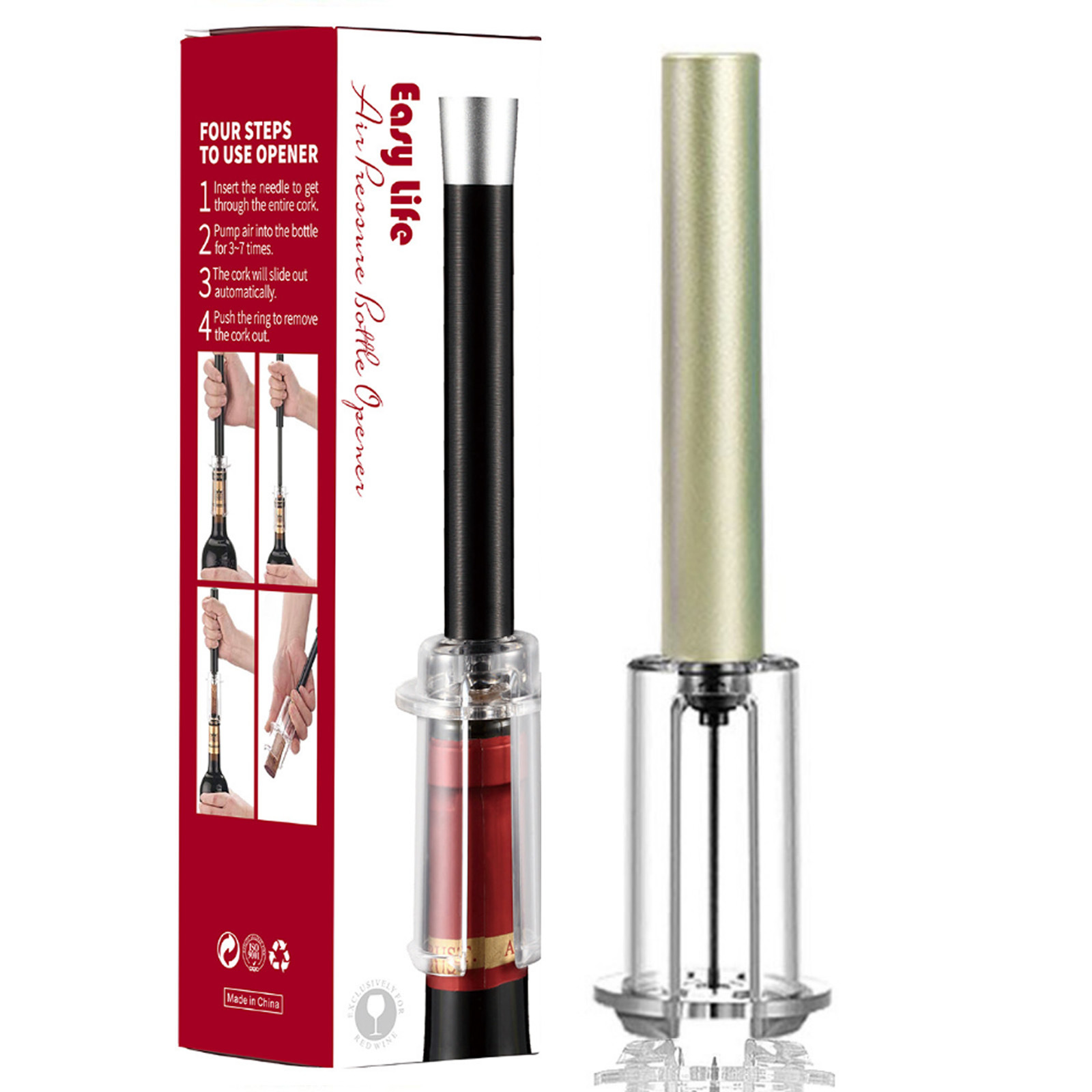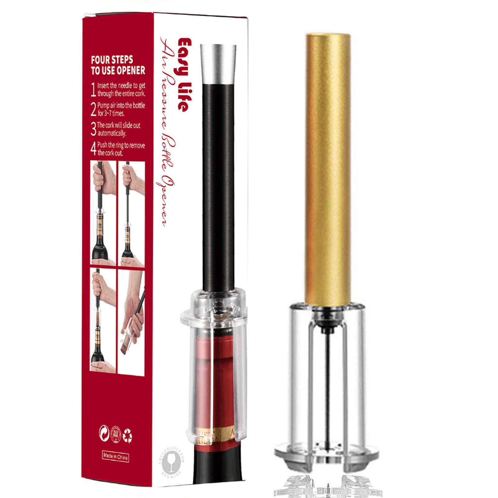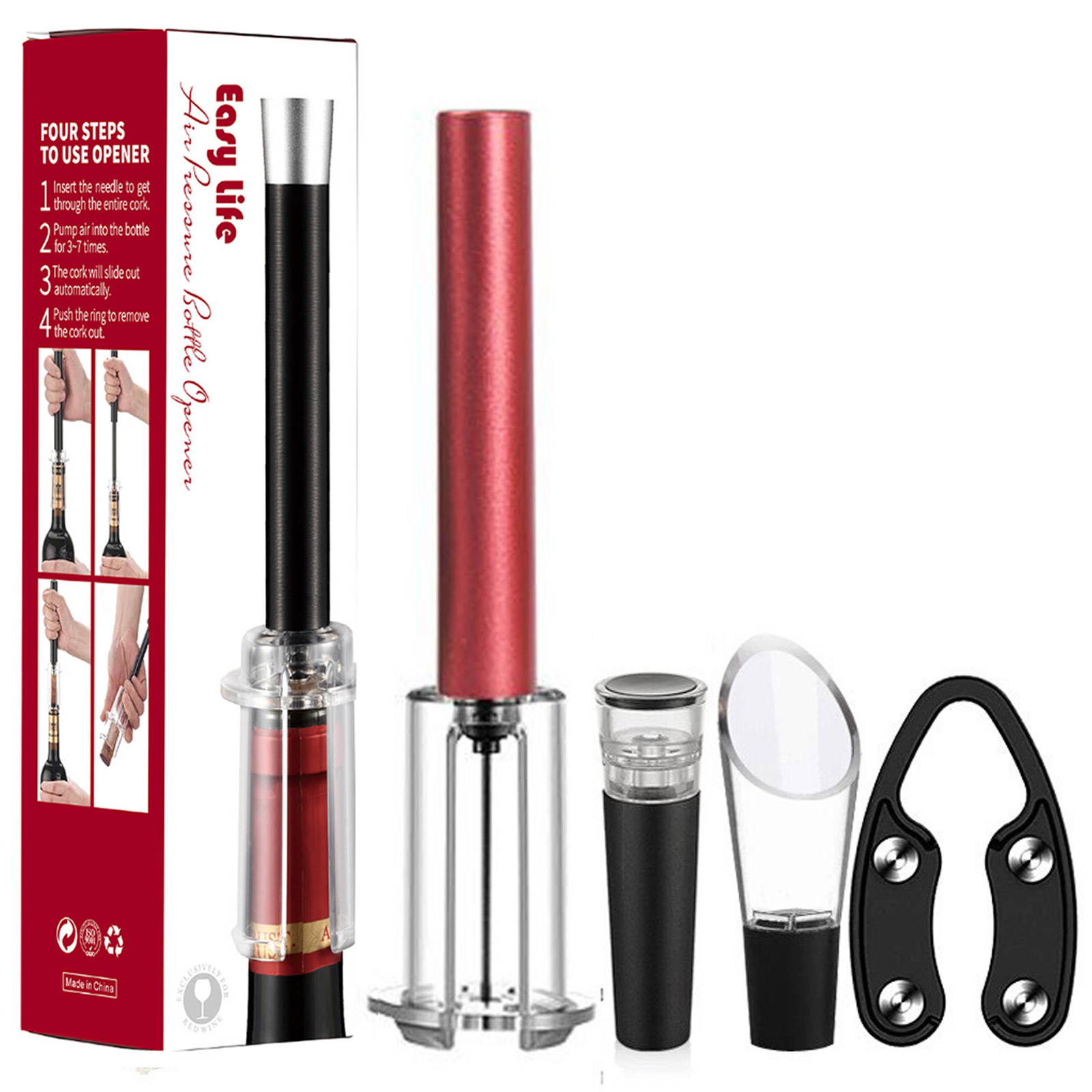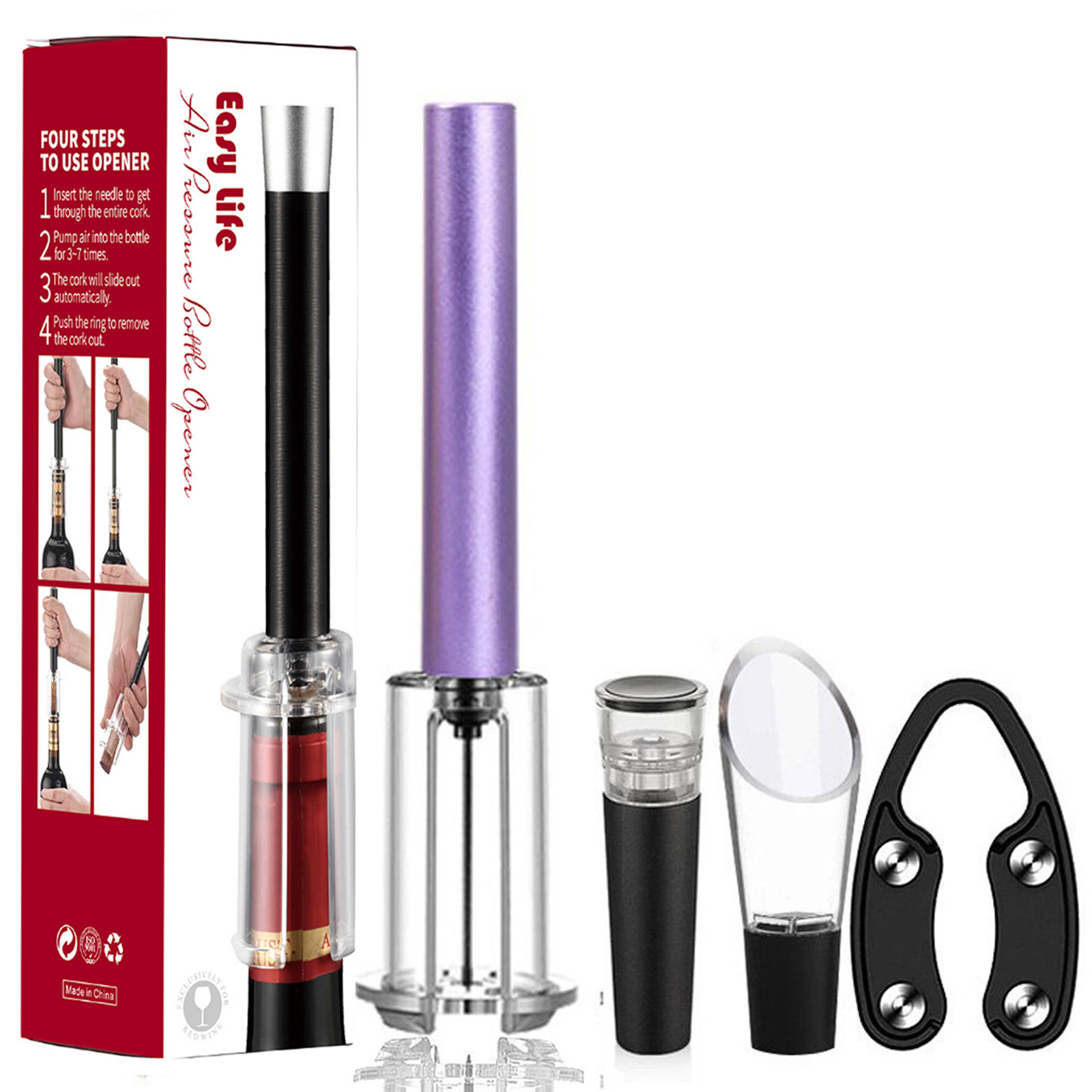 跨境红酒手动气压开瓶器 针式气压开瓶器4件套开酒器礼盒酒具套装