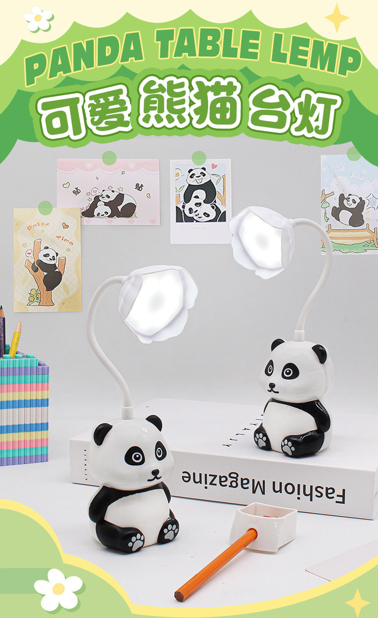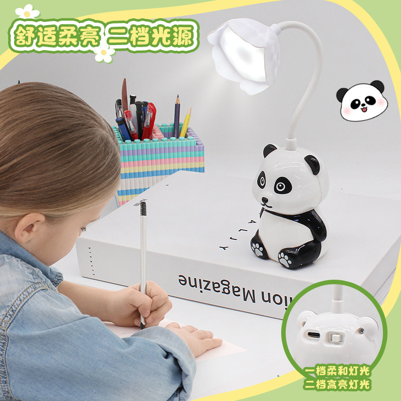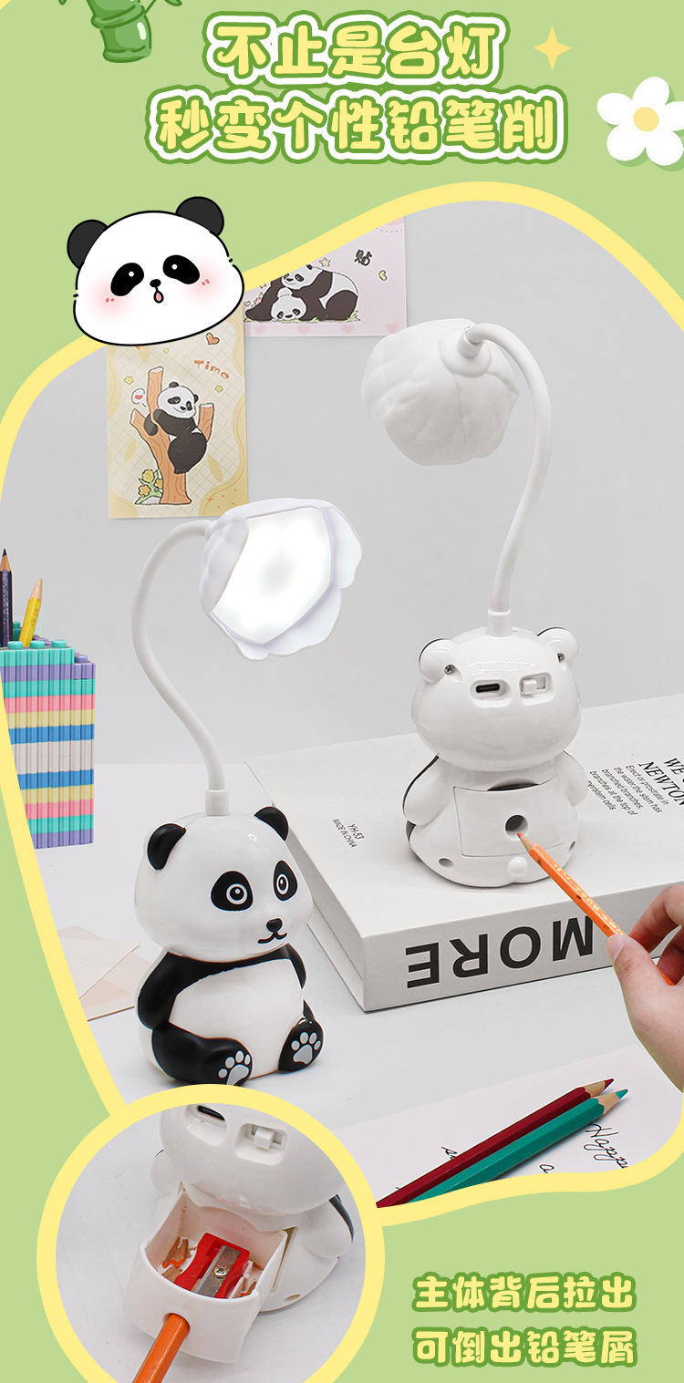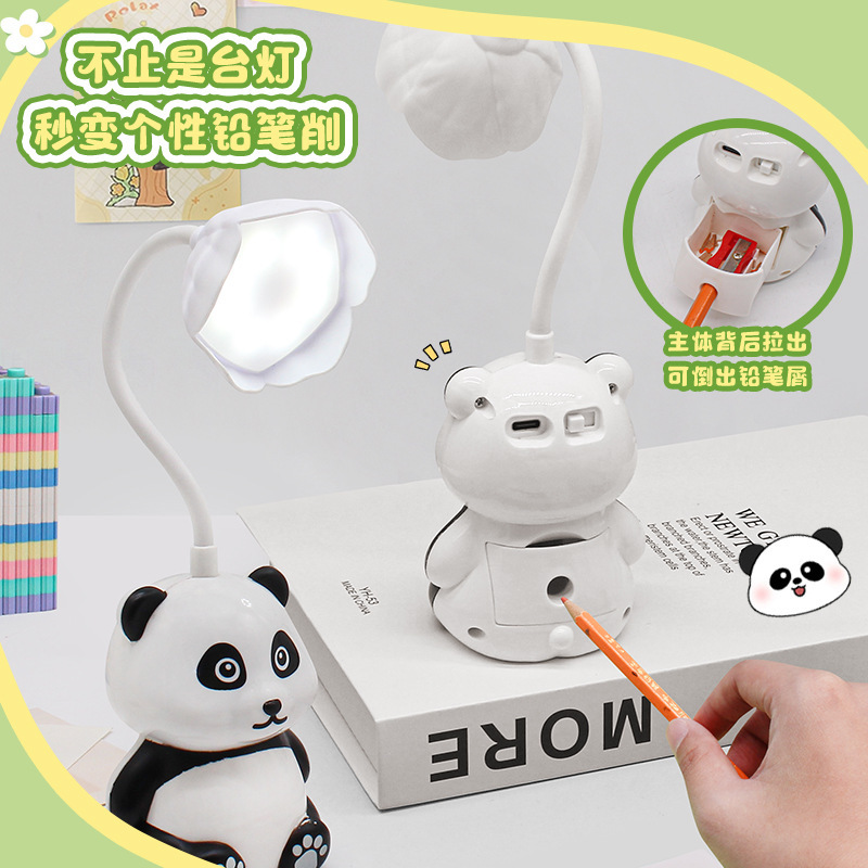 LED多功能学生学习充电台灯卡通熊猫护眼小夜灯配铅笔削二档灯光