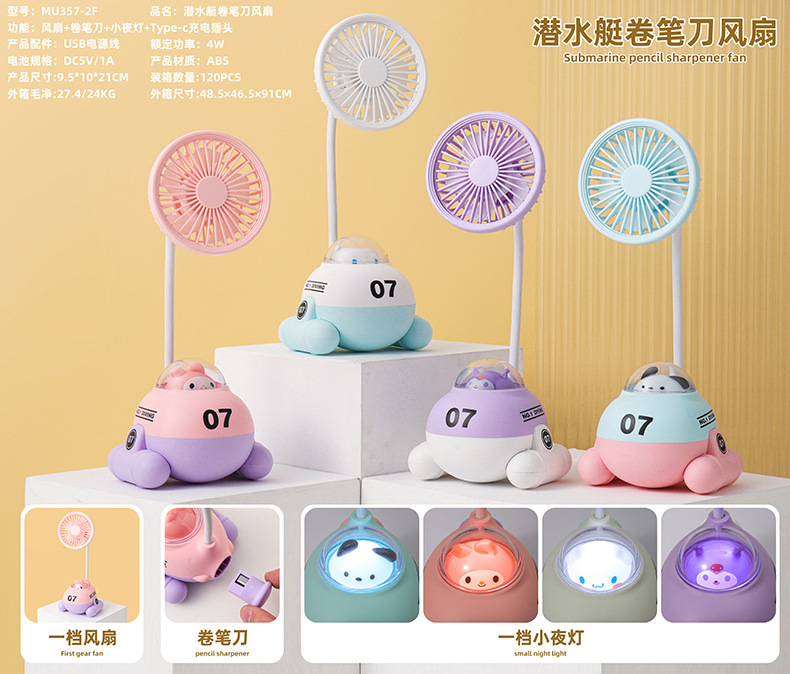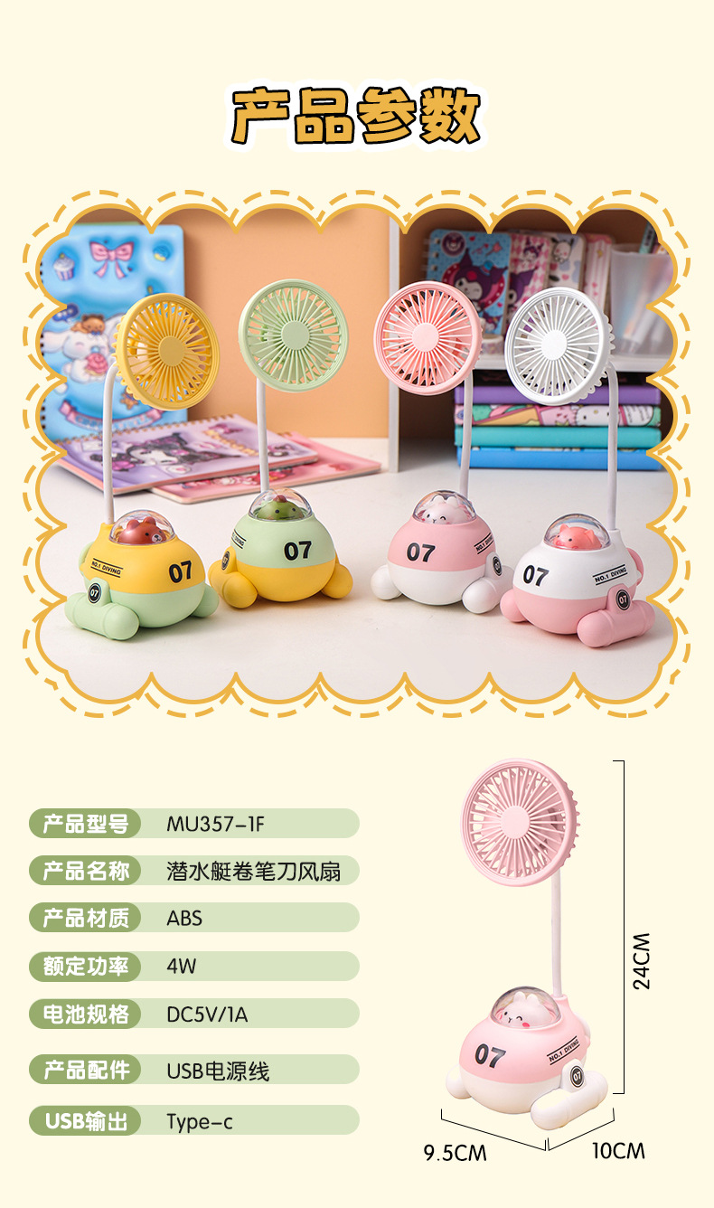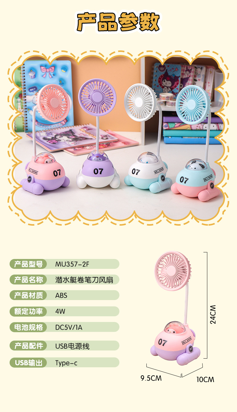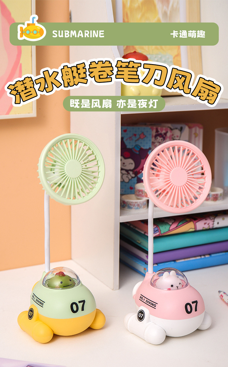 儿童卡通潜水艇小风扇USB充电学生桌面卷笔刀风扇便携式礼品电扇
