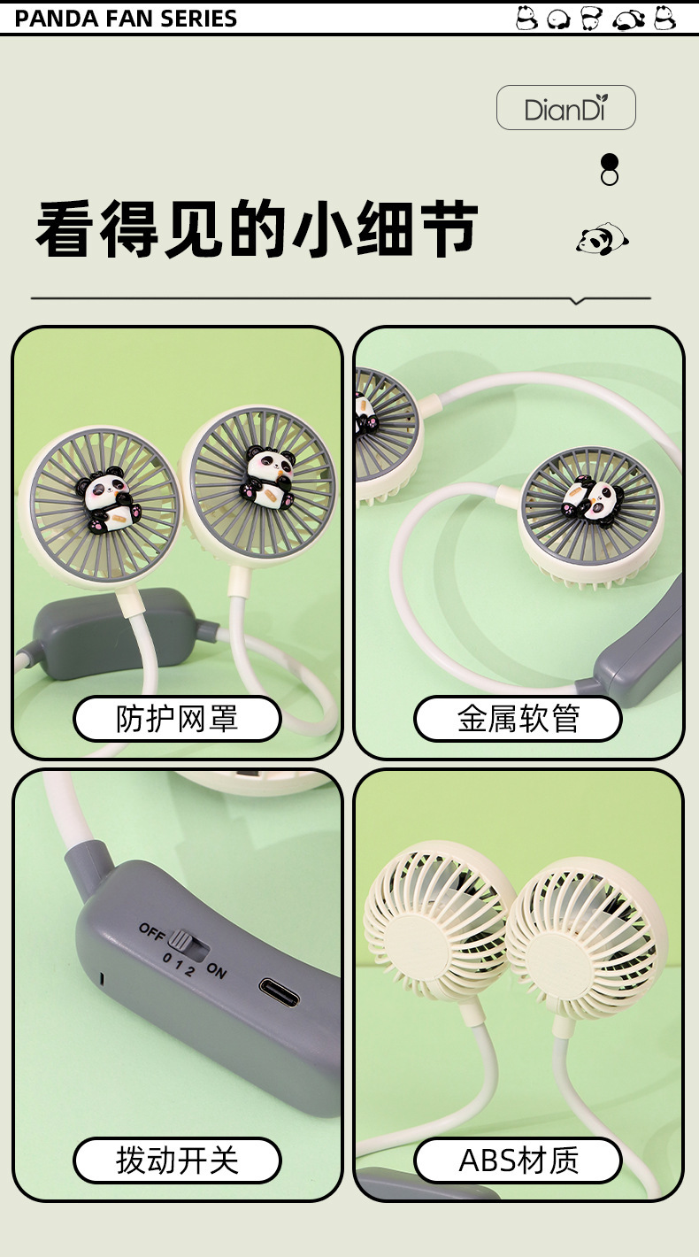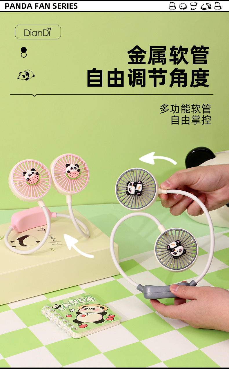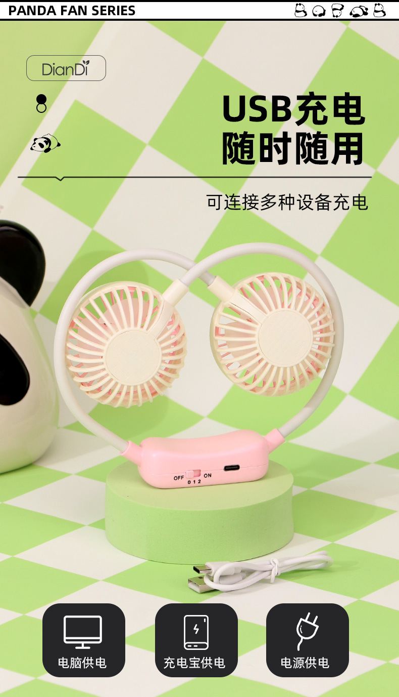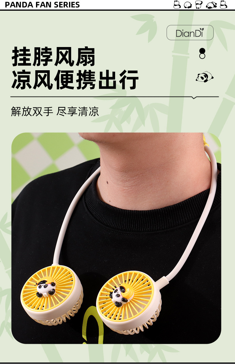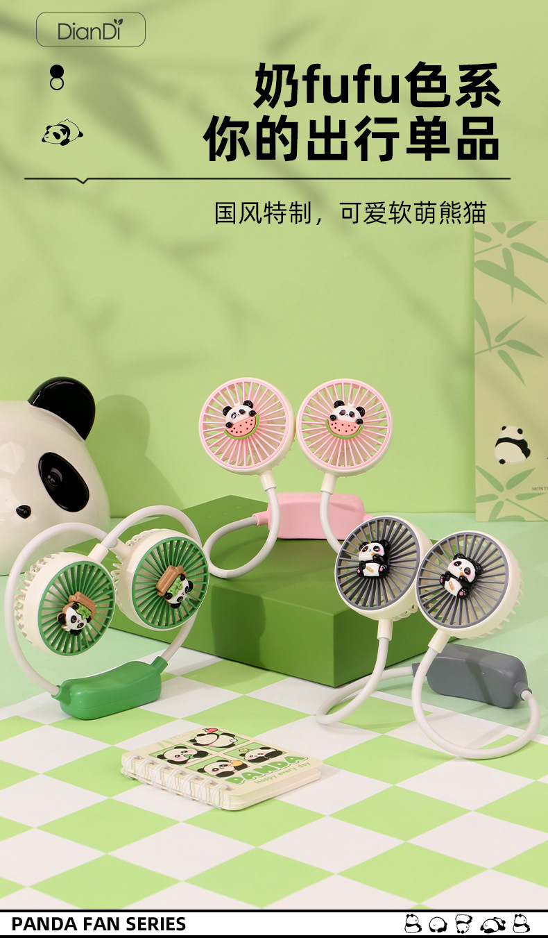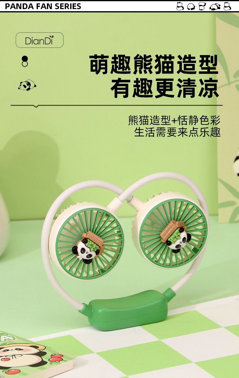 跨境新款熊猫懒人挂脖小风扇usb充电户外便携式大风力电扇批发厂