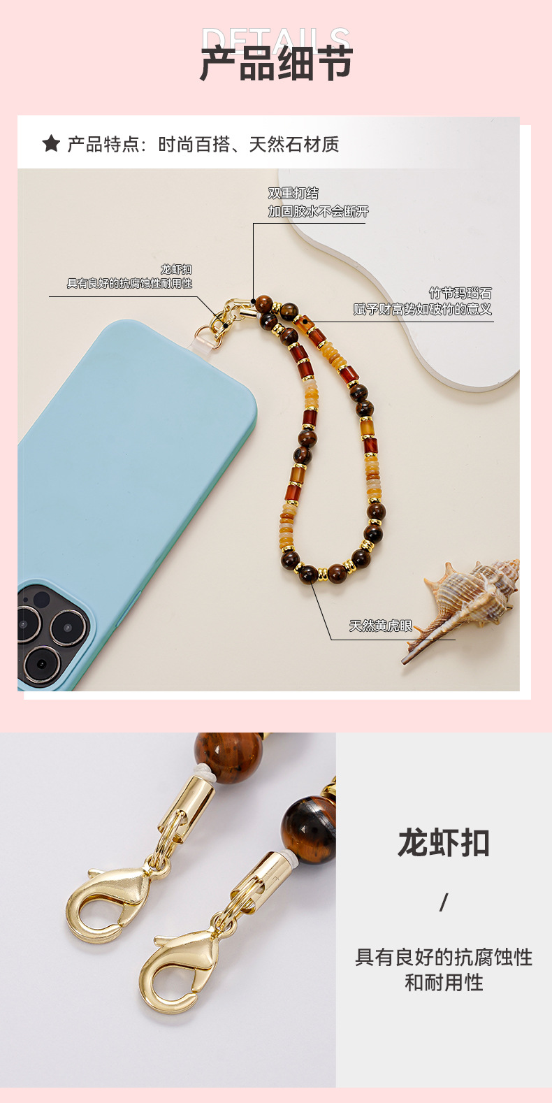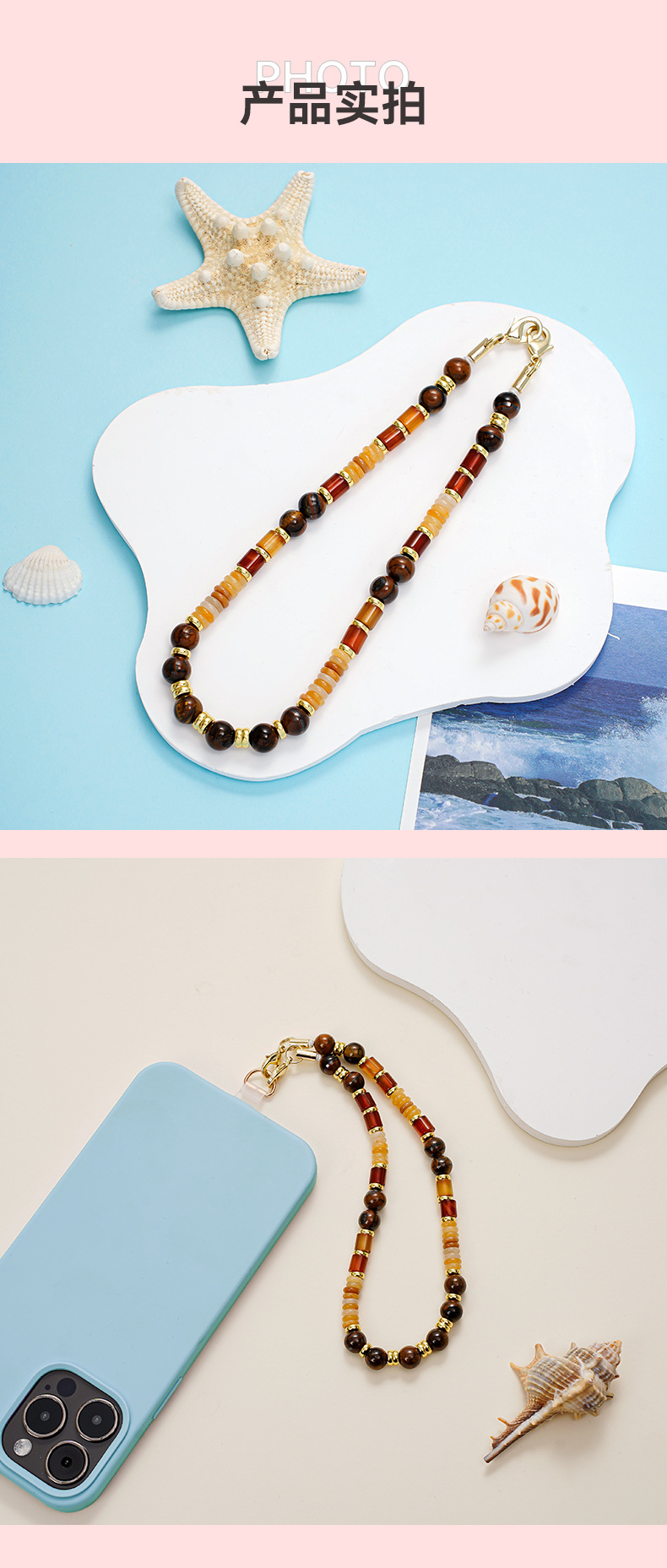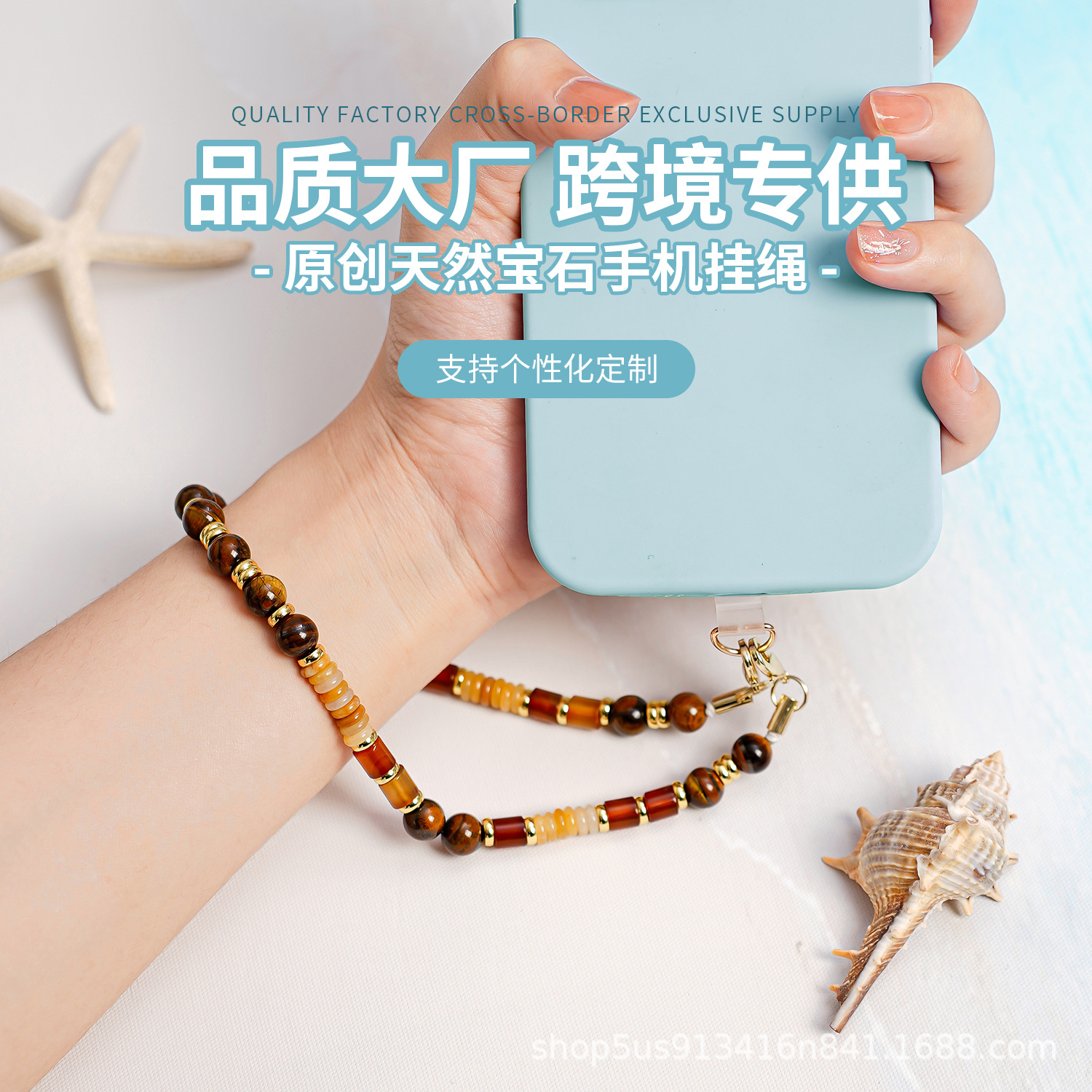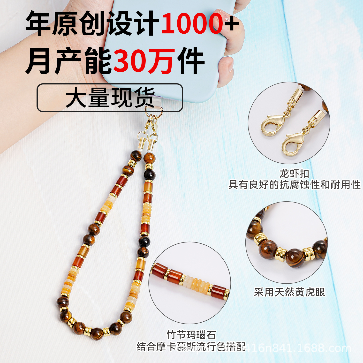 半宝石黄虎眼串珠手机链高级感防丢短款玛瑙简约亚马逊手机挂饰