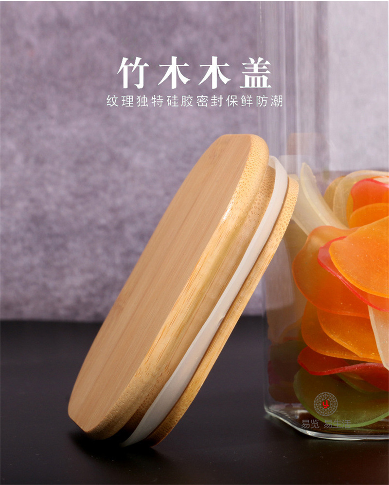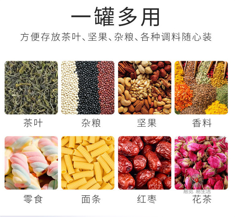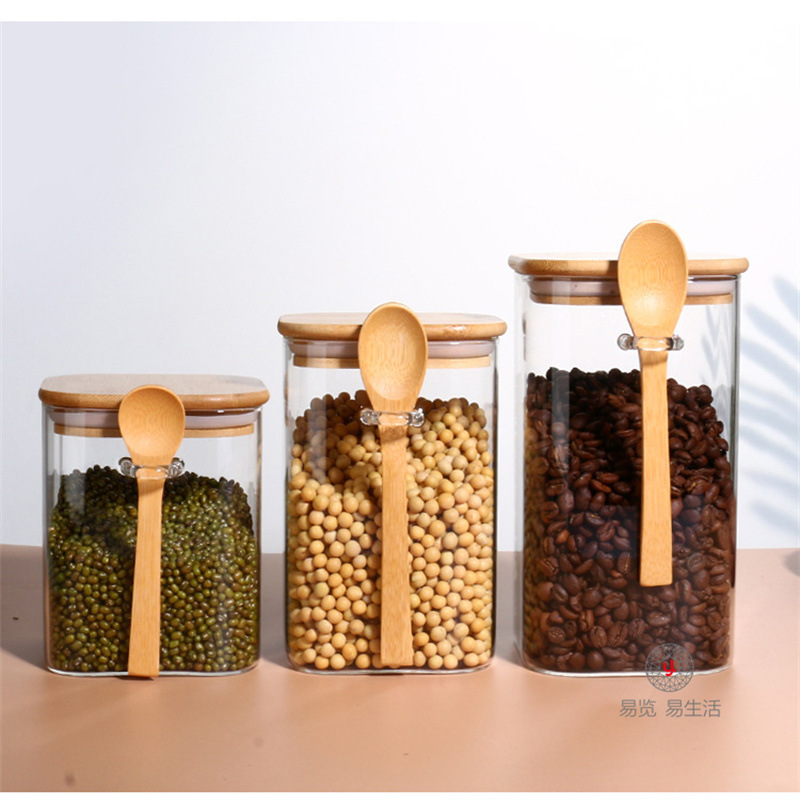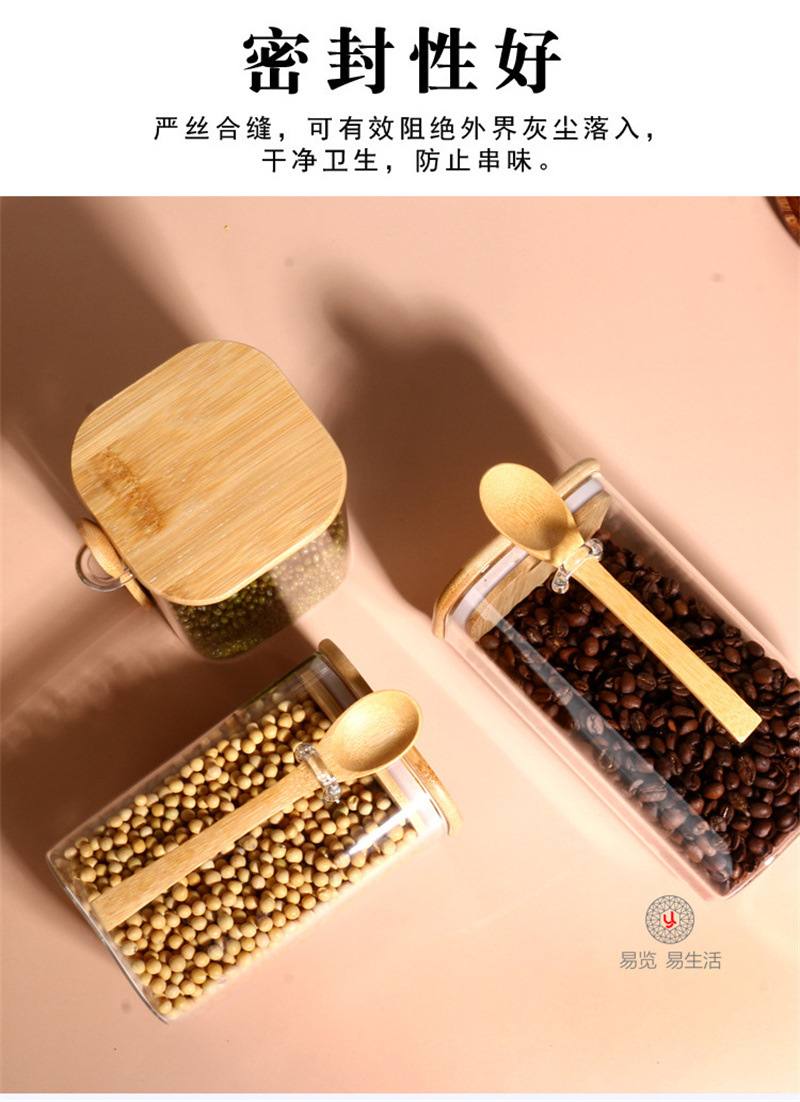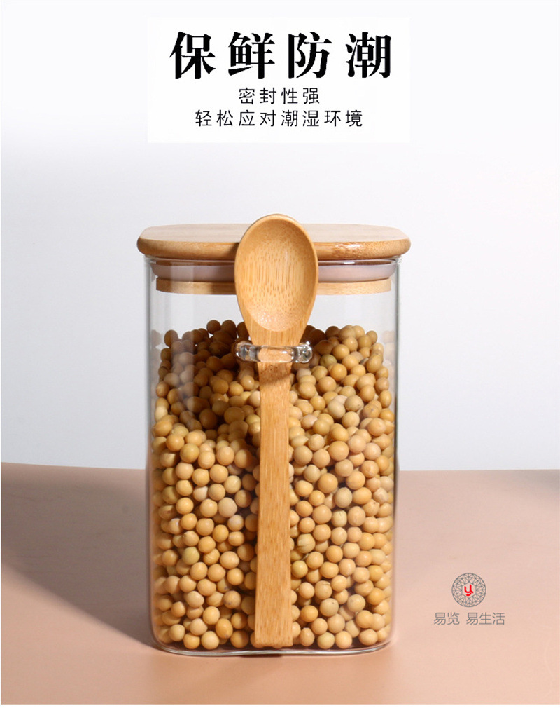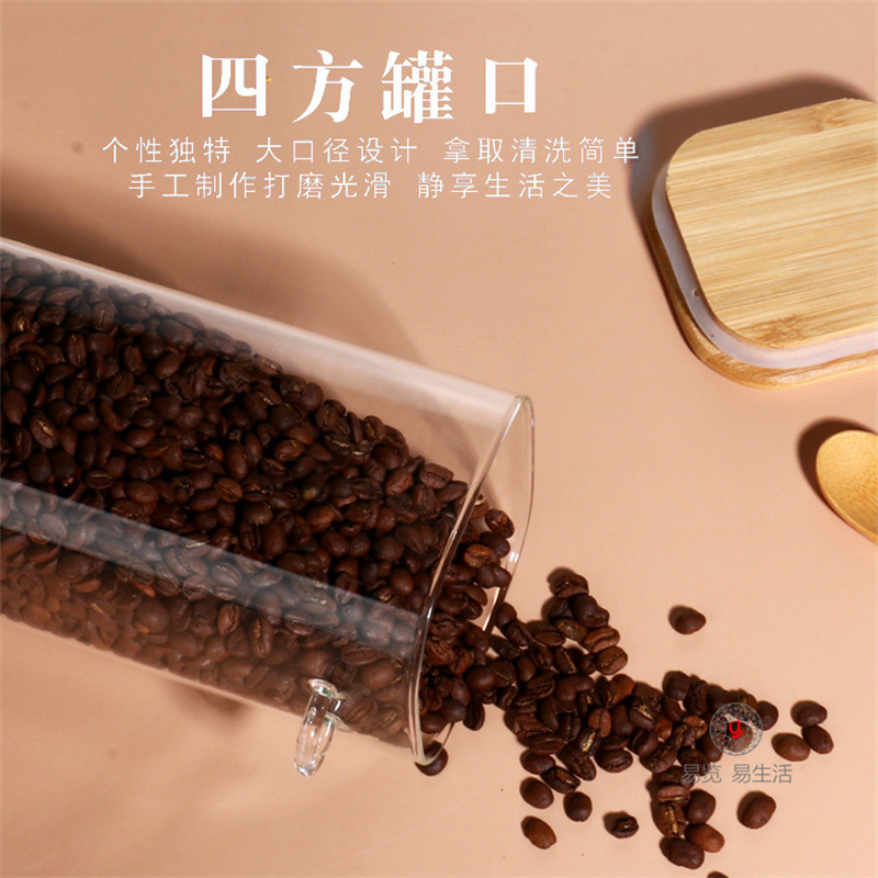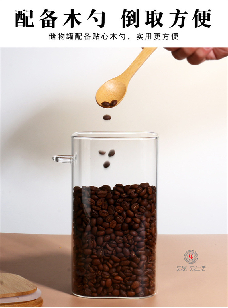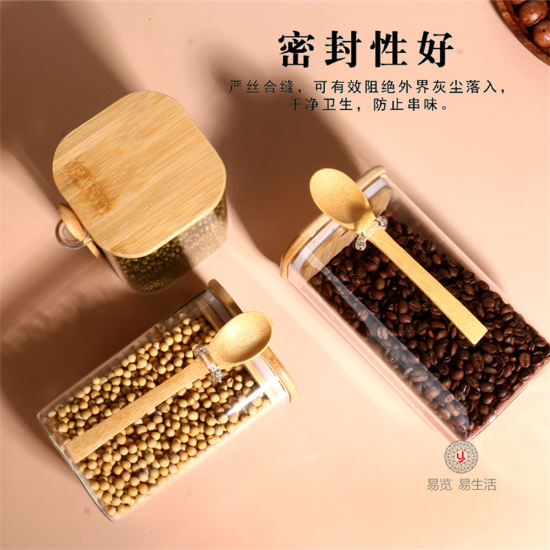 方形厨房杂粮收纳密封调料罐带木勺咖啡豆玻璃茶叶储物罐带盖玻璃