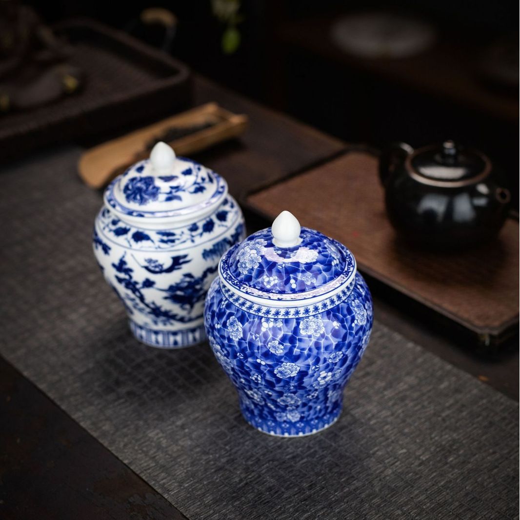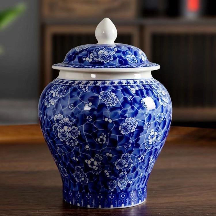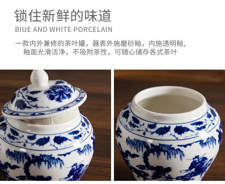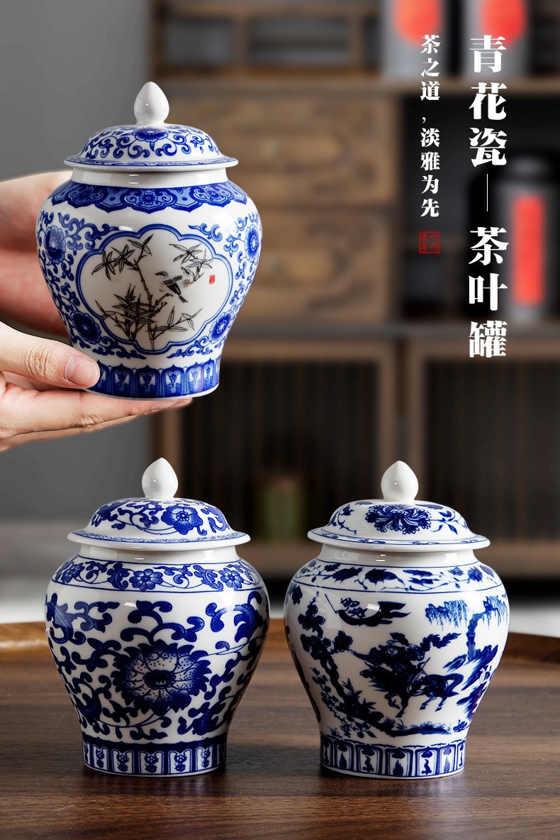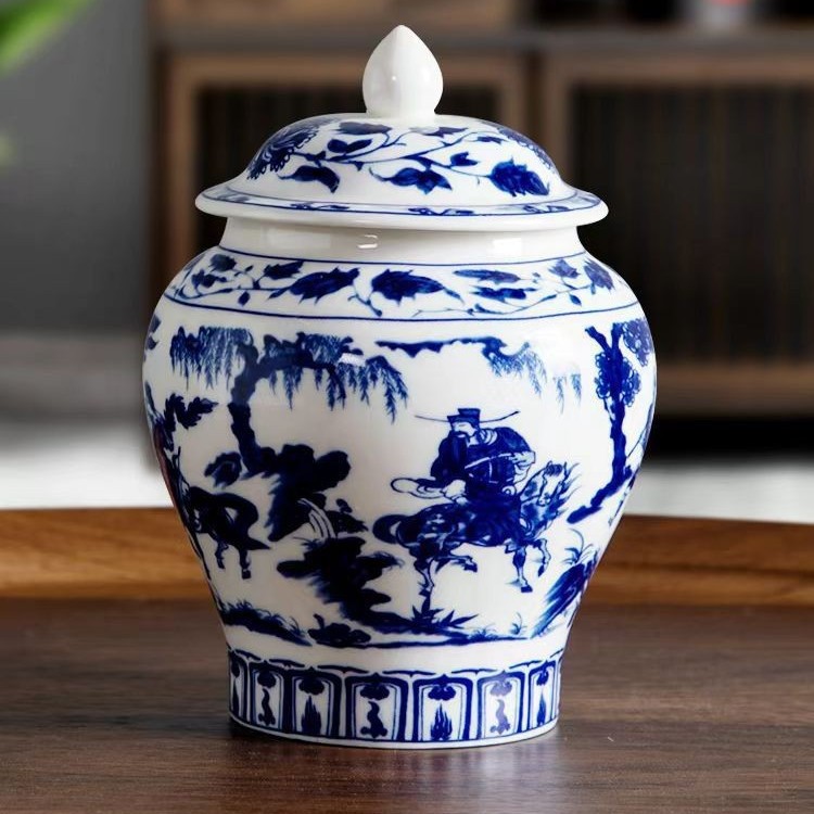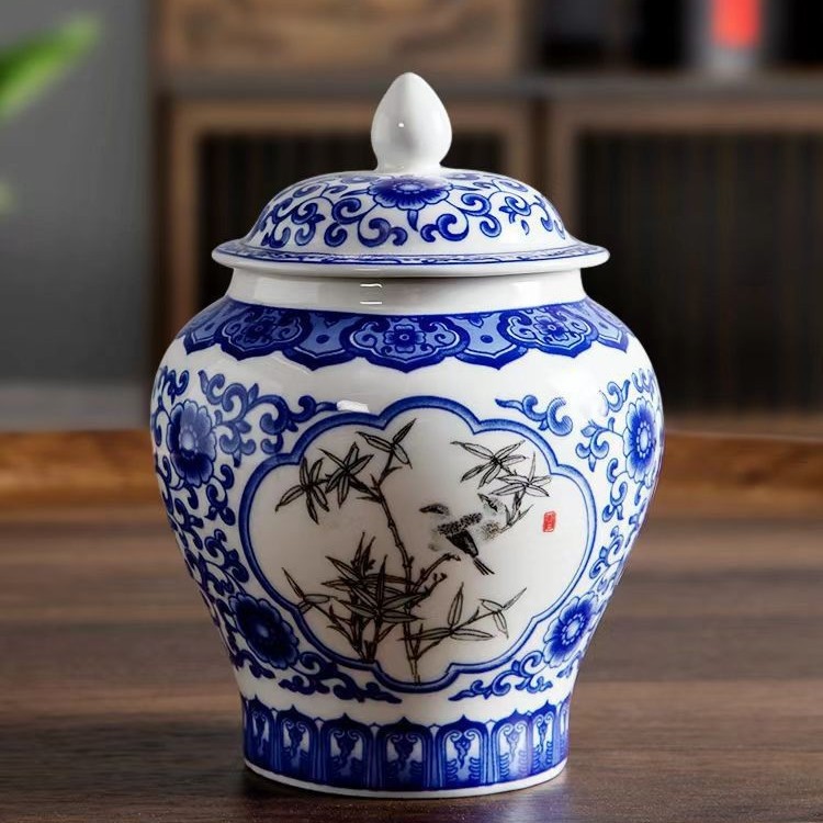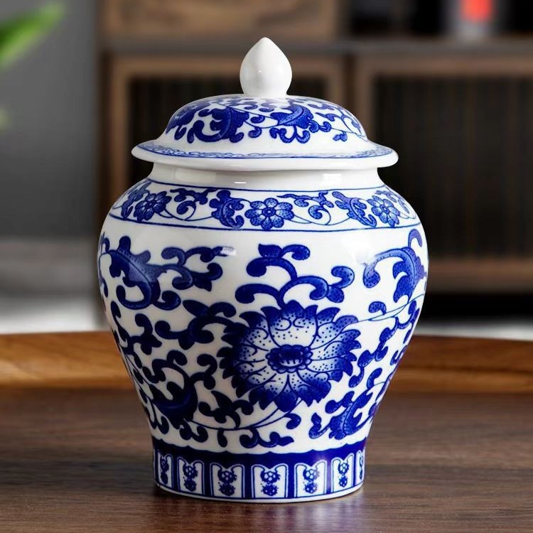 青花将军罐家用陶瓷茶叶普洱中式密封罐茶叶罐储存防潮复古收纳罐