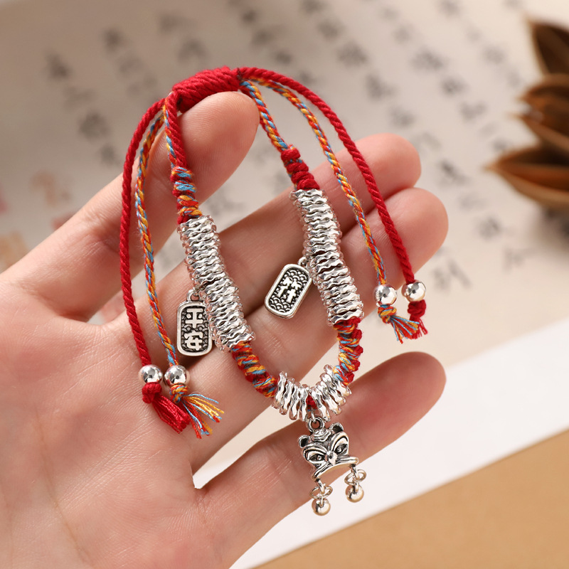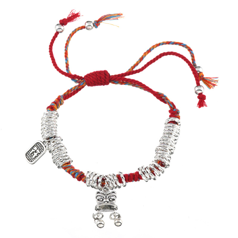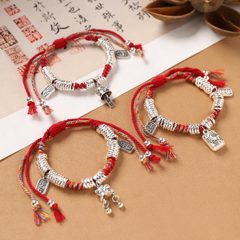 藏式手工银盘缠手链本命年编织红彩绳碎银手串复古民族风男女手绳