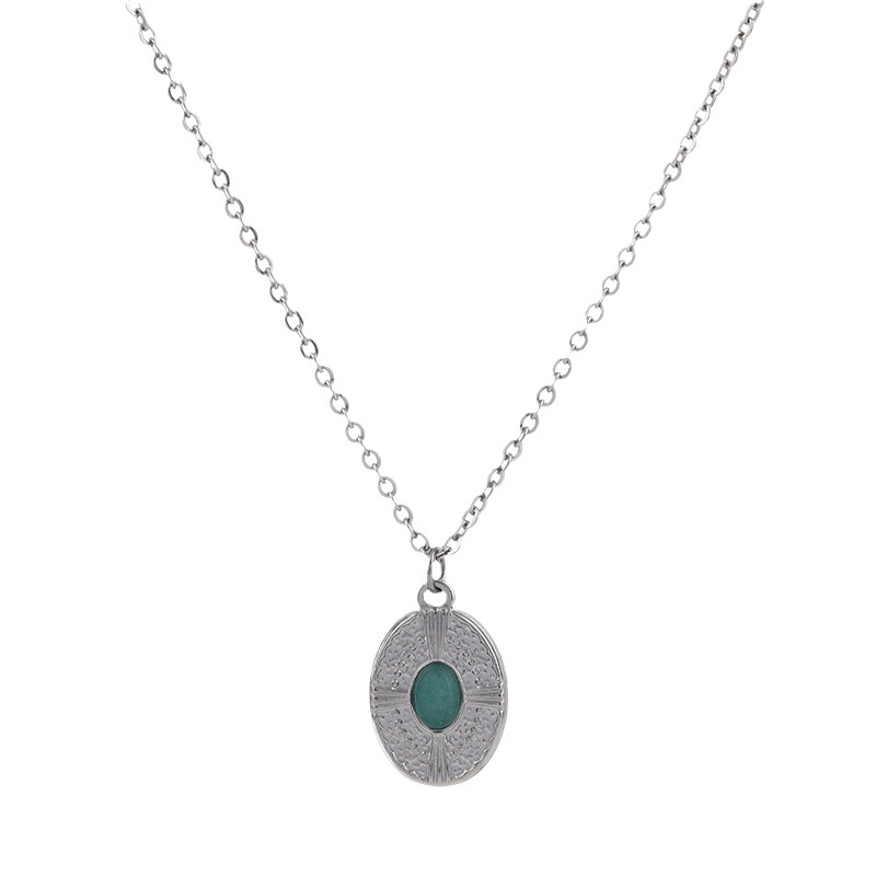厂家批发不锈钢椭圆形项链 小众设计镶嵌绿珠雕刻花纹项链首饰品