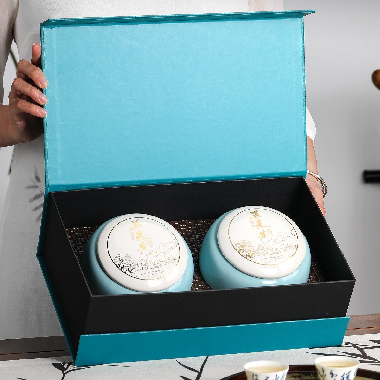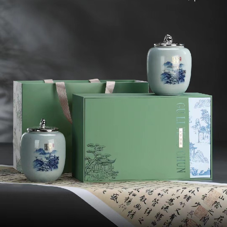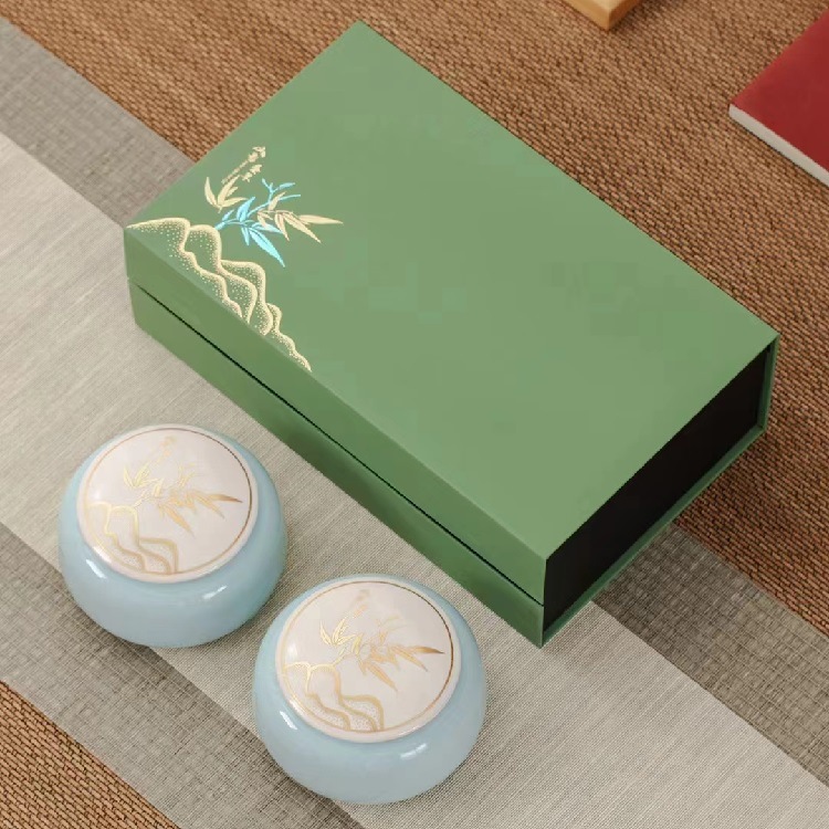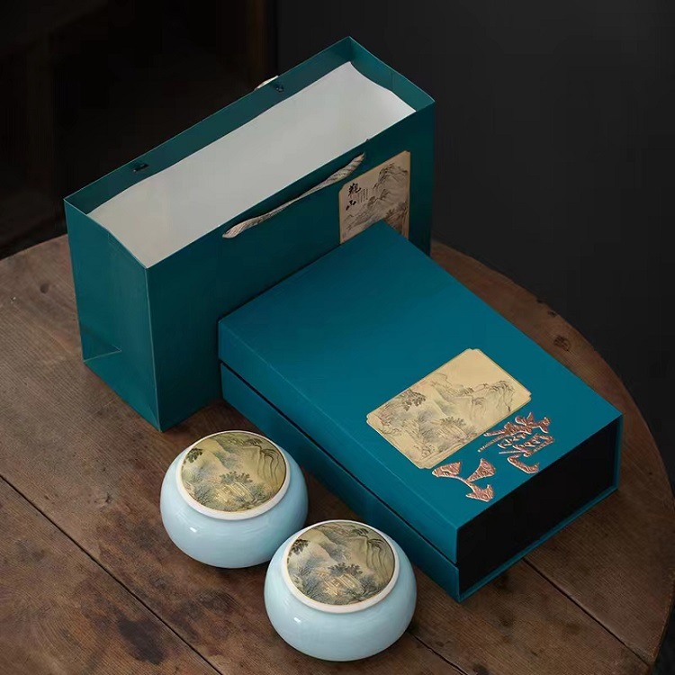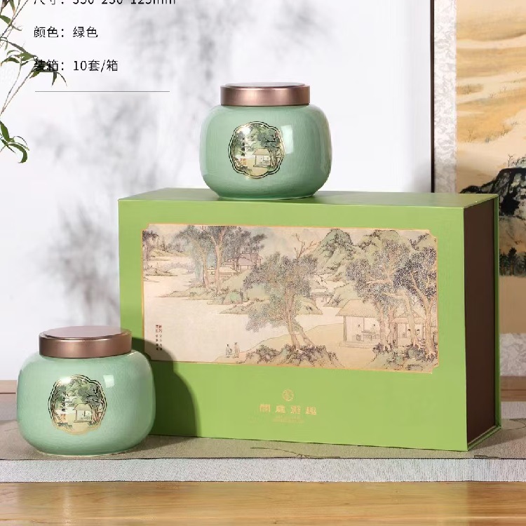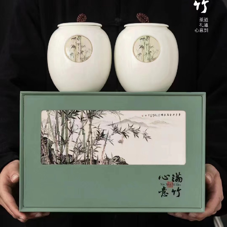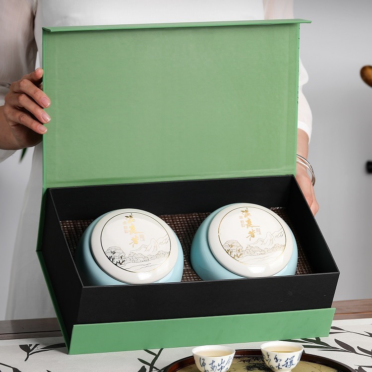 绿茶茶叶盒双瓷装陶瓷茶叶包装木质礼盒绿茶礼盒清新