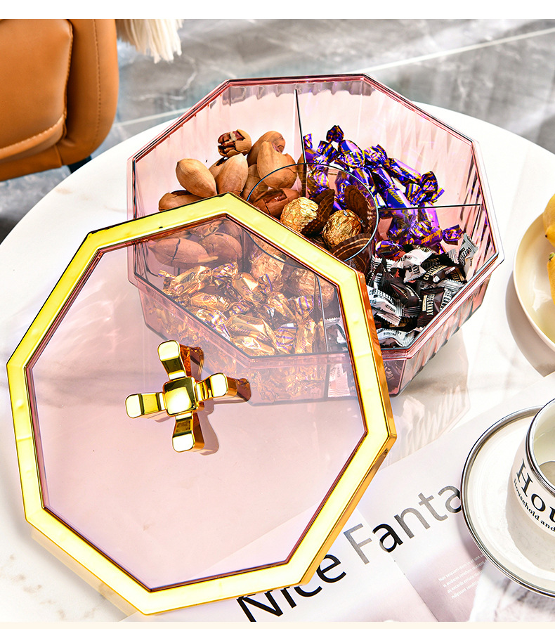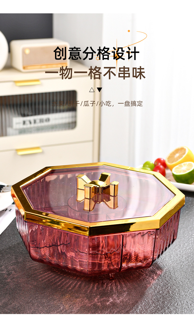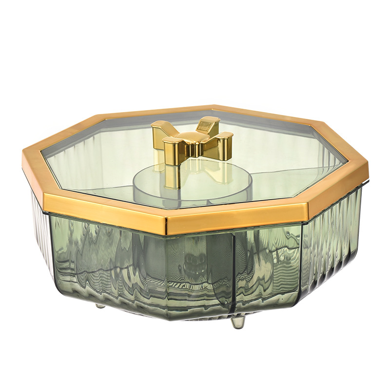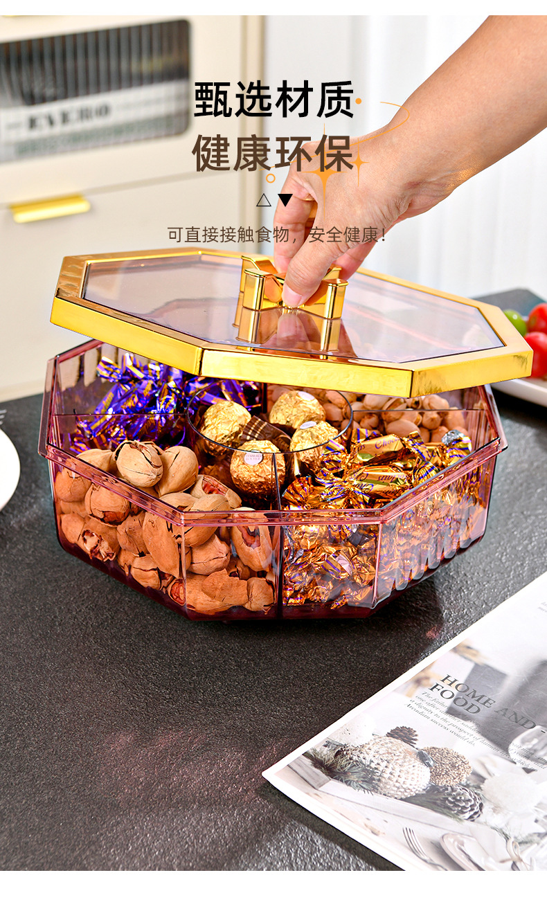 旋转轻奢八角果盒全新PET加大糖果盘加厚带盖五格电镀糖果盒