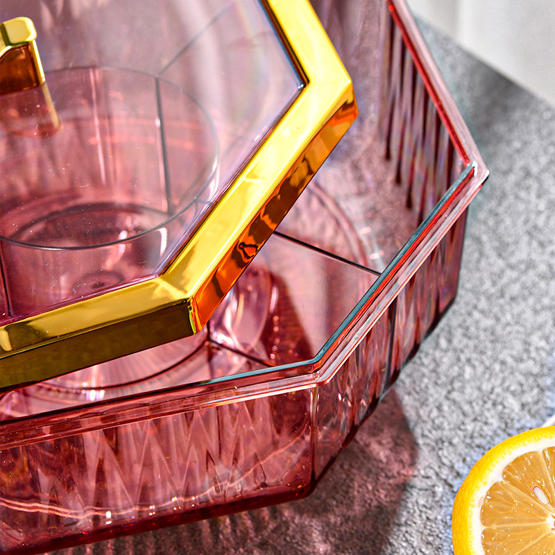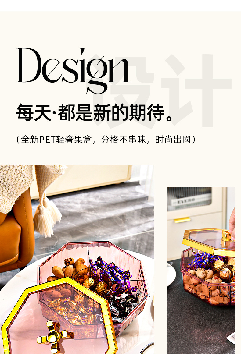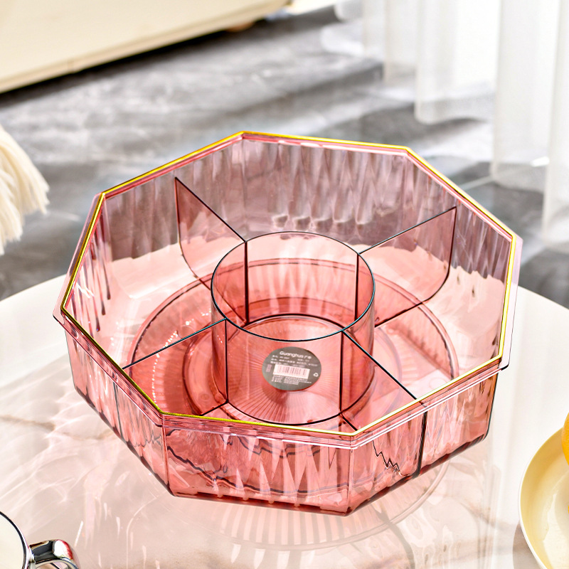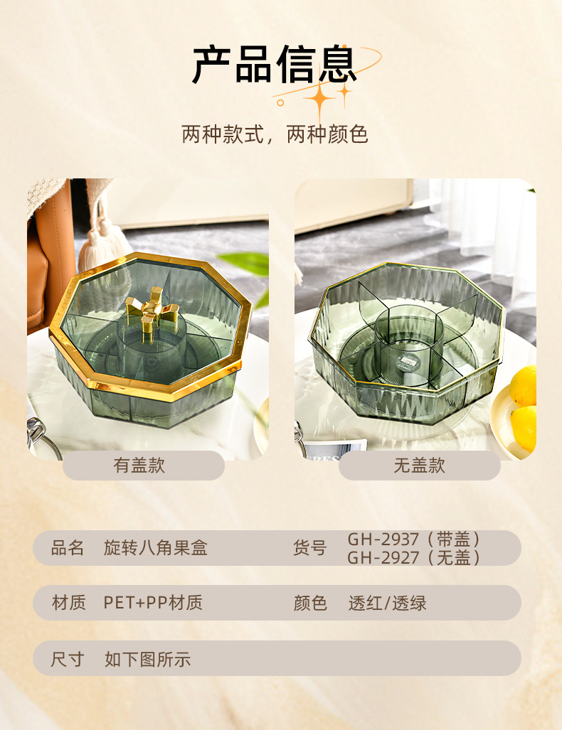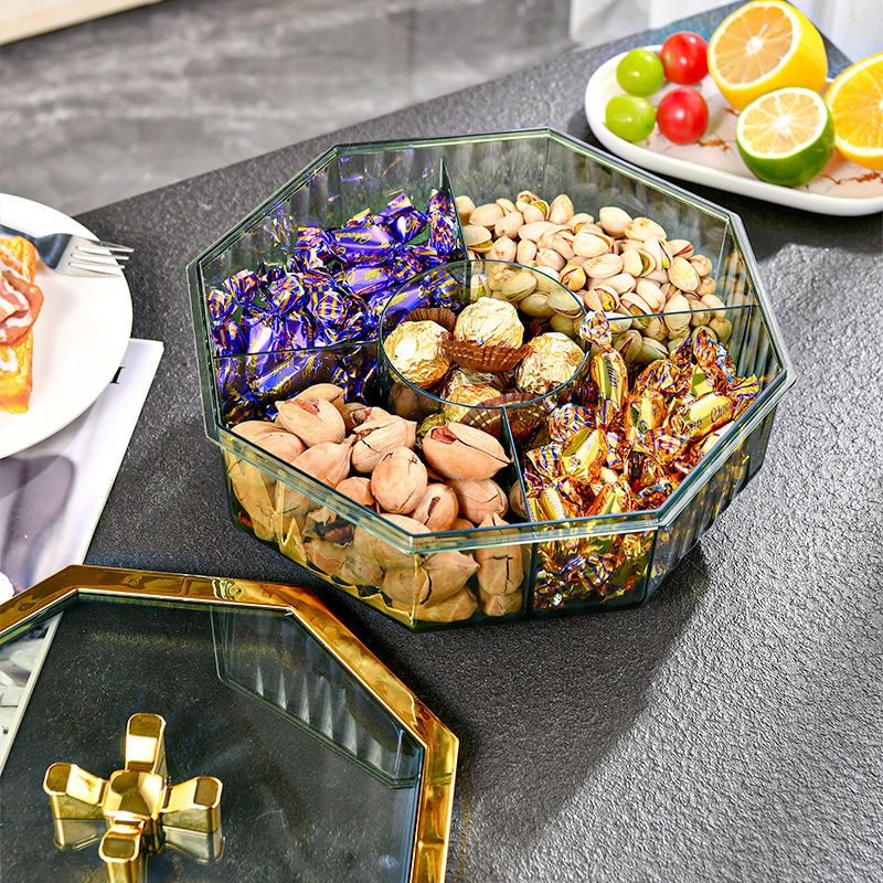 旋转轻奢八角果盒全新PET加大糖果盘加厚带盖五格电镀糖果盒