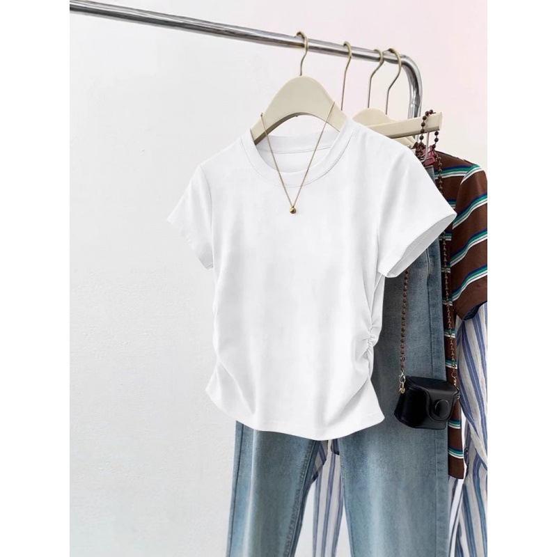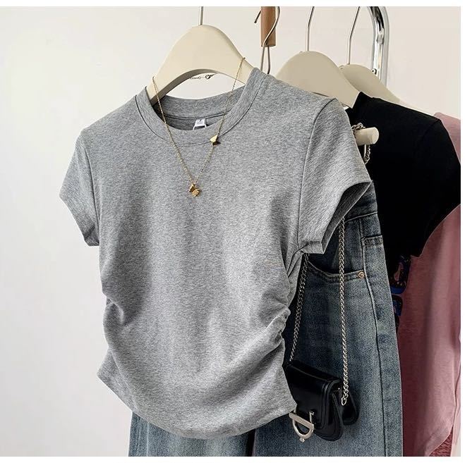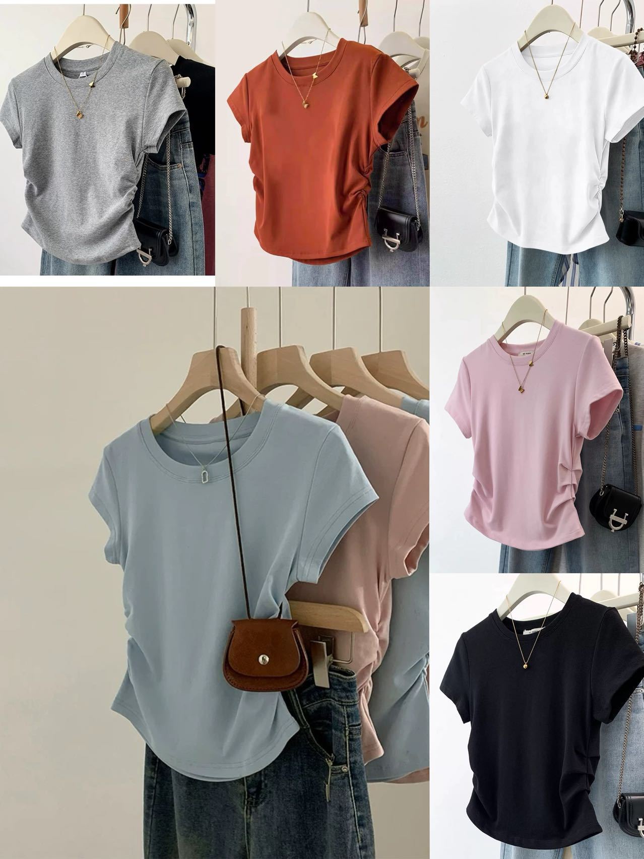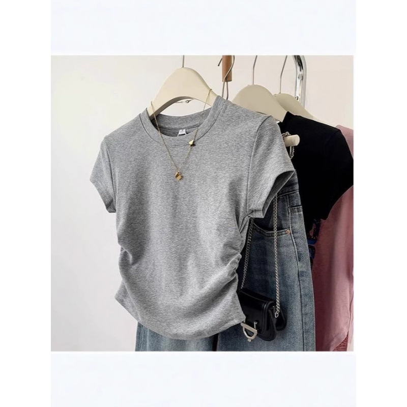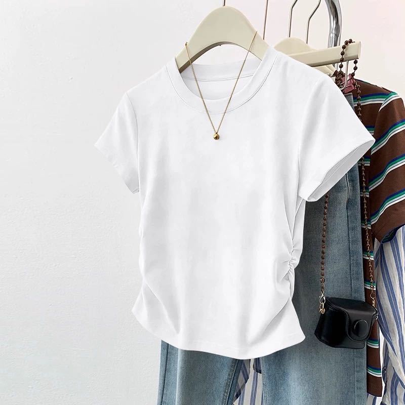 圆领正肩短袖女t恤2025夏新款设计显瘦套头褶皱百搭短款打底上衣