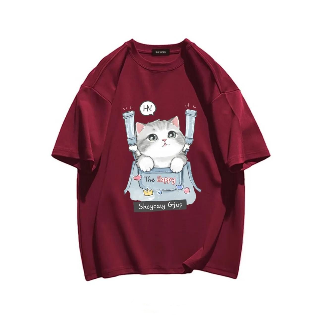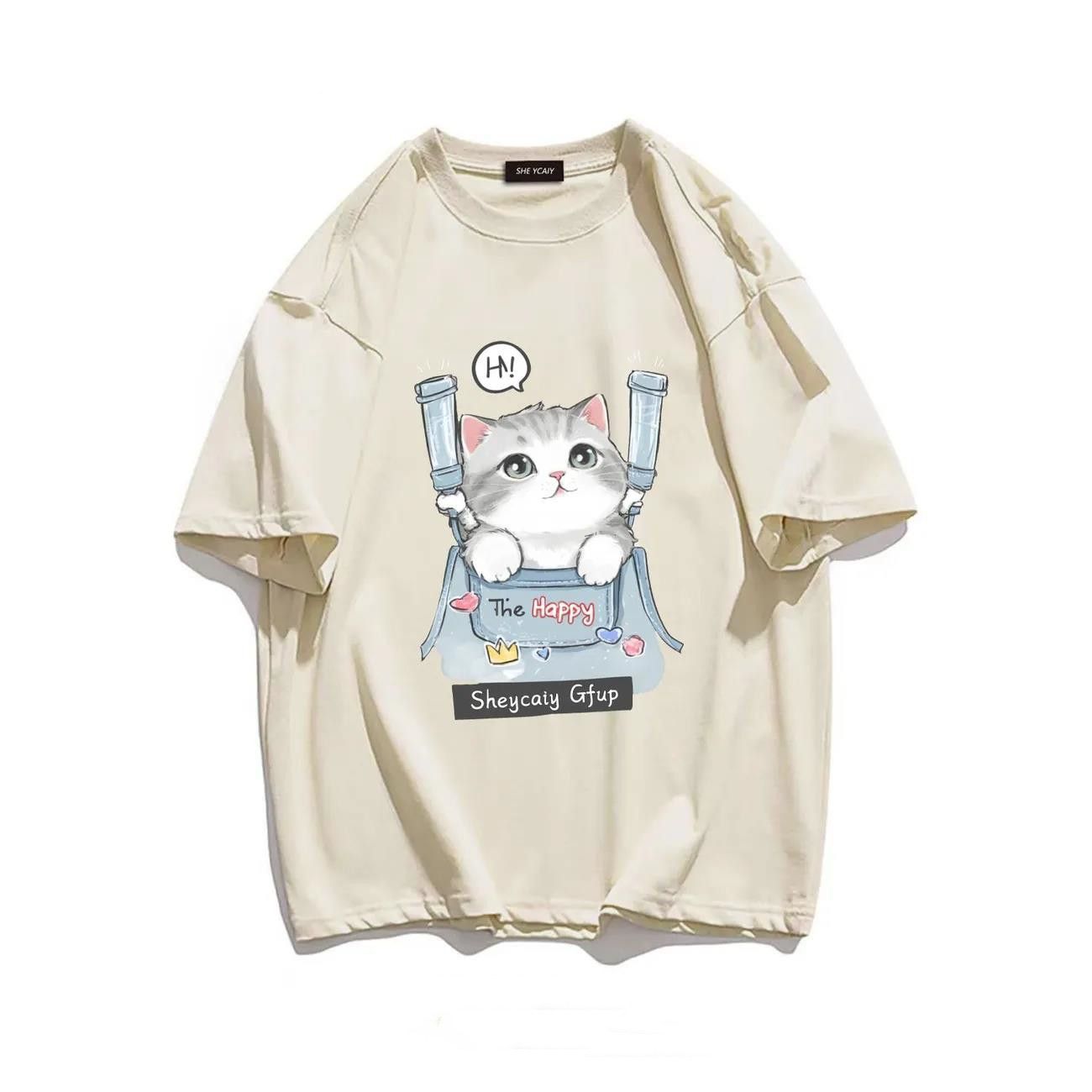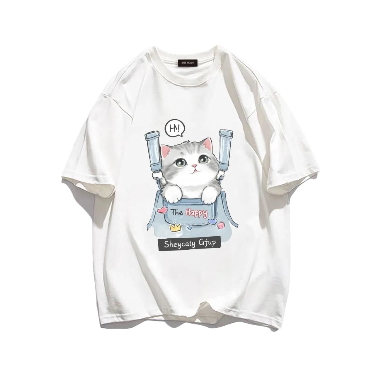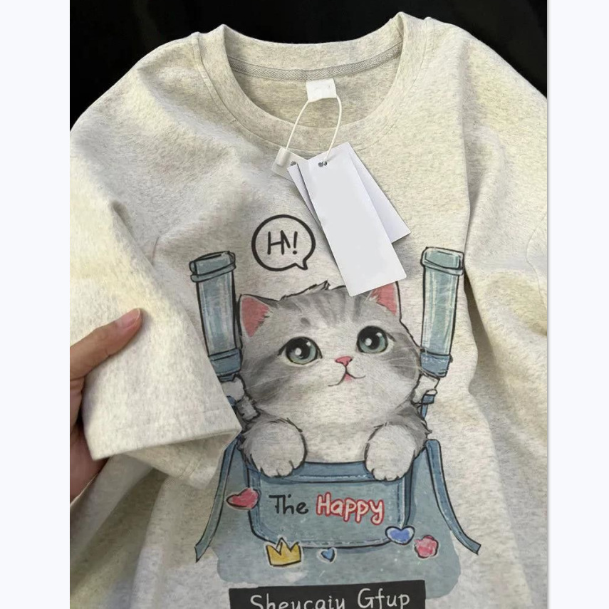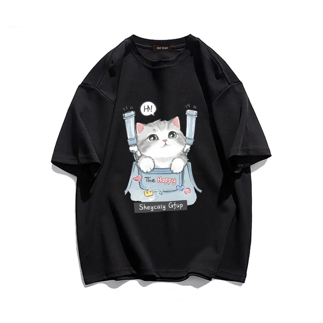 100%纯棉美式短袖T恤女夏季宽松设计新款复古ins日系猫咪上衣潮男