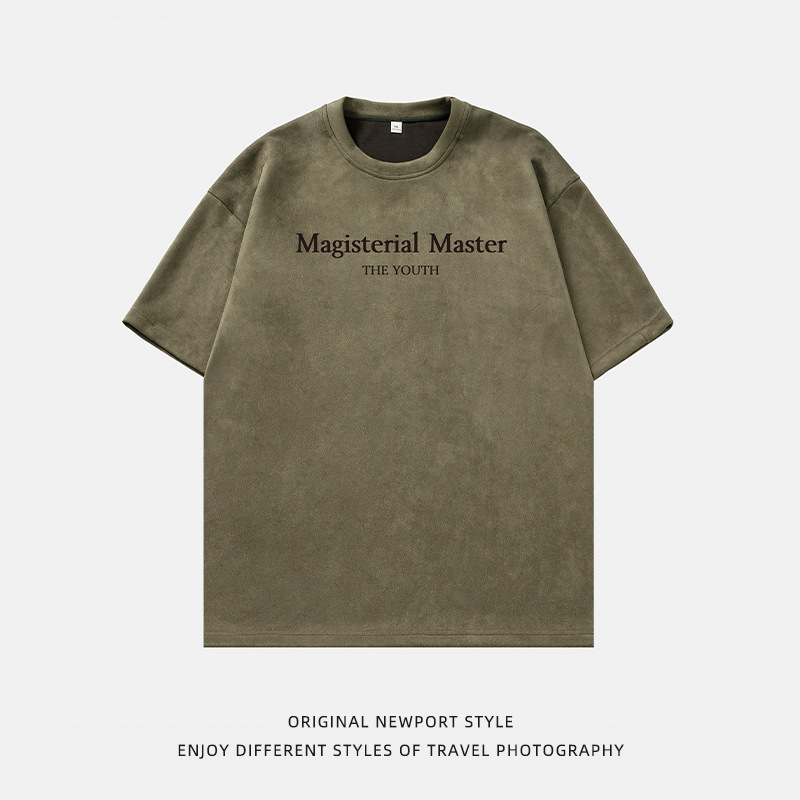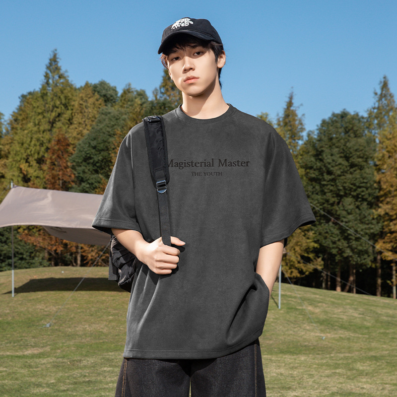 麂皮质感短袖T恤男夏季新款美式潮牌字母印花情侣宽松半袖体恤衫