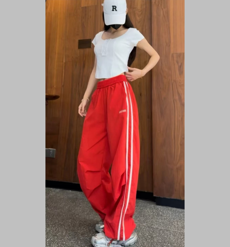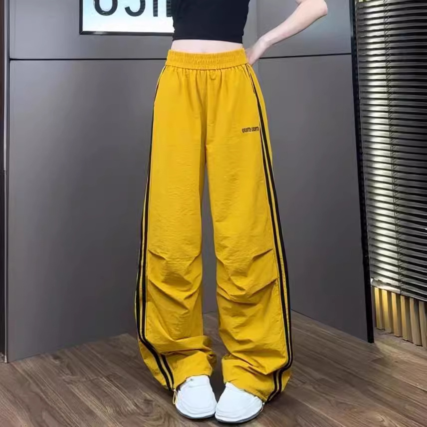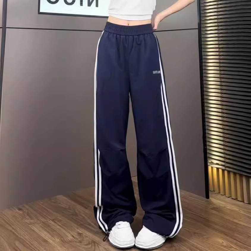 美式高街条纹速干阔腿运动裤女夏季新款宽松显瘦休闲工装长裤
