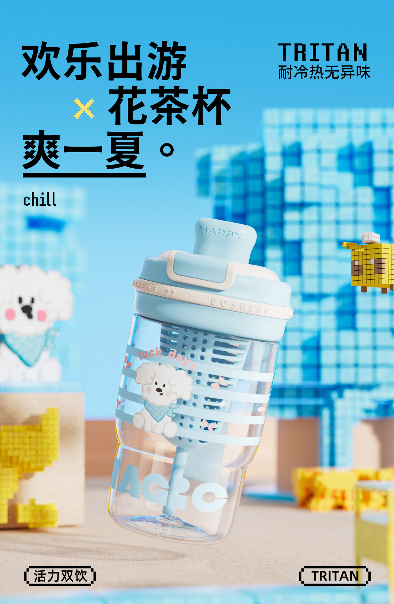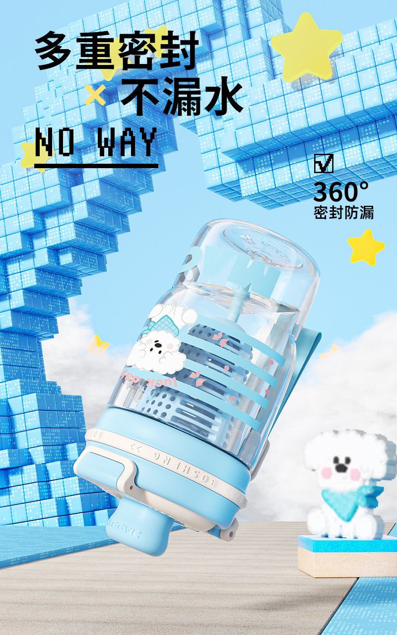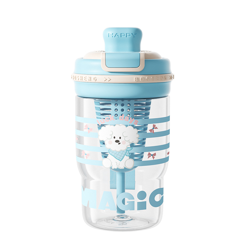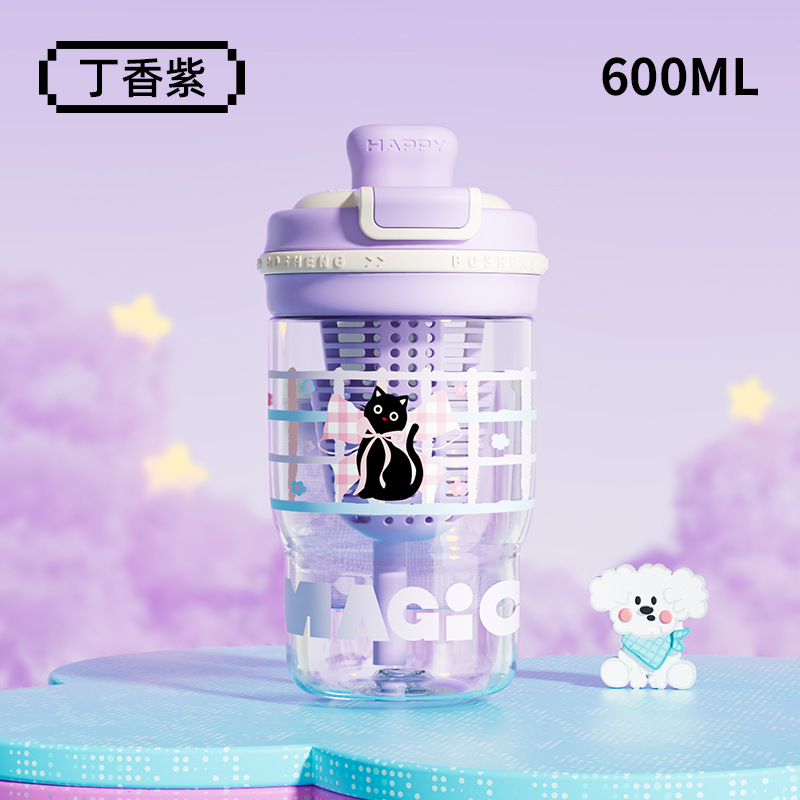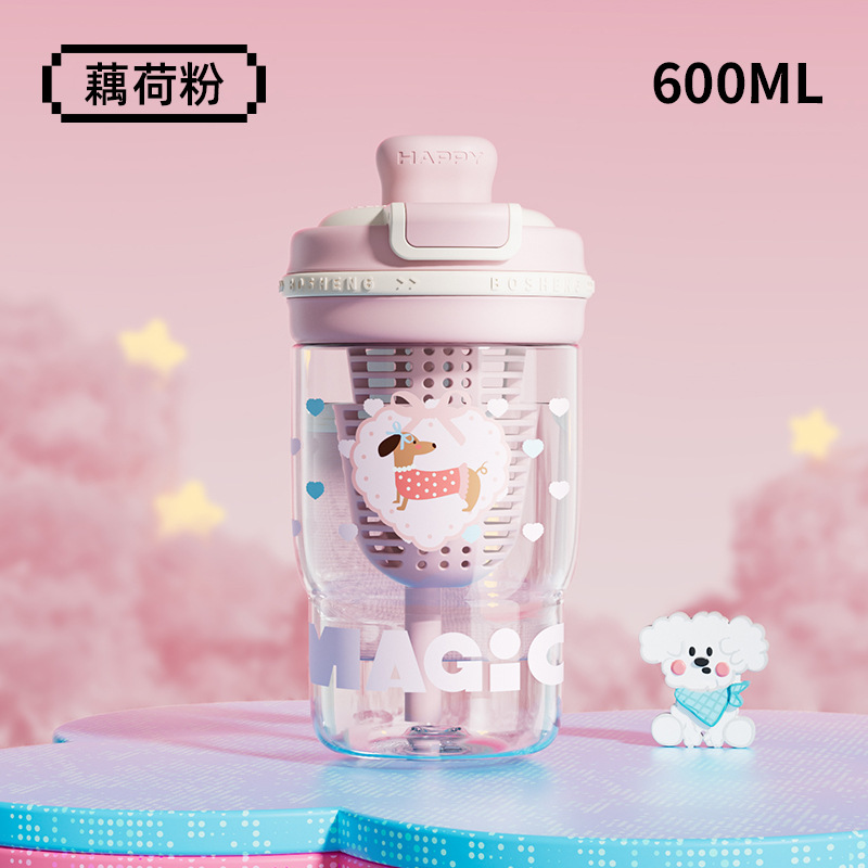 卡通青麦塑料杯携带方便吸丝印设计自带茶隔一杯双饮大容量饮水杯