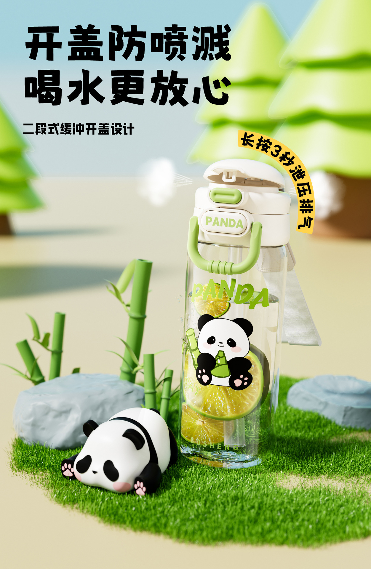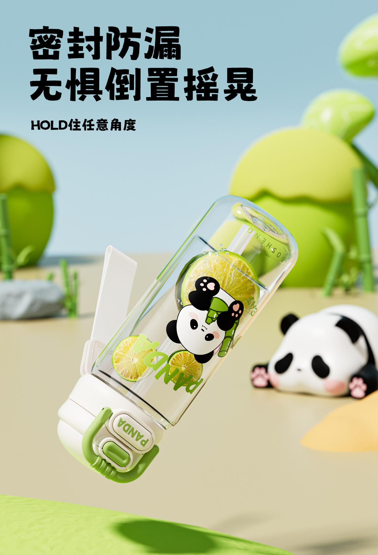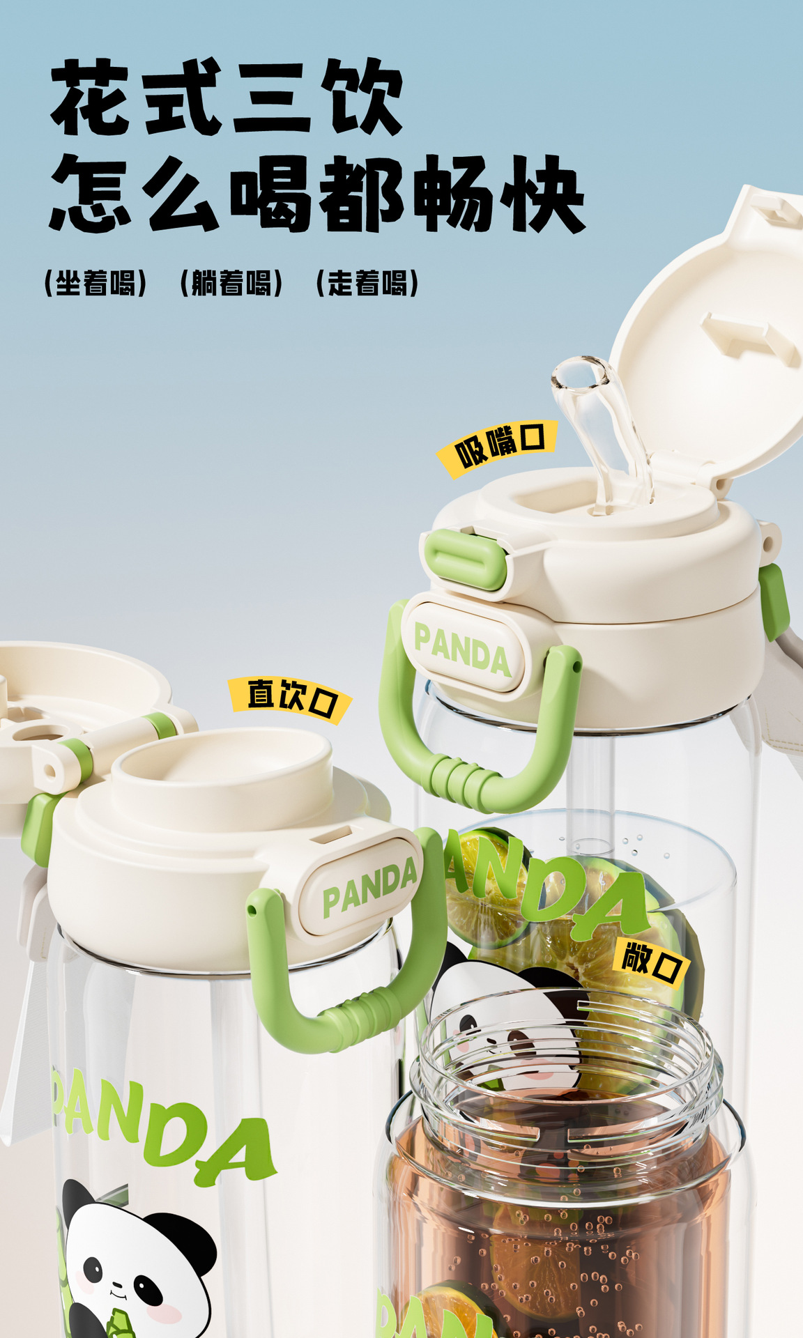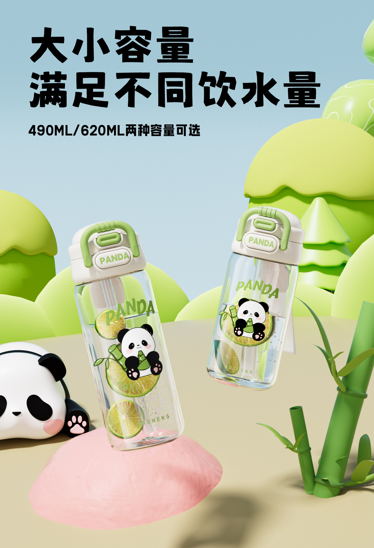 星羡大小号塑料杯熊猫款双饮杯自带杯体方便携带锁扣设计饮水杯