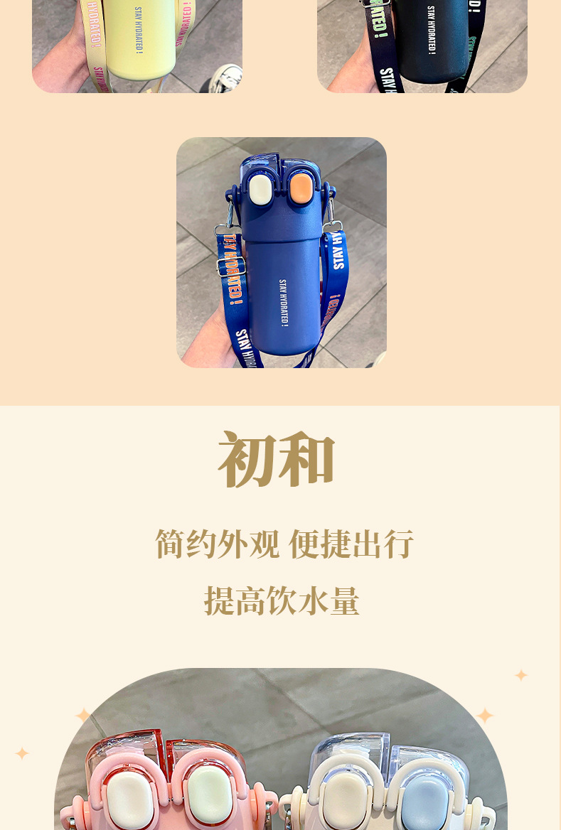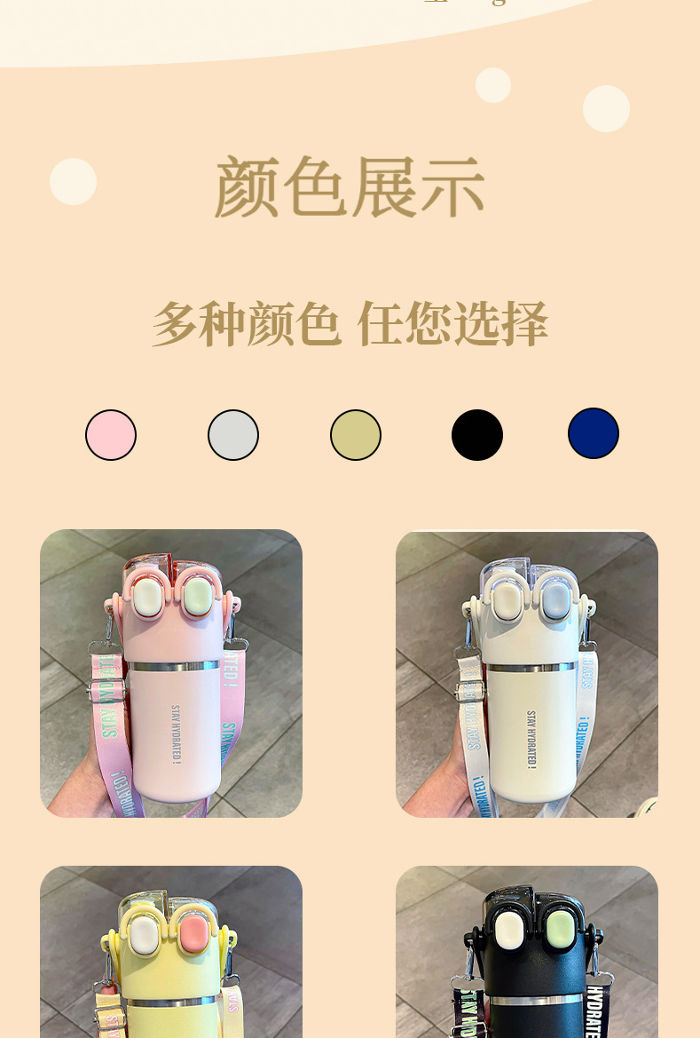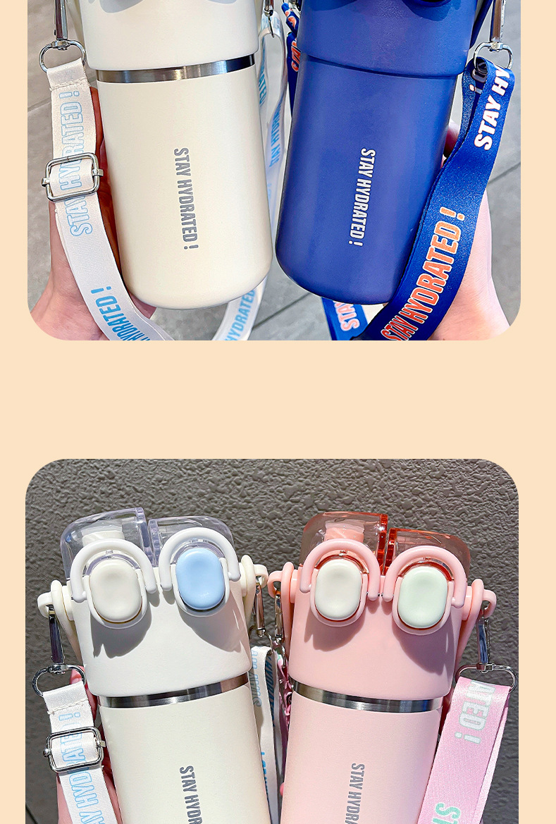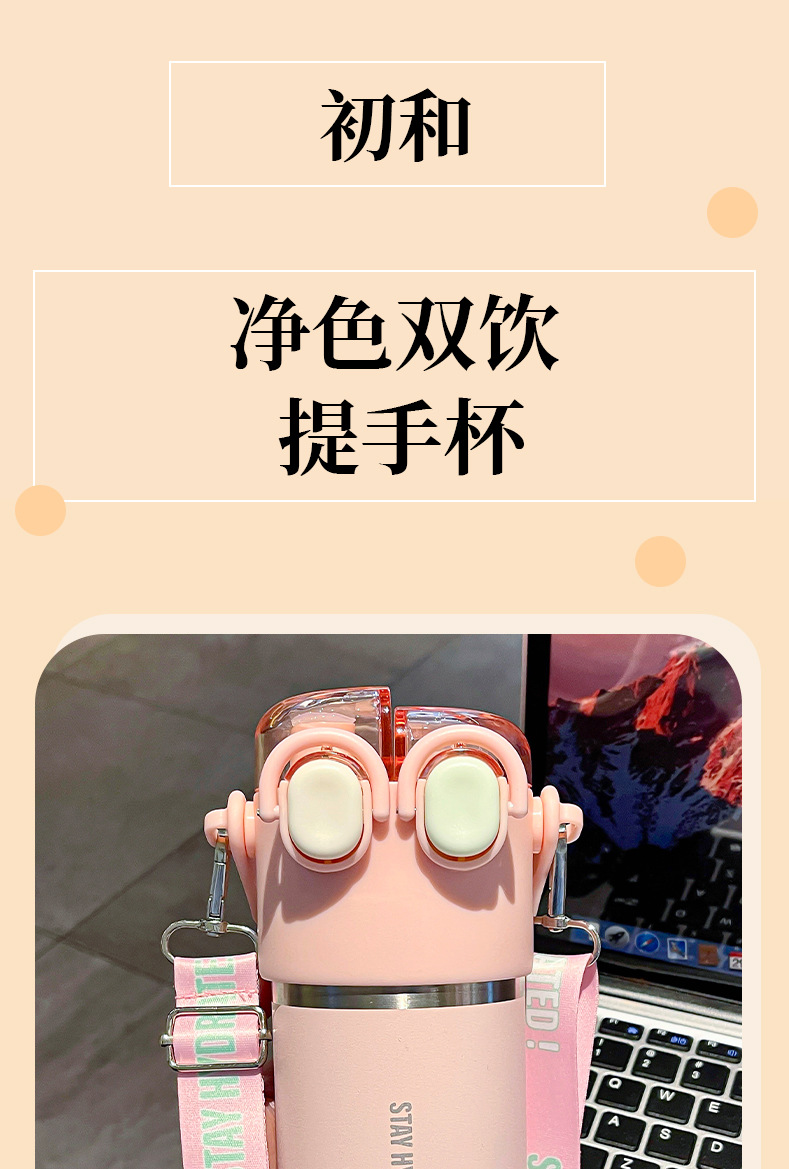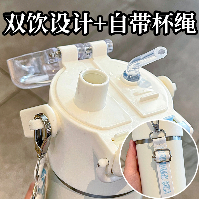 简约字母净色双饮提手杯大容量便携吸管锁扣饮水杯自带提绳保温杯