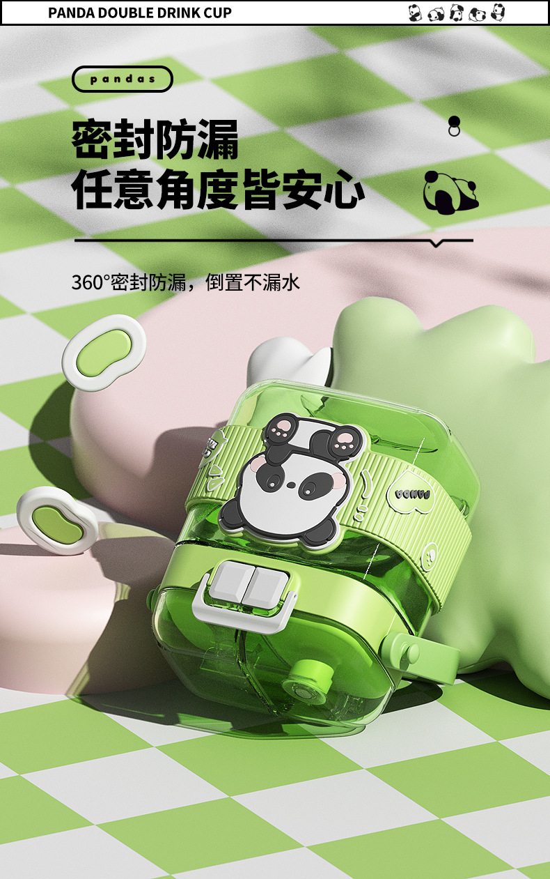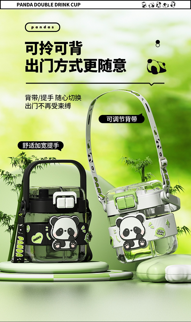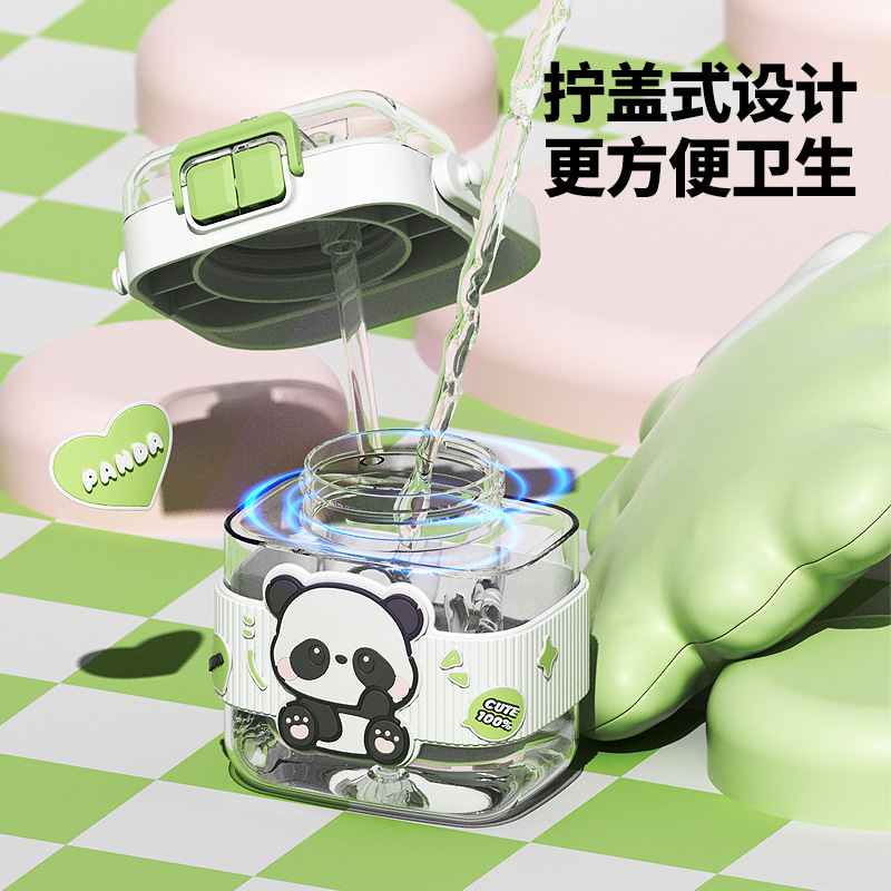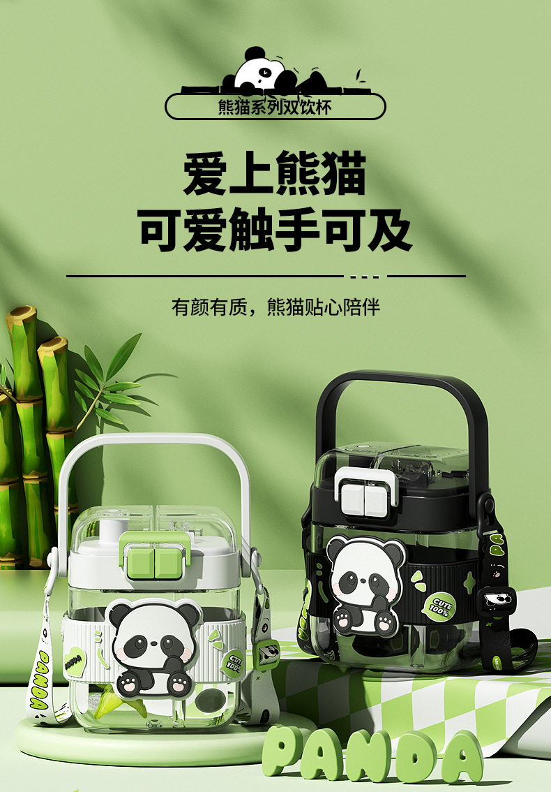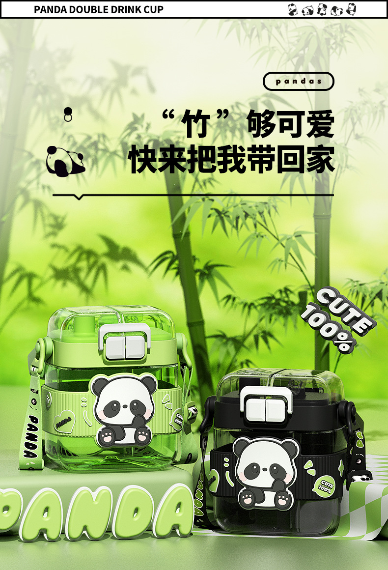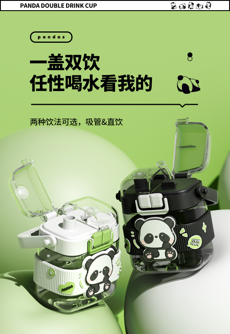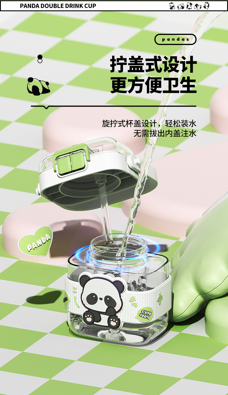 简约方形塑料水杯卡通熊猫吸管杯可爱学生饮水杯便携随身双饮杯子
