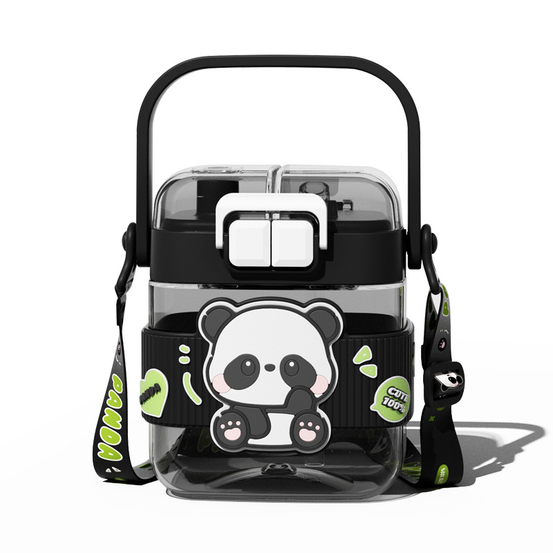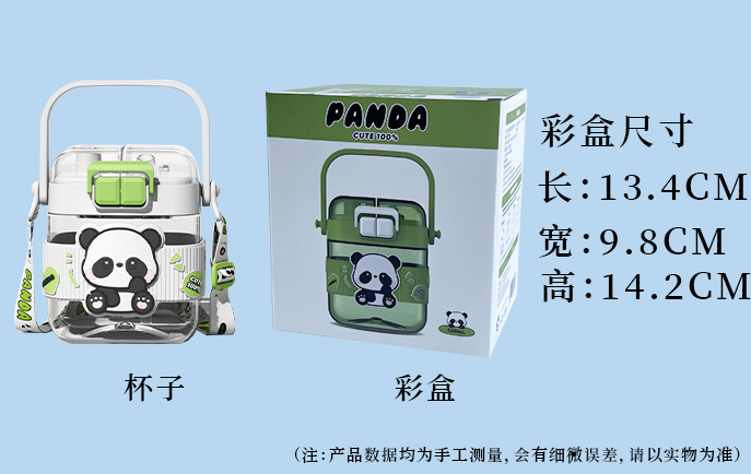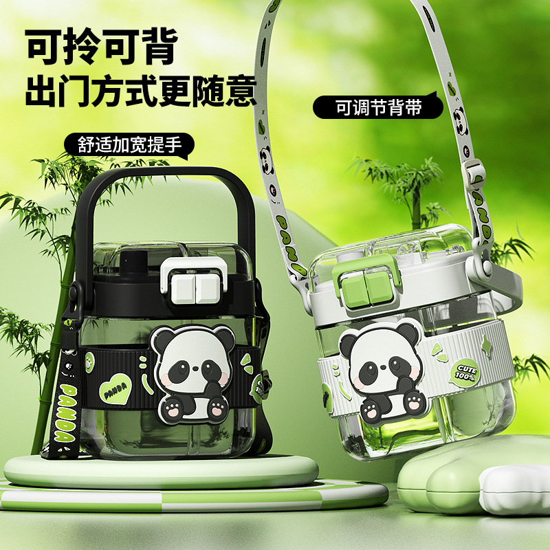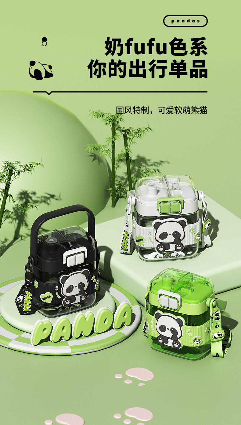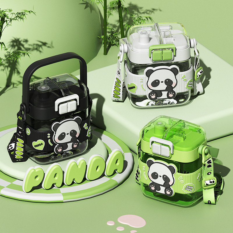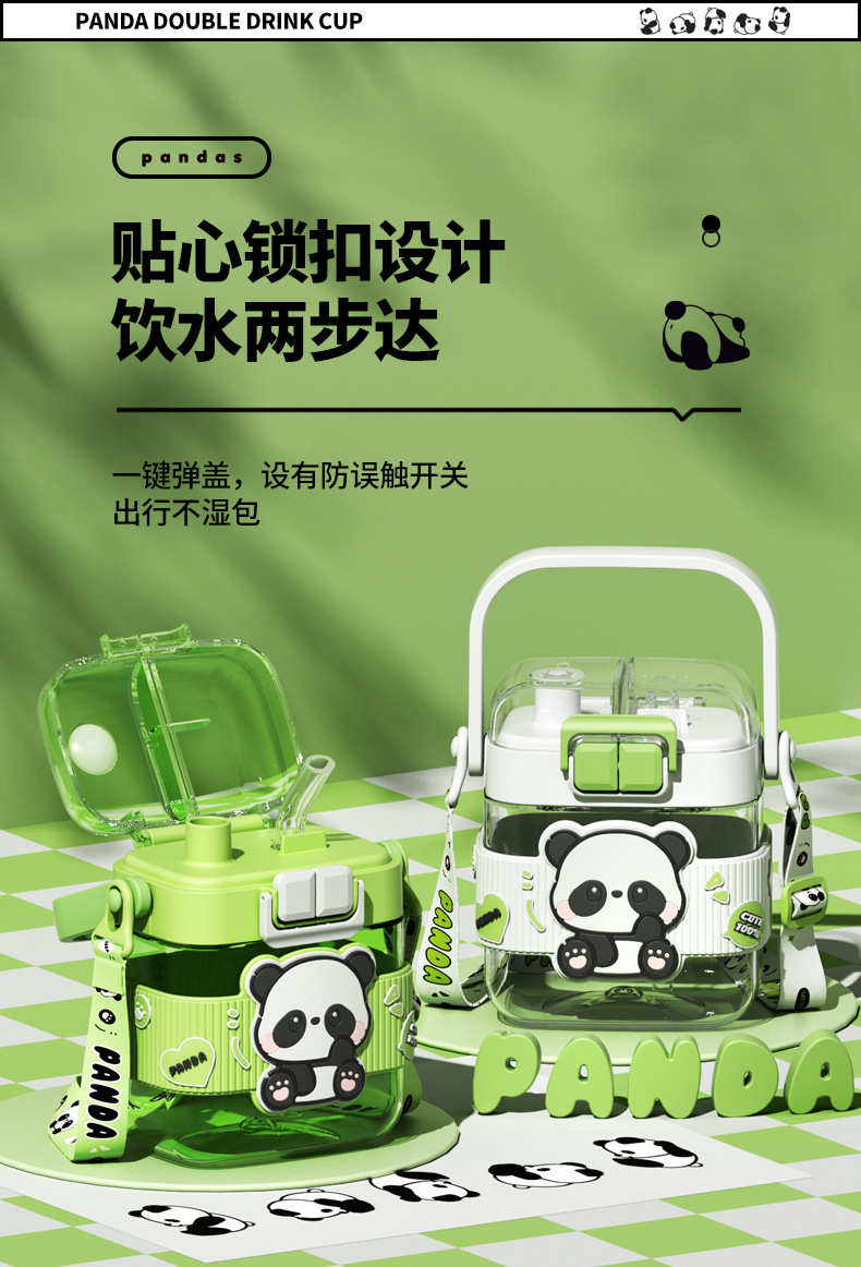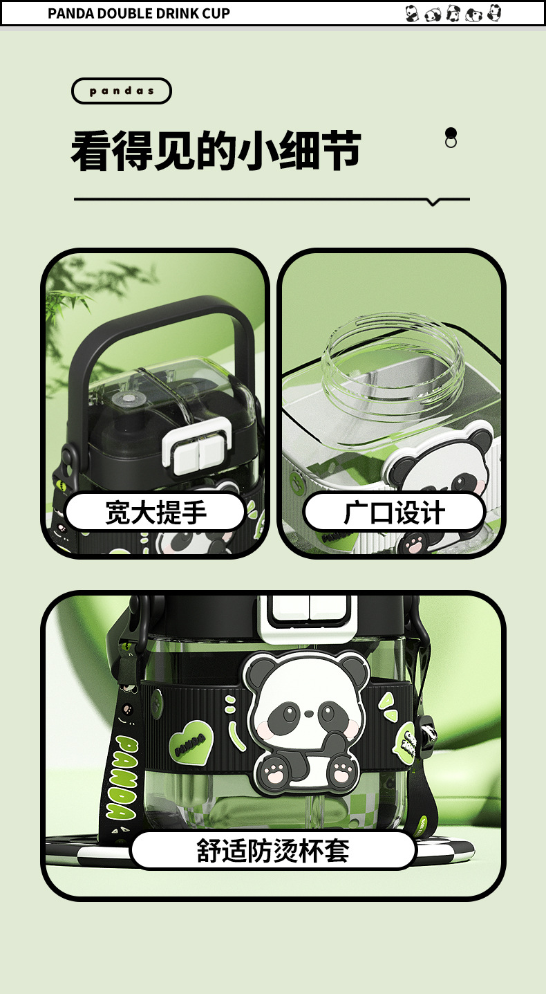 简约方形塑料水杯卡通熊猫吸管杯可爱学生饮水杯便携随身双饮杯子
