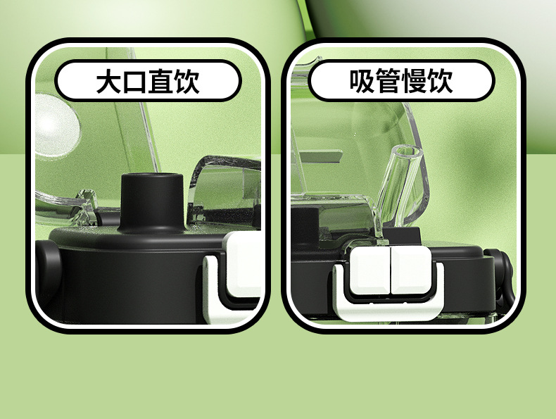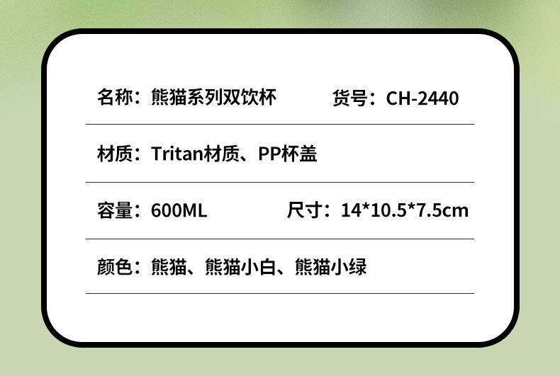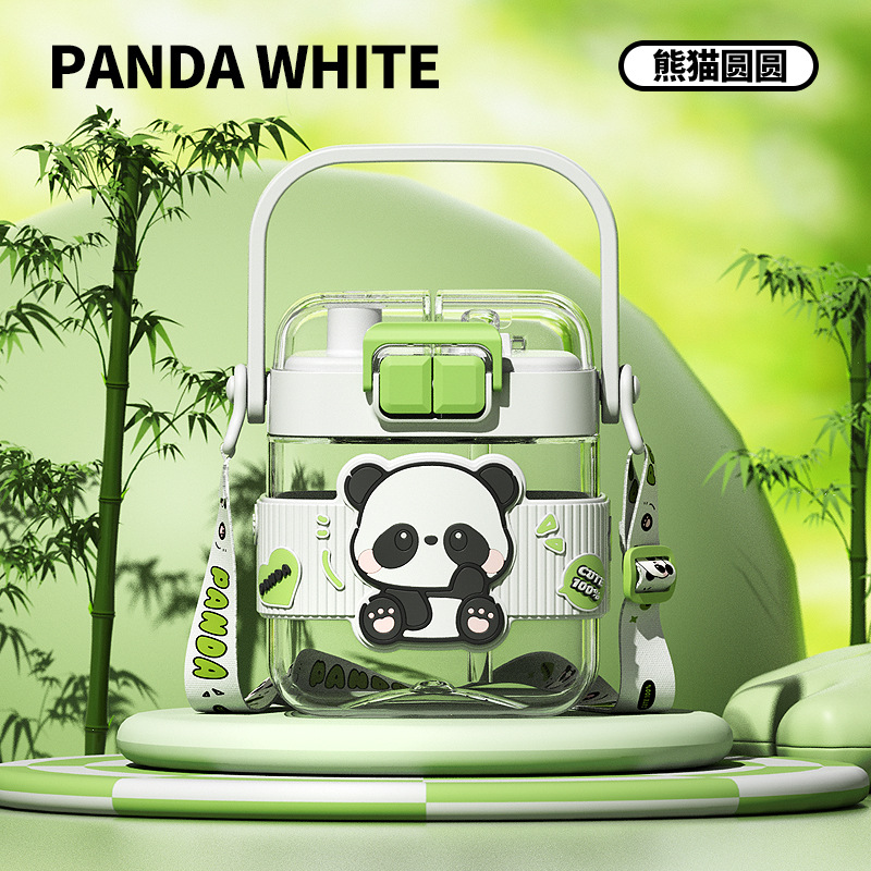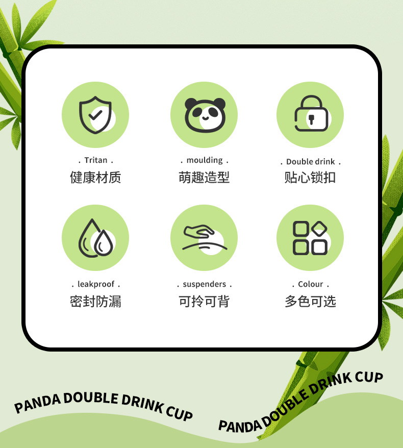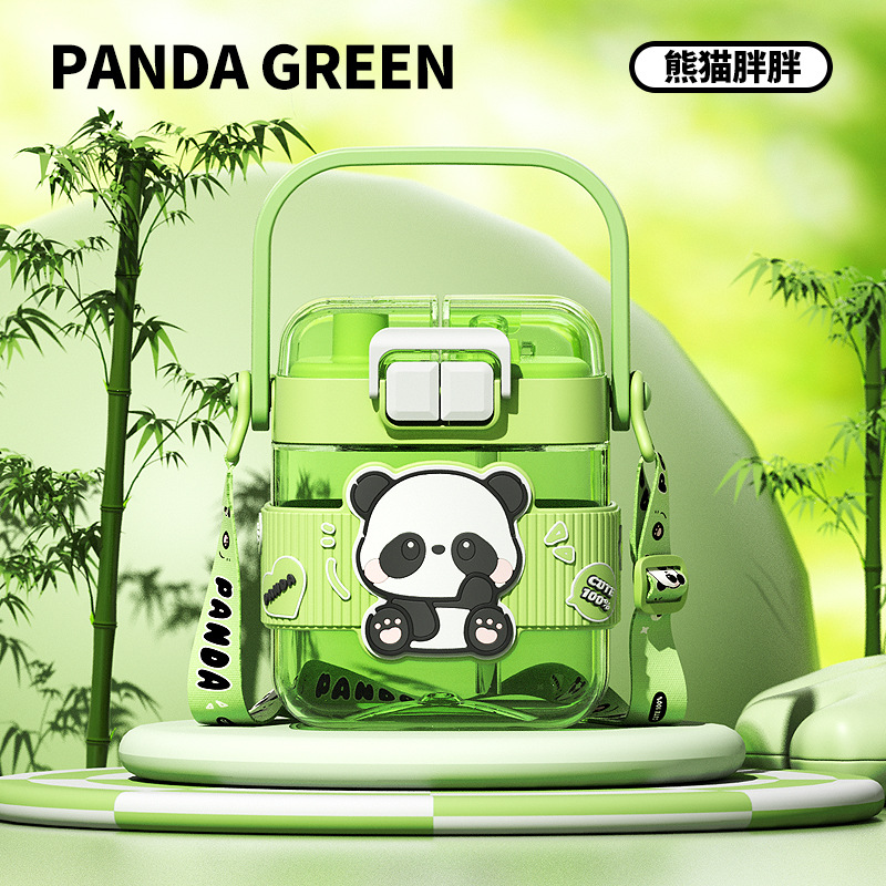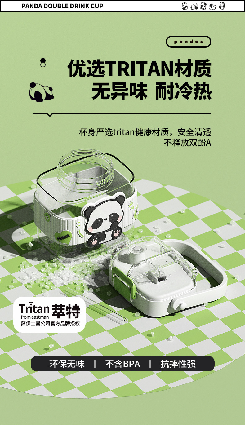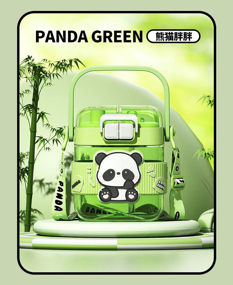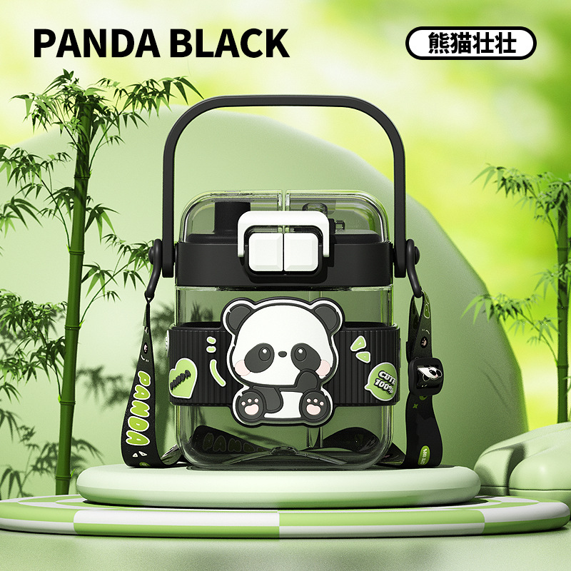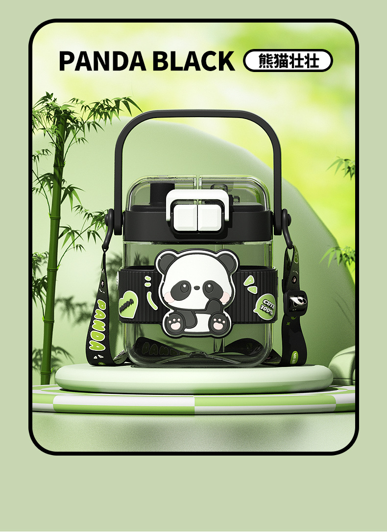 简约方形塑料水杯卡通熊猫吸管杯可爱学生饮水杯便携随身双饮杯子