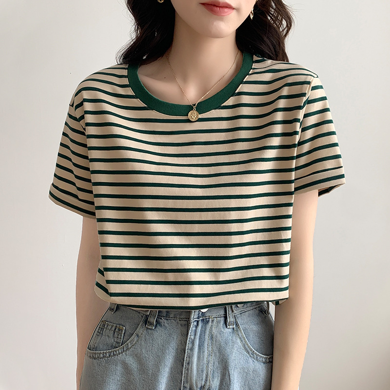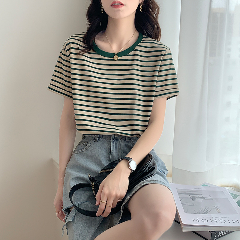 清新绿色条纹T恤女夏季短袖2025新款宽松圆领百搭体恤小众上衣服