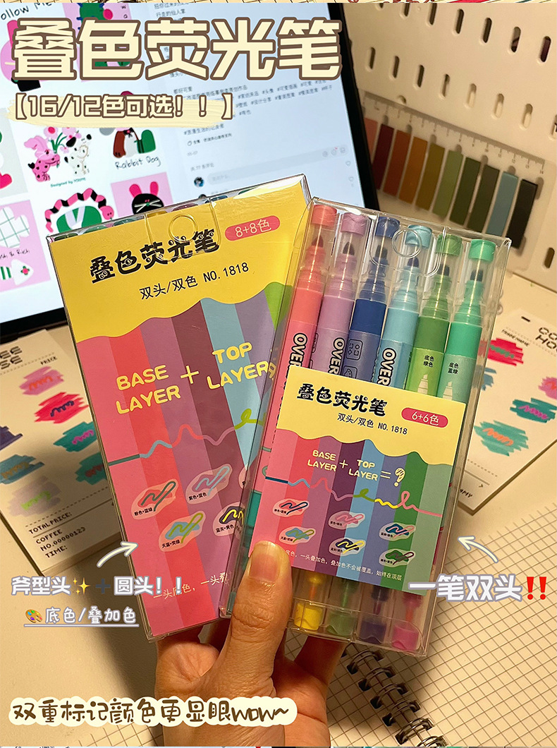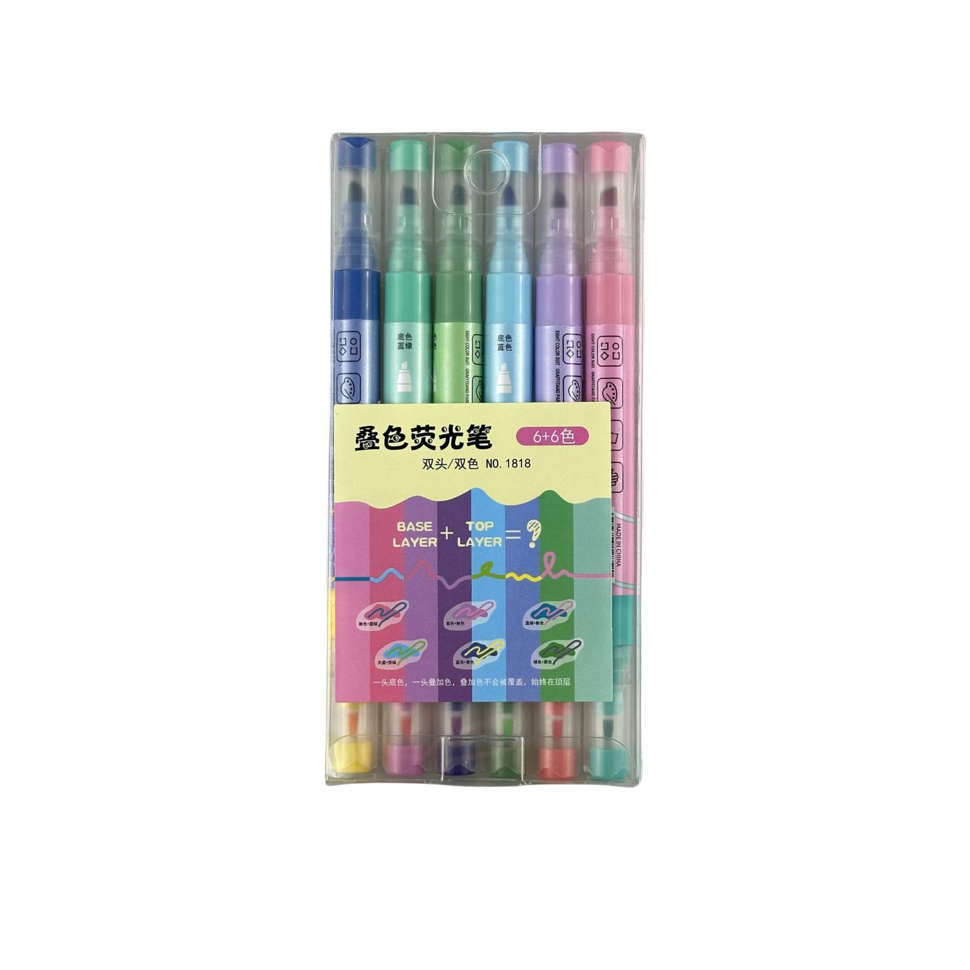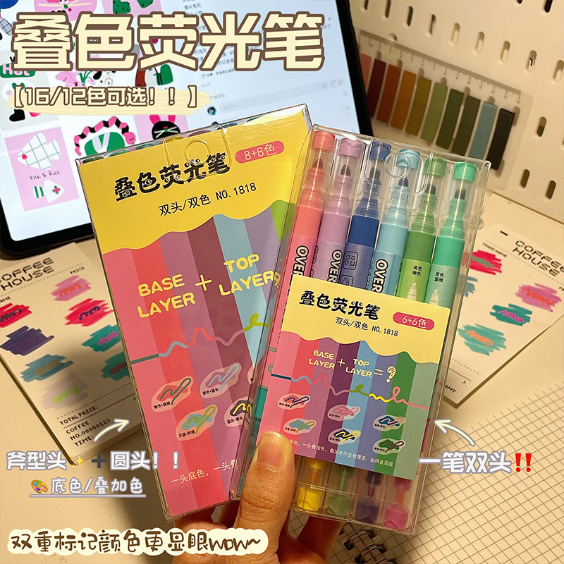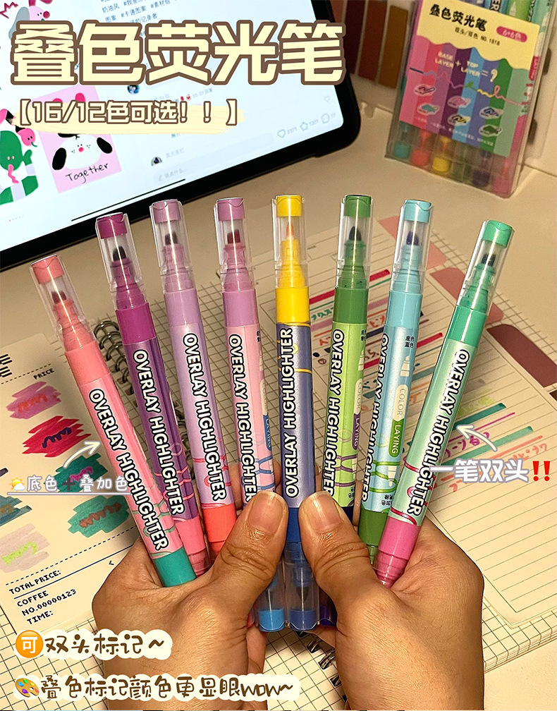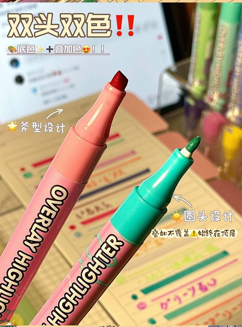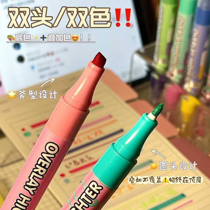 新款双头叠色荧光笔不晕色学生标记笔记号笔手账笔12色套装