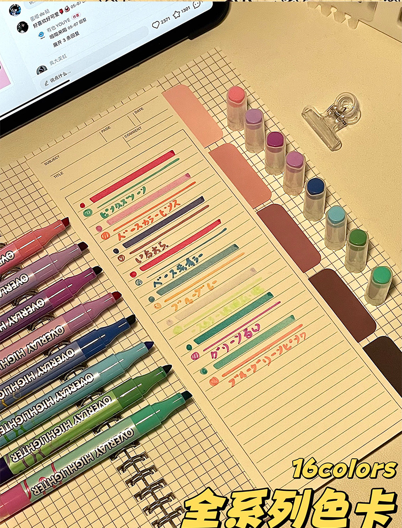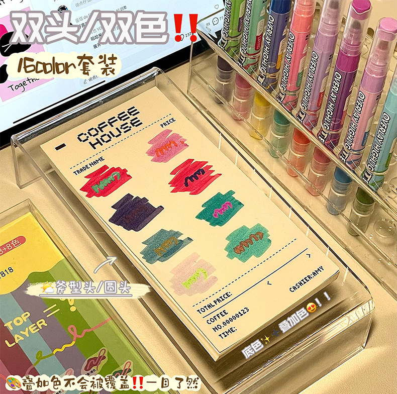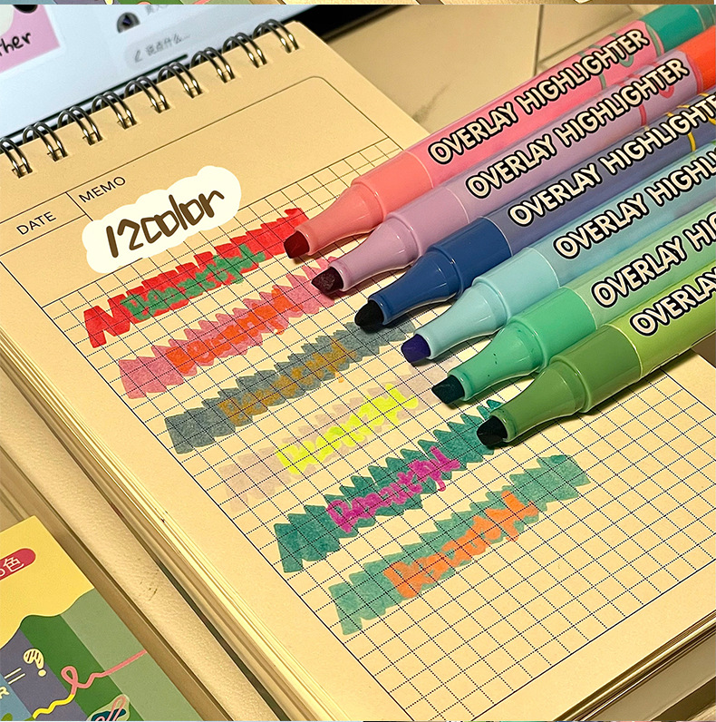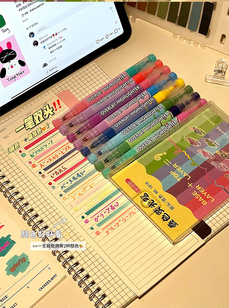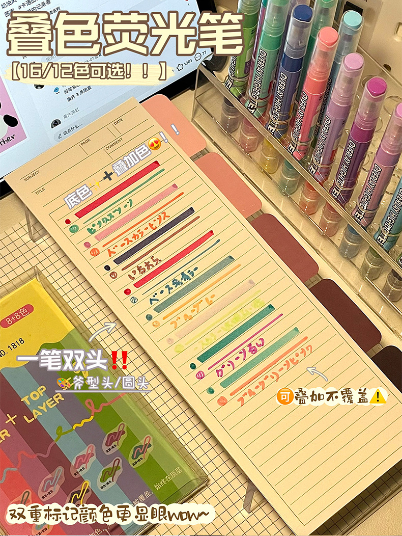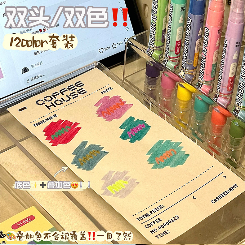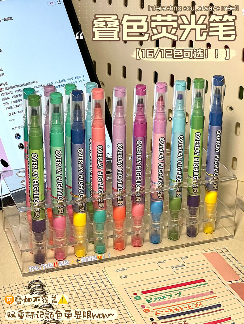 新款双头叠色荧光笔不晕色学生标记笔记号笔手账笔12色套装