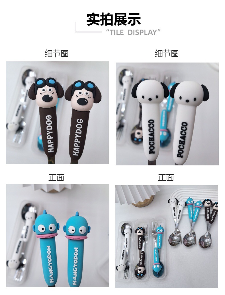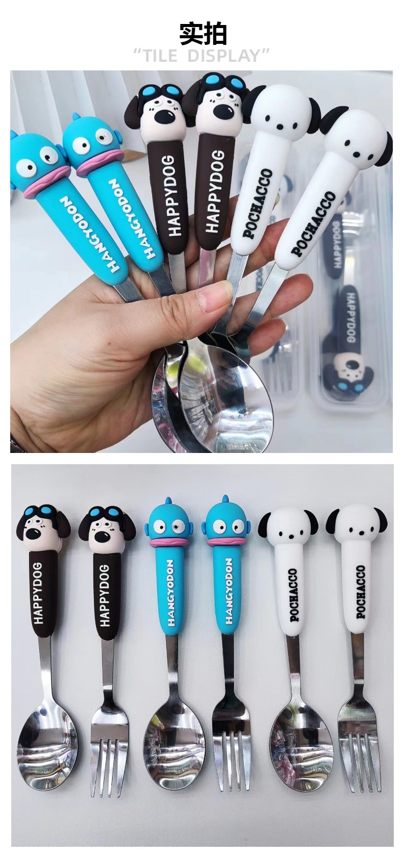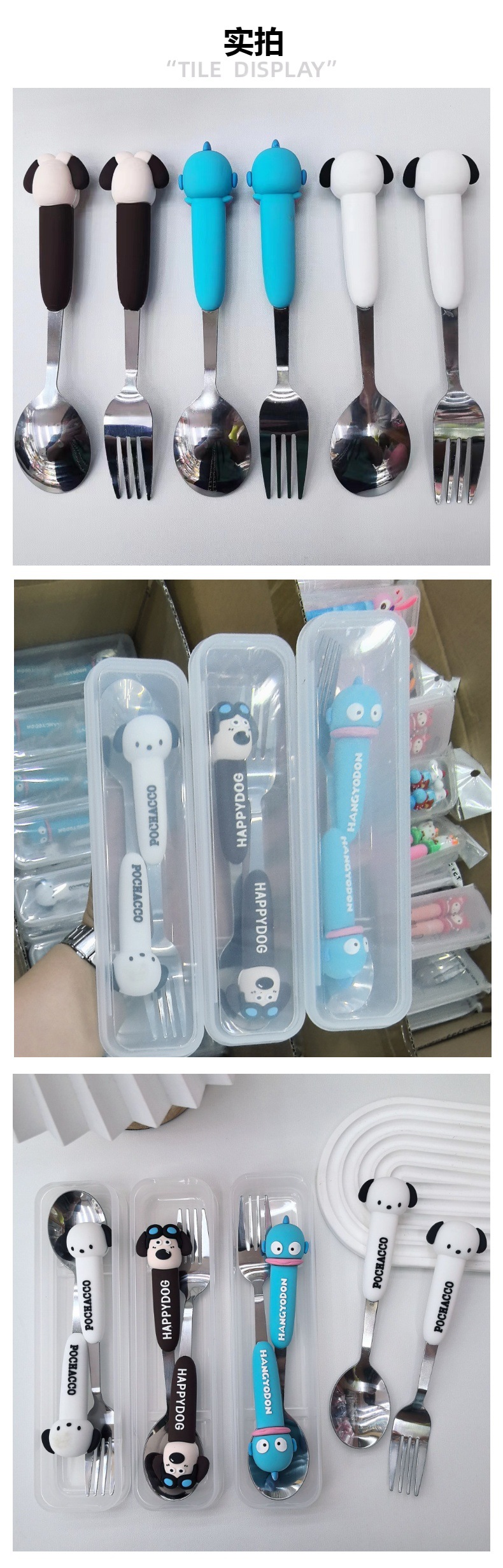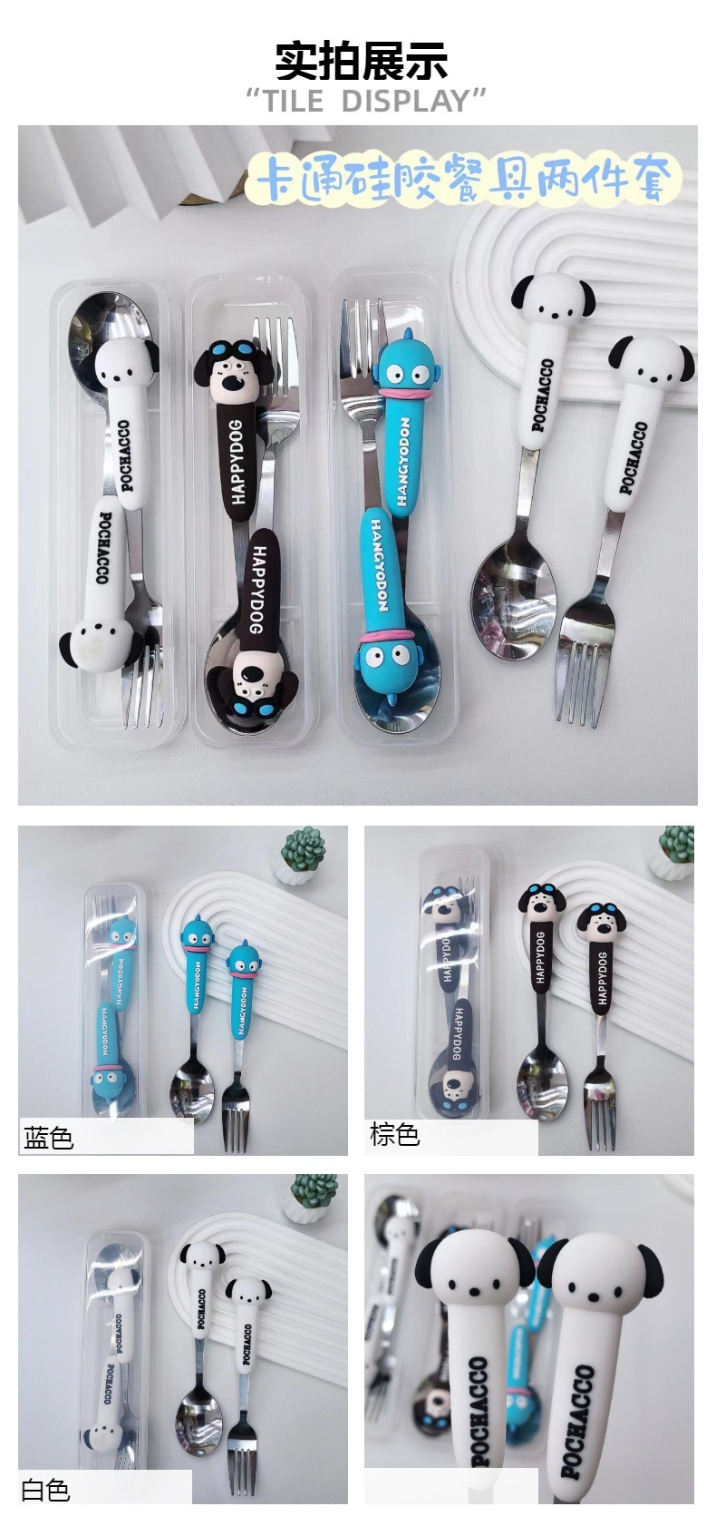 新款可爱卡通便携餐具二件套装不锈钢汤勺叉子勺子硅胶手柄帕恰狗