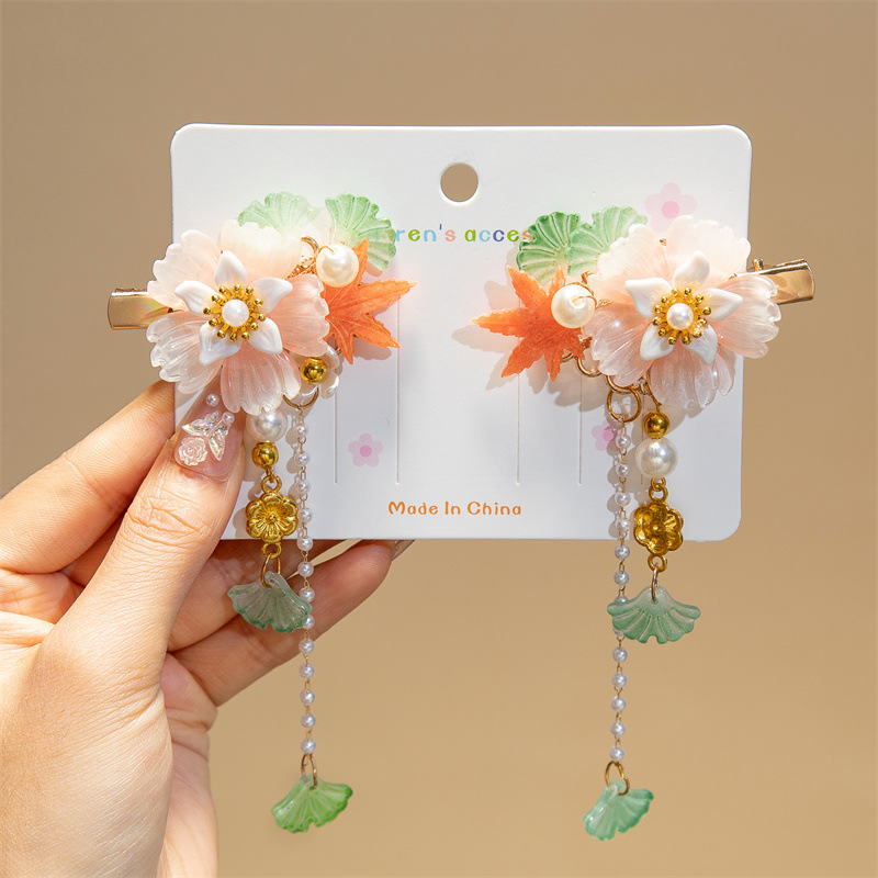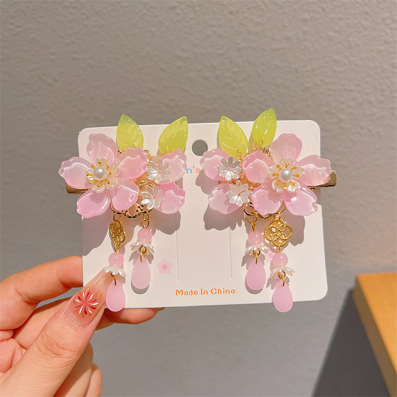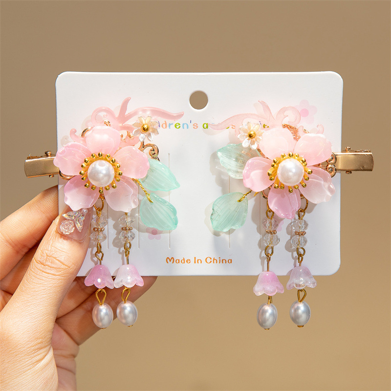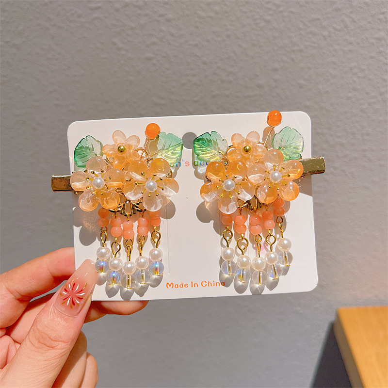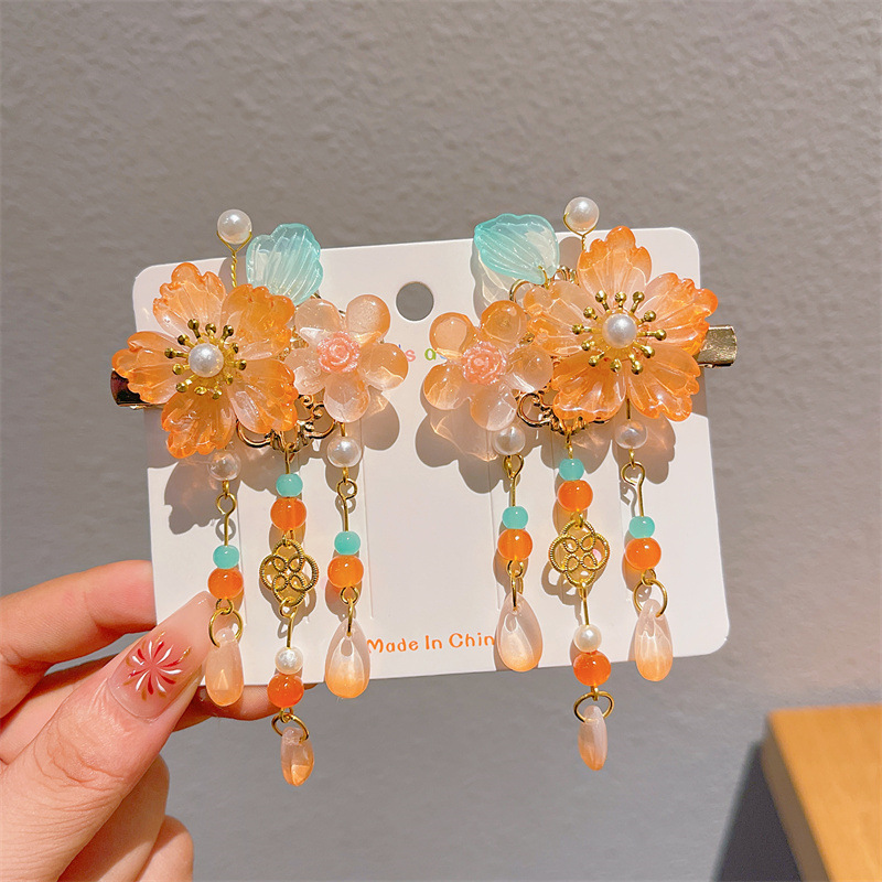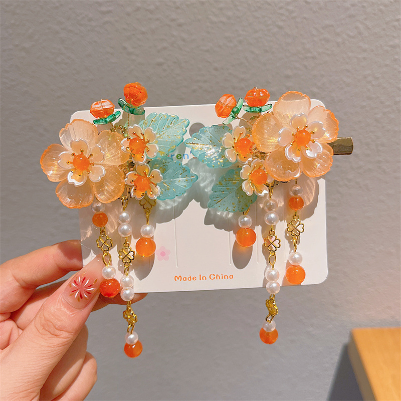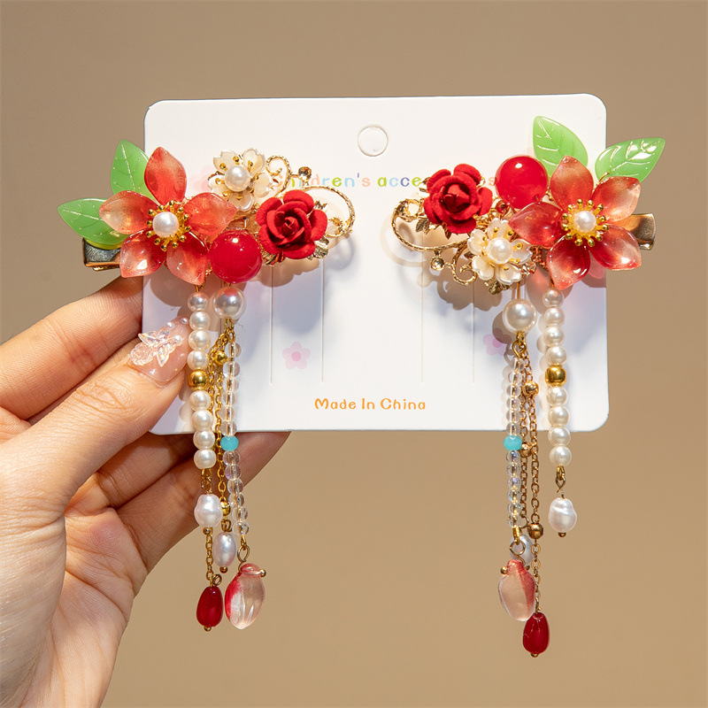 儿童红色琉璃发饰女童古风花朵发卡汉服喜庆发夹子古装边夹发夹女