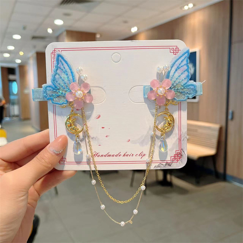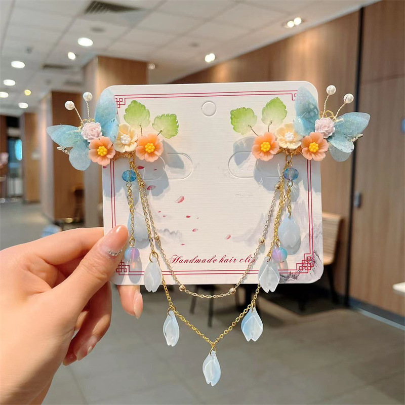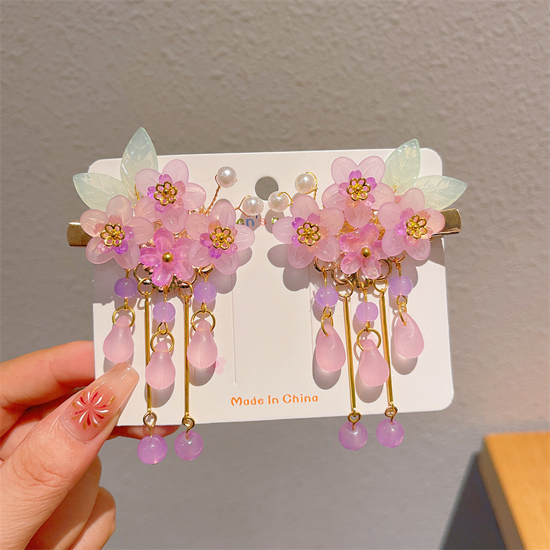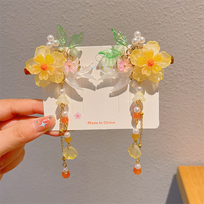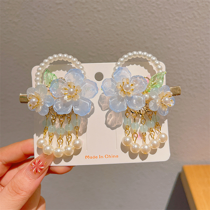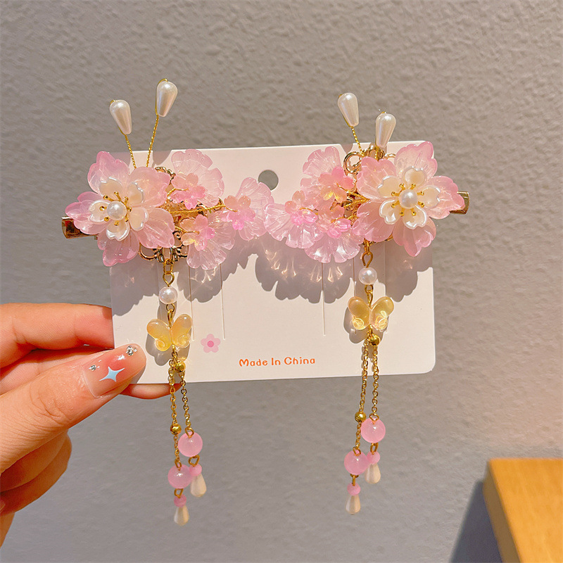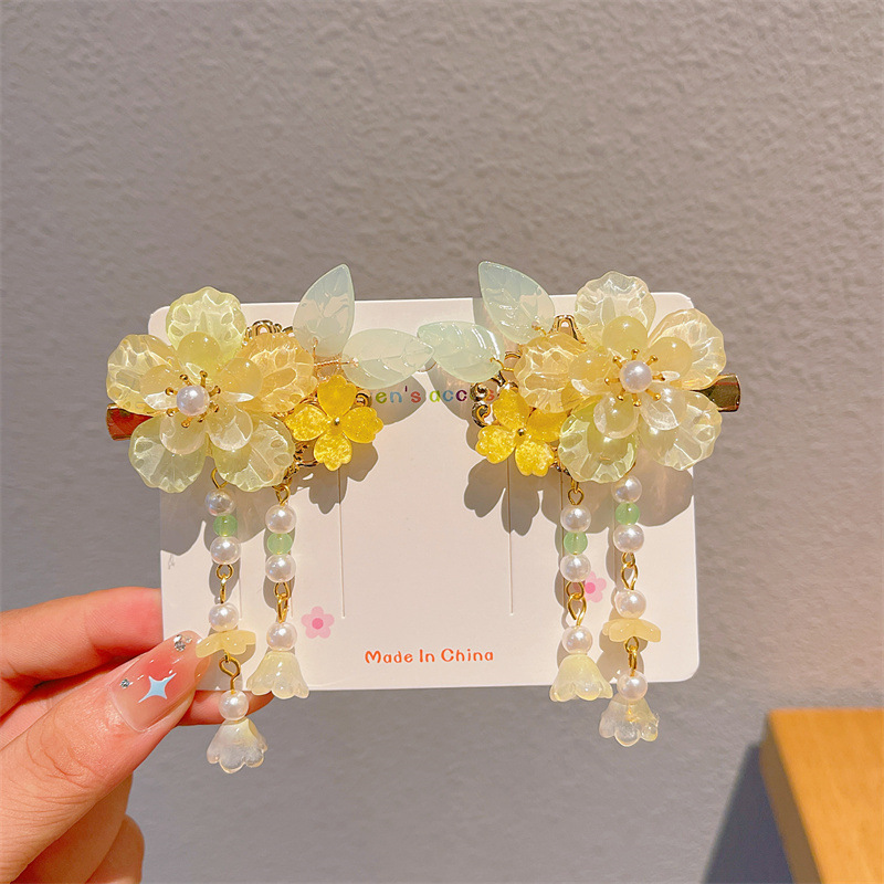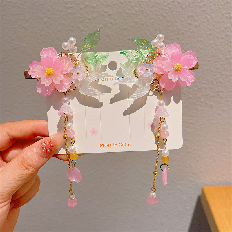 儿童红色琉璃发饰女童古风花朵发卡汉服喜庆发夹子古装边夹发夹女