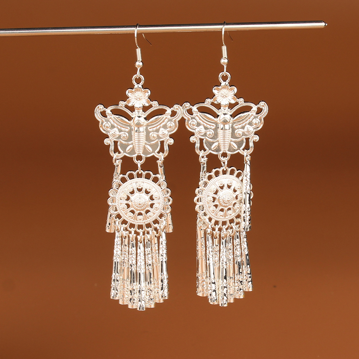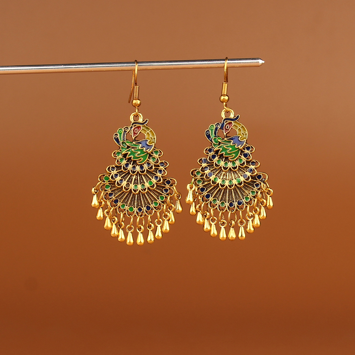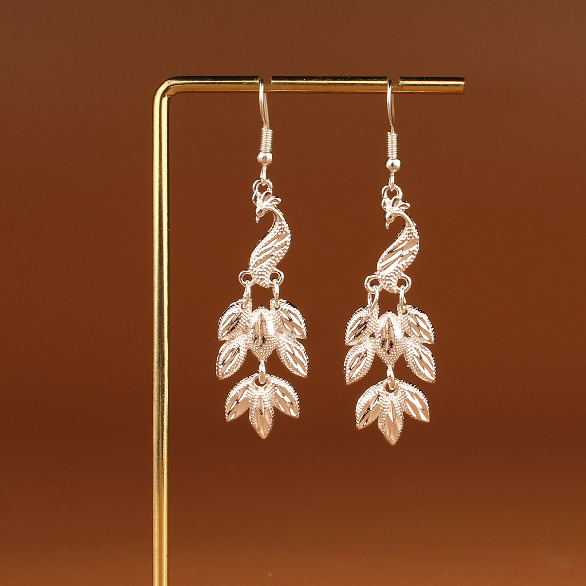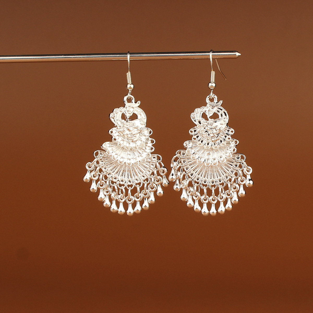少数民族风孔雀耳坠牛角耳环仿苗银景区热卖新中式长款流苏耳饰