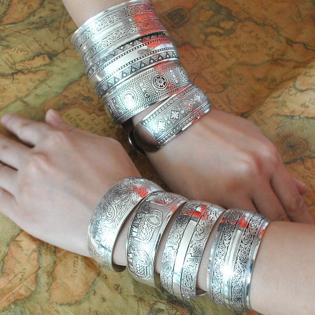 跨境古法藏银苗银宽手镯女民族风复古个性开口云南雕花镯子批发