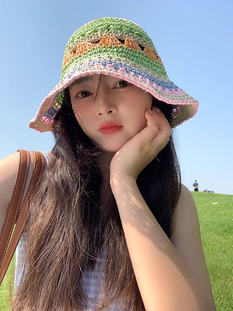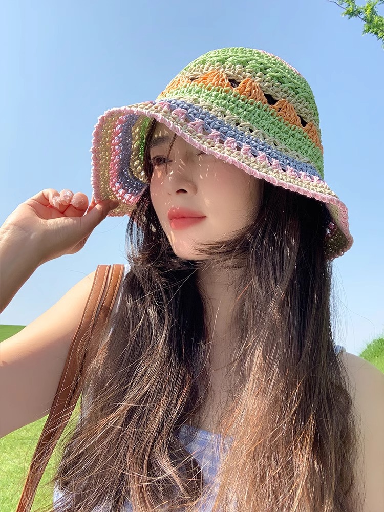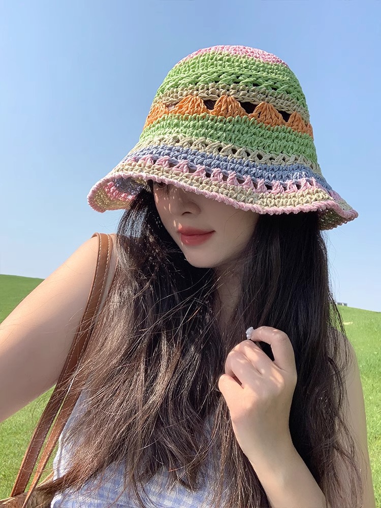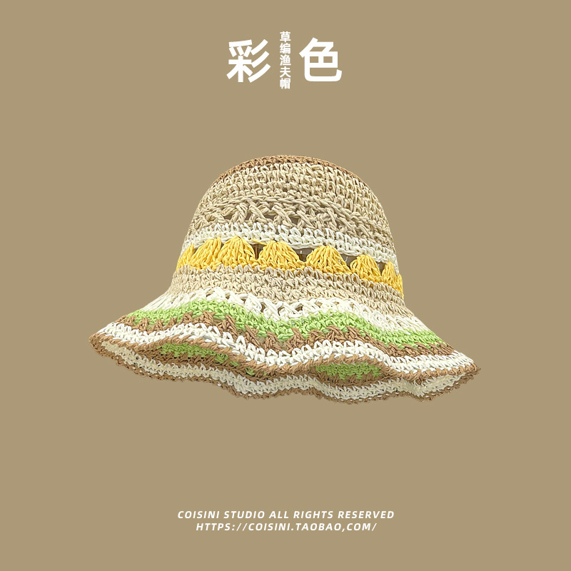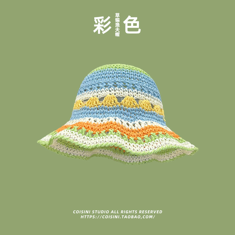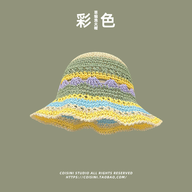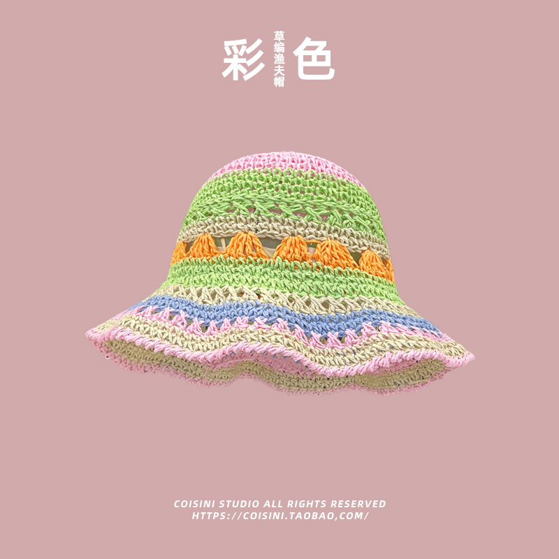 新款手工编织草帽女夏海边沙滩防晒遮阳帽子日系甜美彩色条纹韩潮