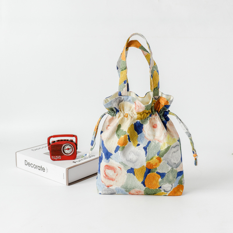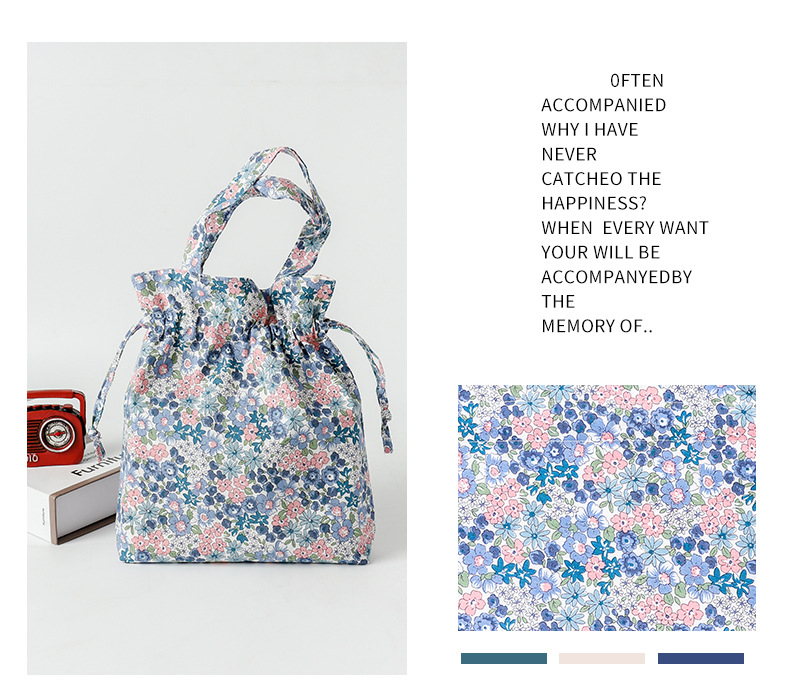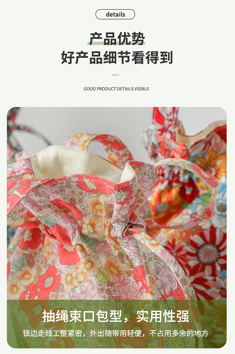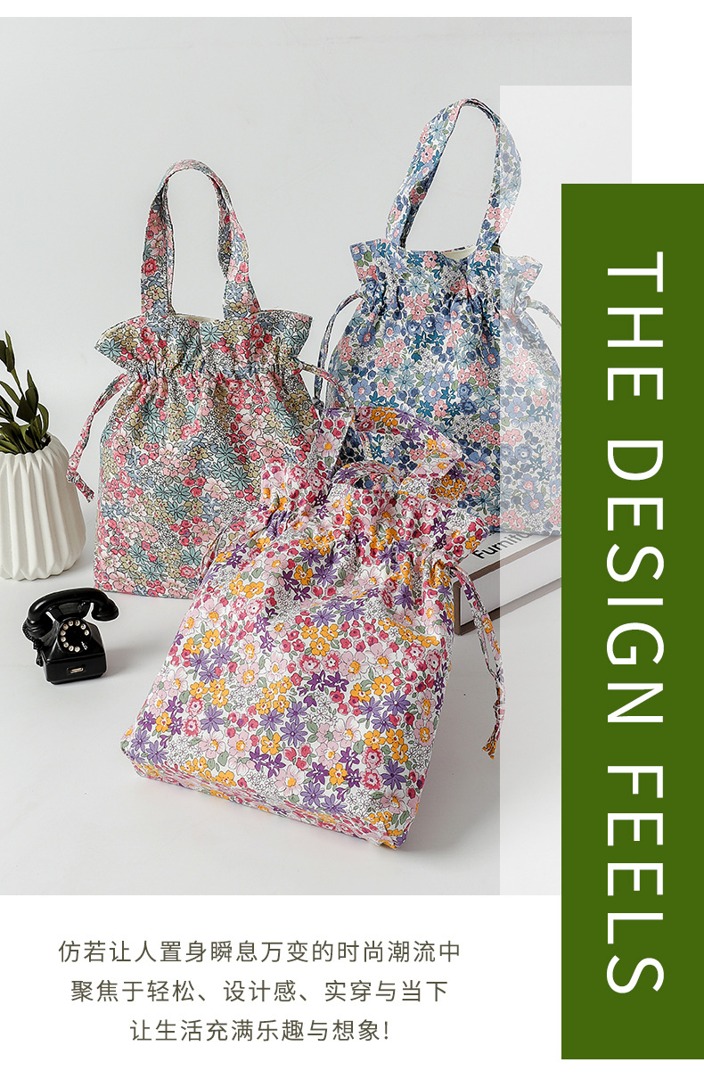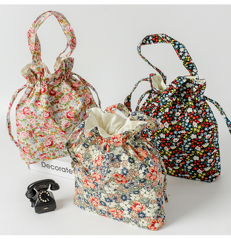 女生小碎花手提包抽绳印花束口袋 日式收纳手拎包汉服配饰棉布包