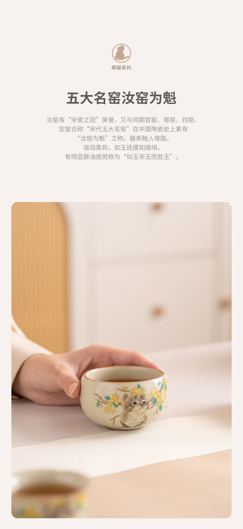 仿宋米黄汝窑萌猫茶杯大容量水杯家用单杯开片可养功夫茶具主人杯