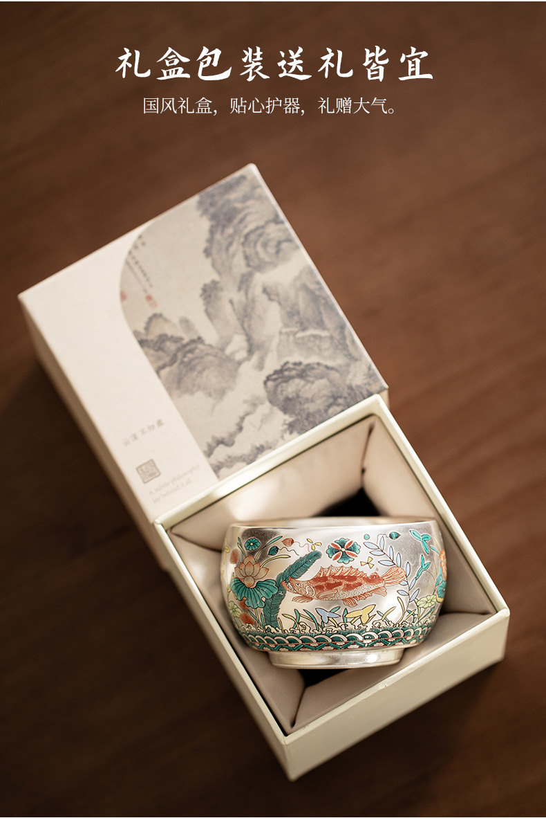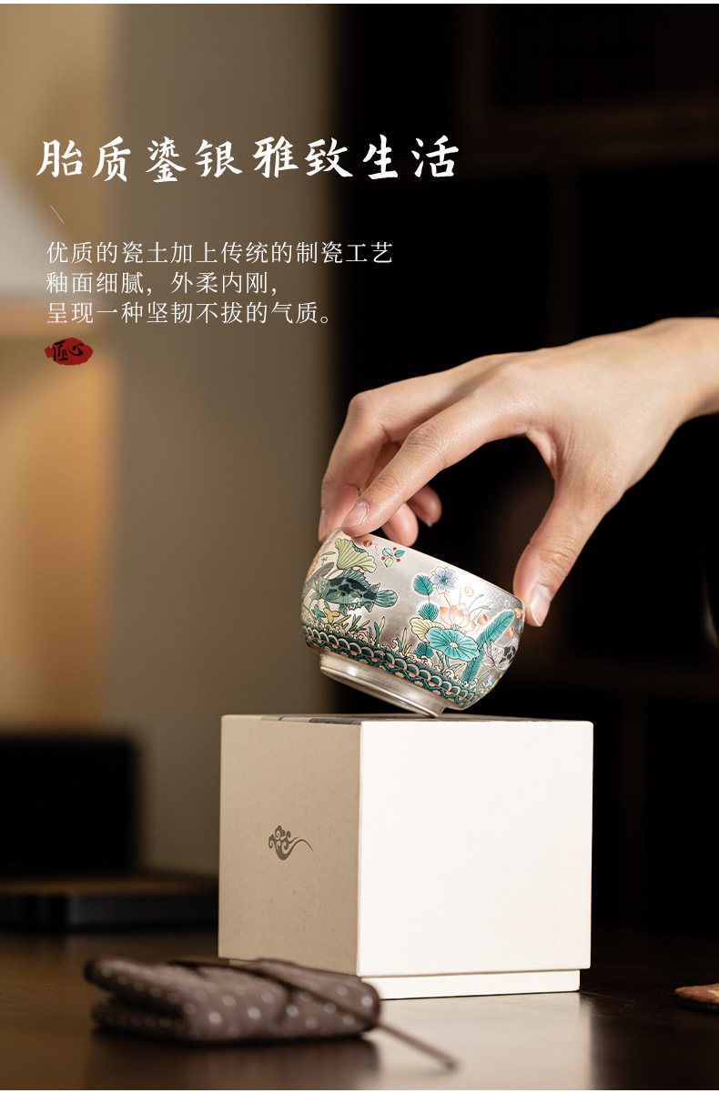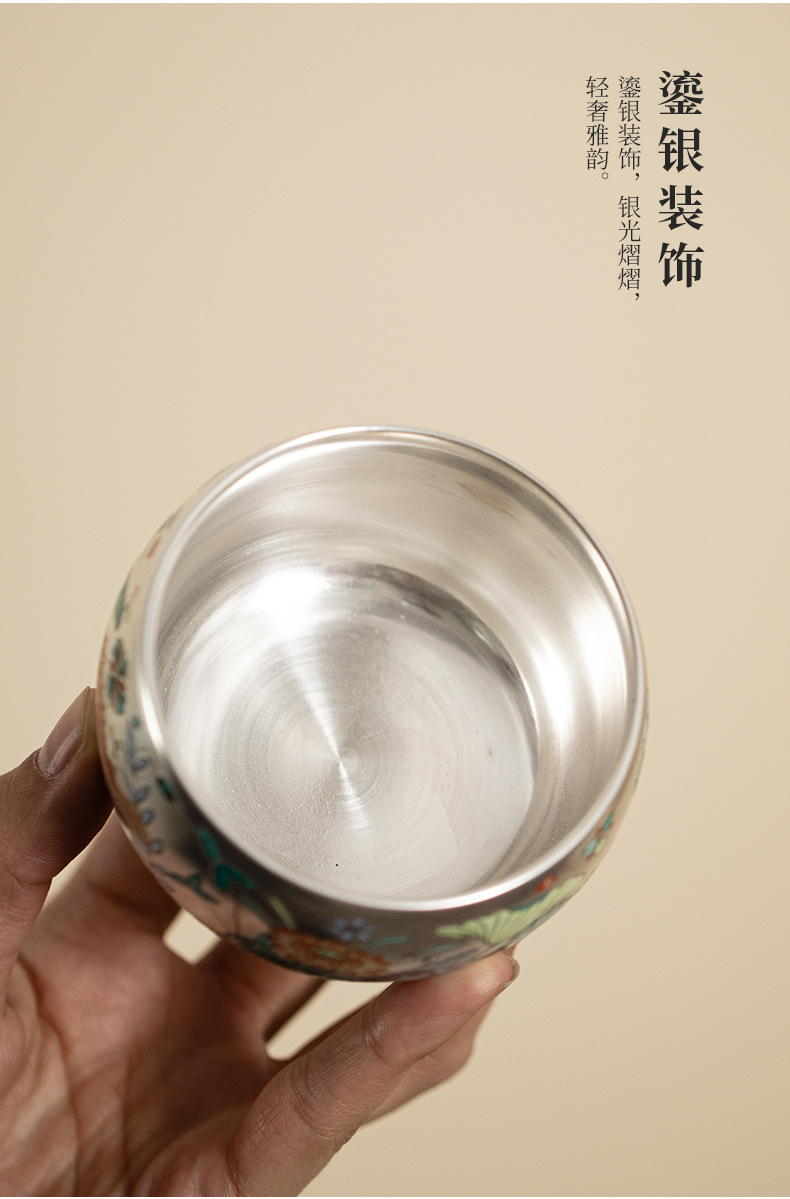 鱼藻纹鎏银主人杯陶瓷茶杯个人杯中式茶盏品茗杯单杯功夫茶具茶碗