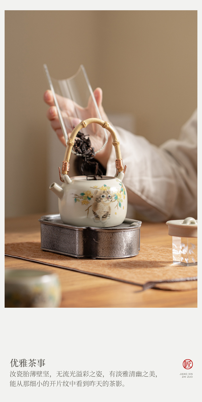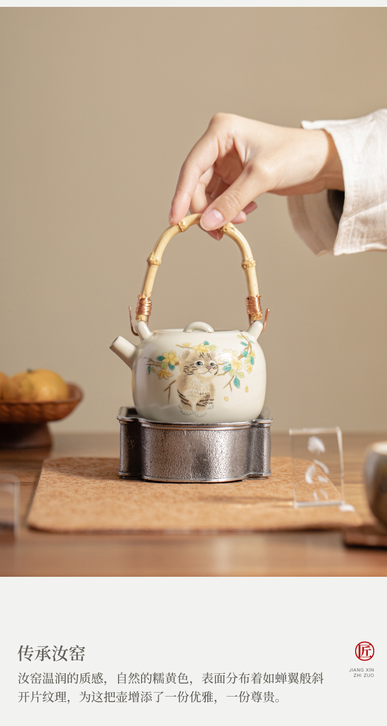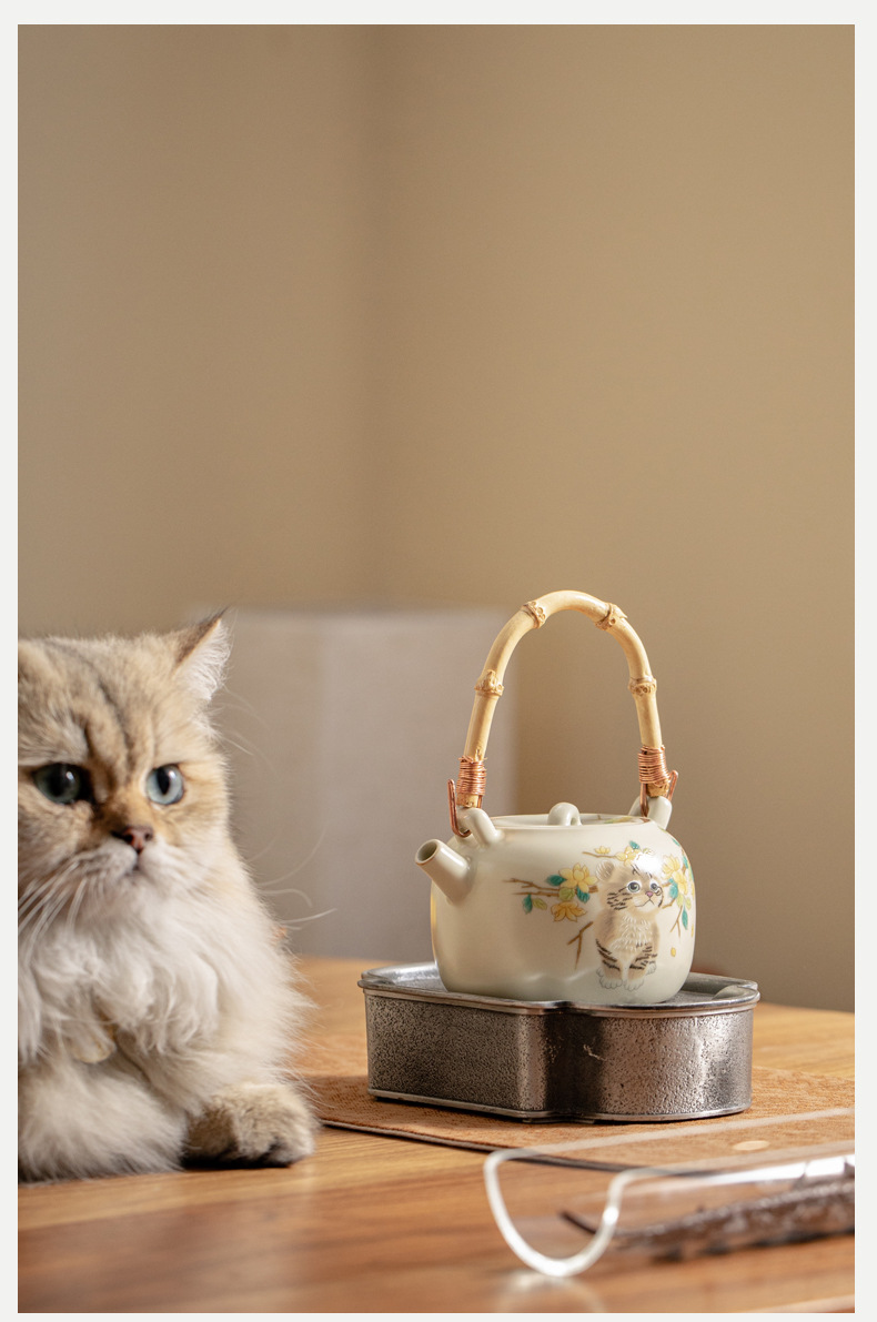 仿宋米黄汝窑萌猫提梁壶 中式陶瓷功夫茶壶小单壶泡茶器 开片可养