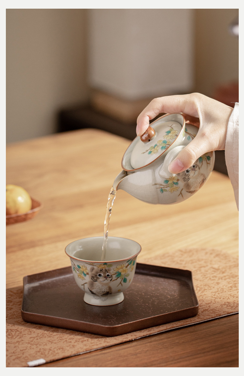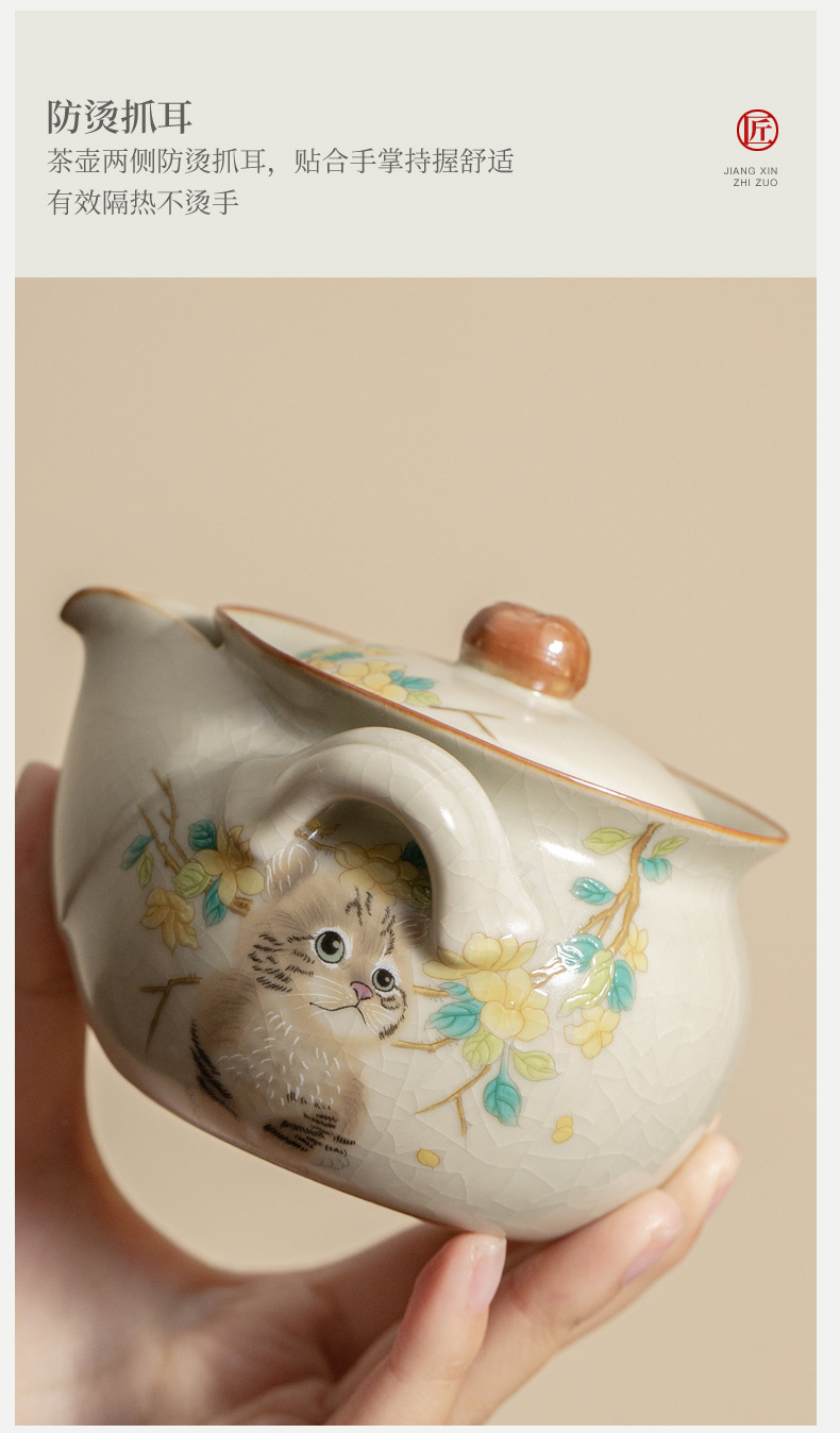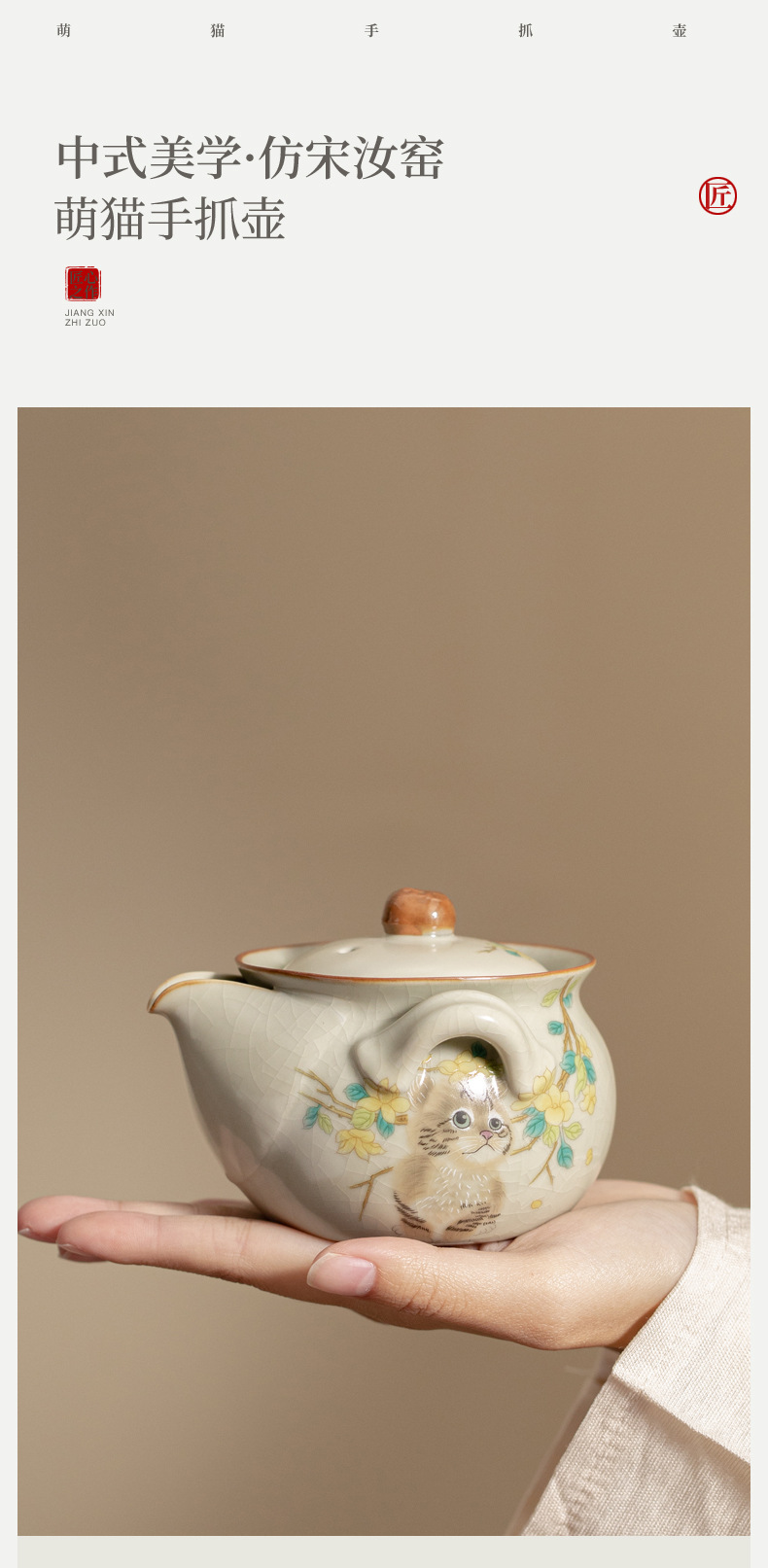 仿宋米黄汝窑萌猫手抓壶宝瓶壶防烫茶碗小盖碗轻奢复古陶瓷茶壶