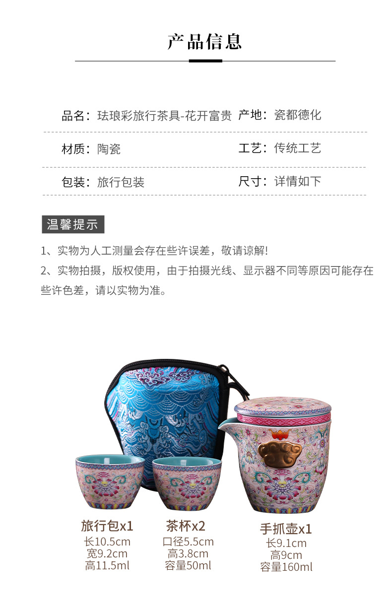 珐琅彩花开富贵旅行茶具一壶二杯便携快客杯户外喝茶过滤泡茶器