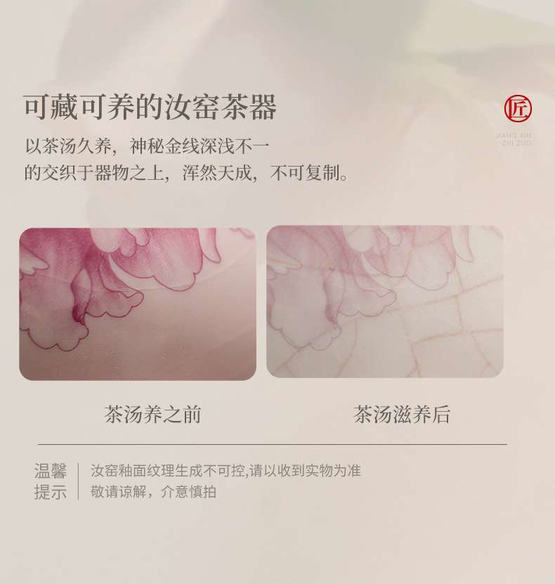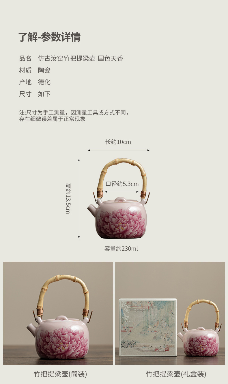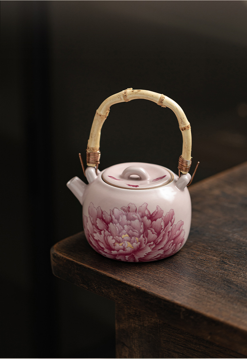 粉汝牡丹竹节提梁壶陶瓷泡茶壶开片可养国风功夫茶具单壶礼盒装