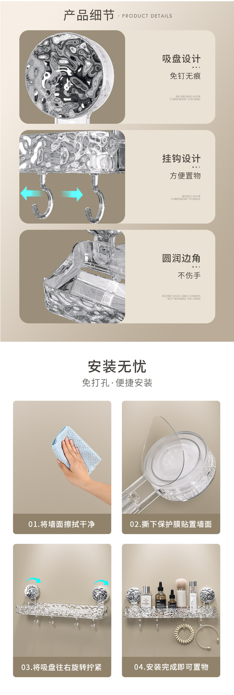 浴室吸盘置物架卫生间置物架家用洗手间免打孔卫浴壁挂收纳整理架