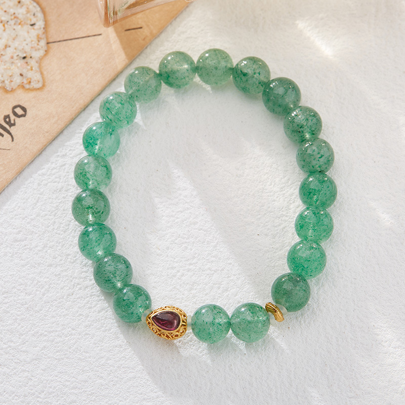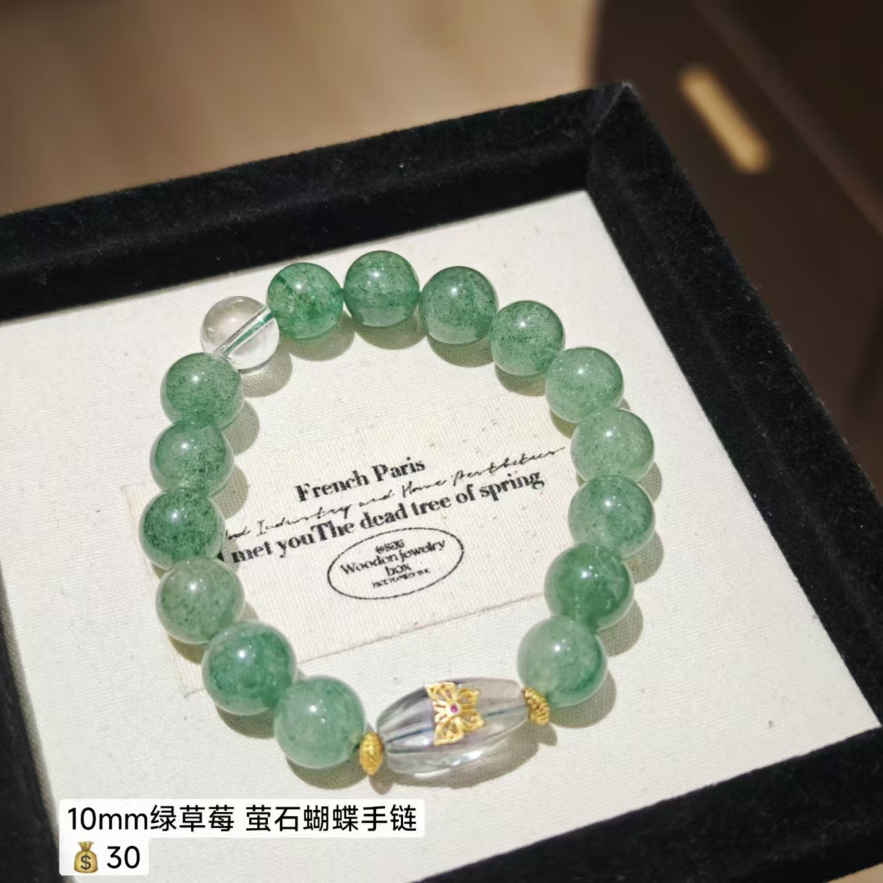 材质:绿草莓晶,925银镀金镶嵌石榴石,925银镀金隔片