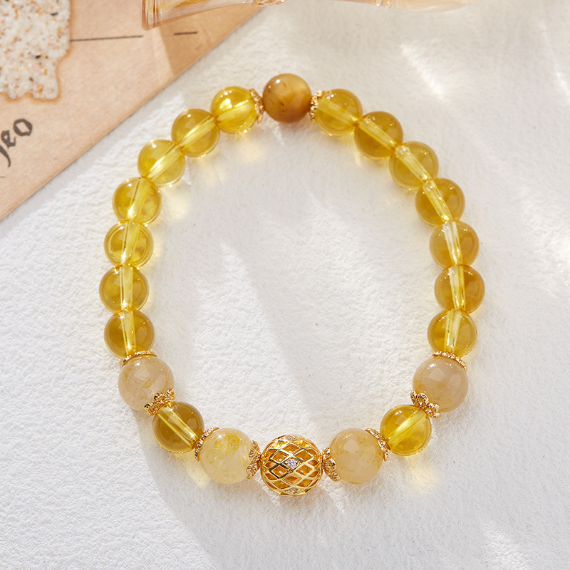 黄水晶(压电),金发晶,金虎眼,铜镀金配饰,合金花托