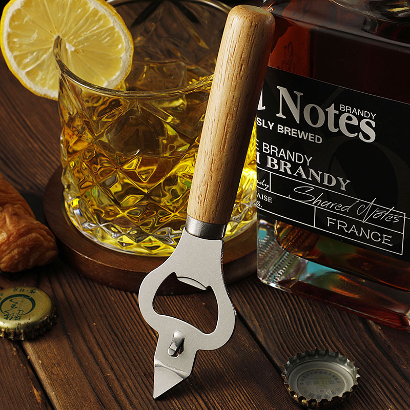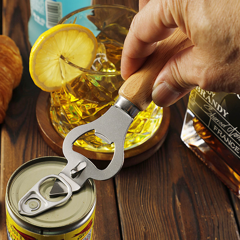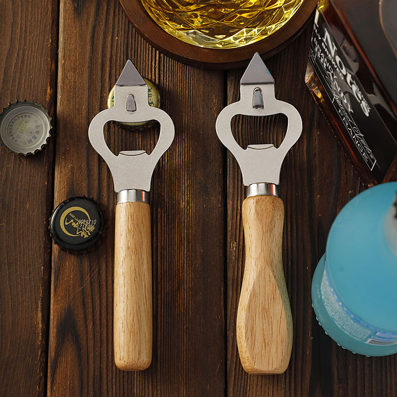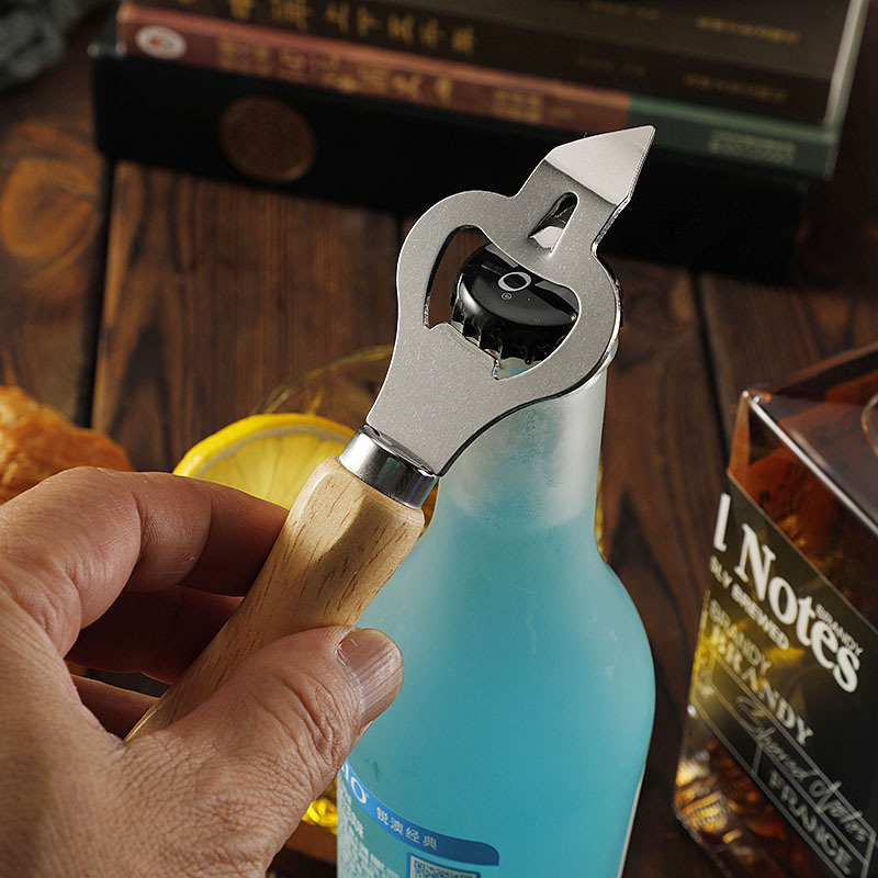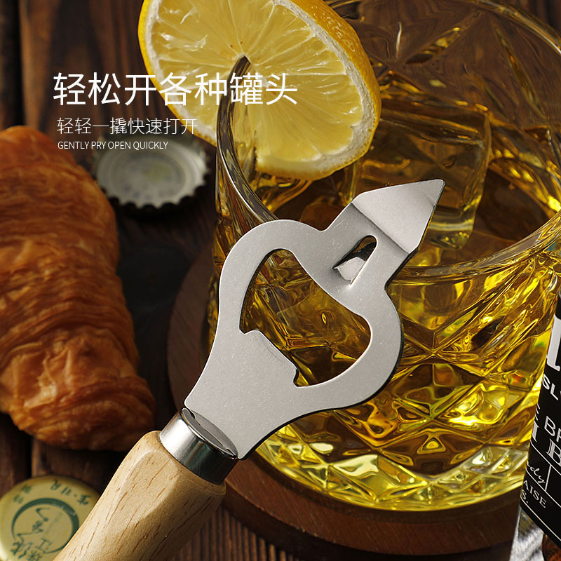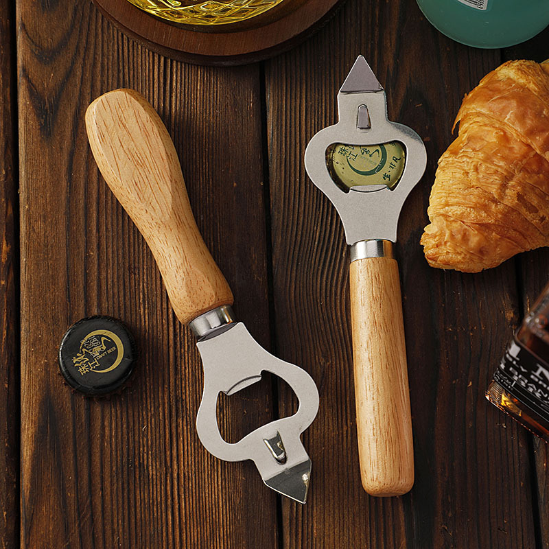 工厂现货多功能不锈钢啤酒开瓶器橡胶木柄开罐器罐头刀可印LOGO