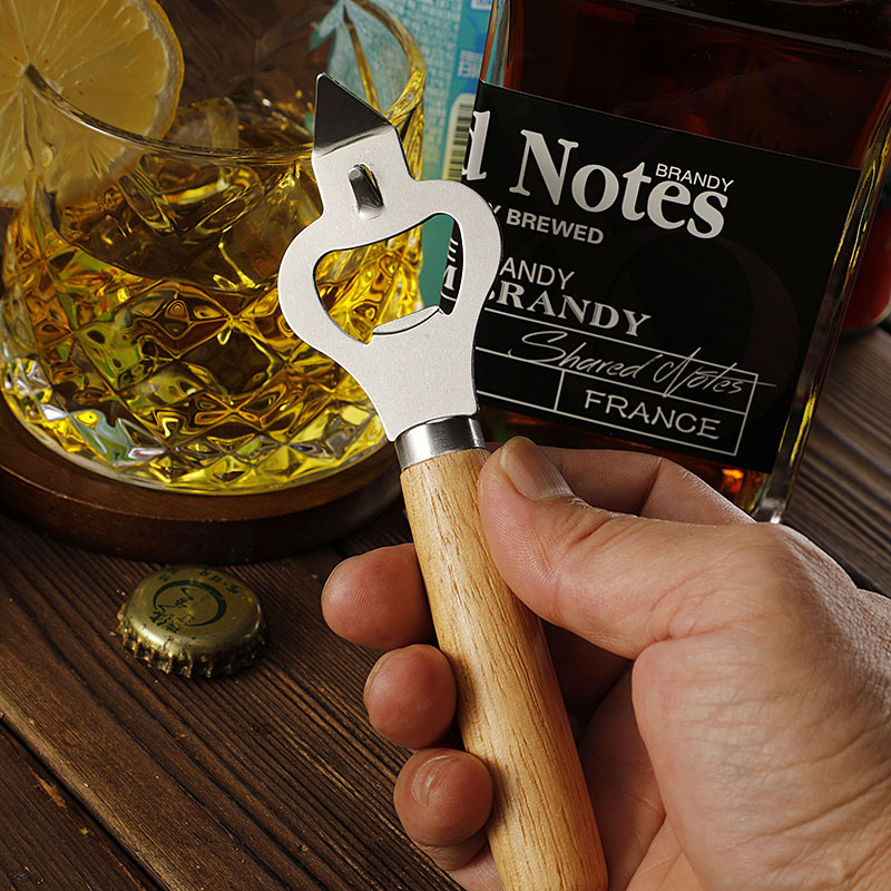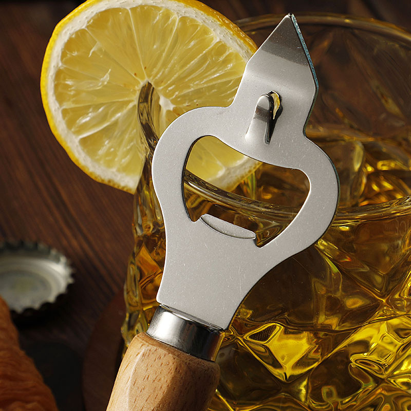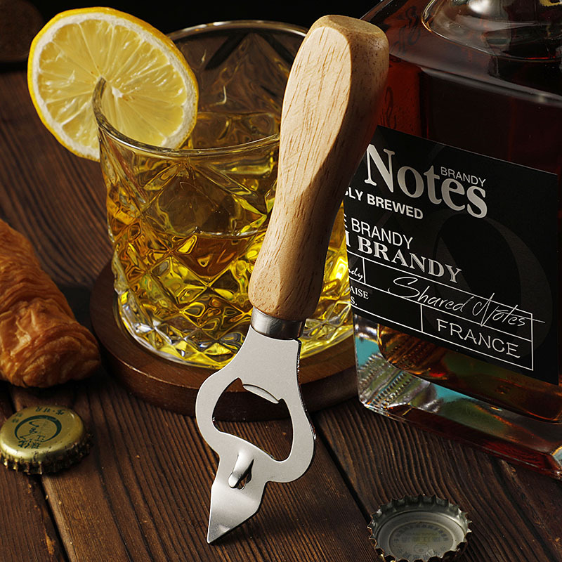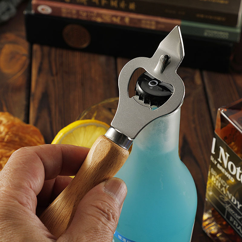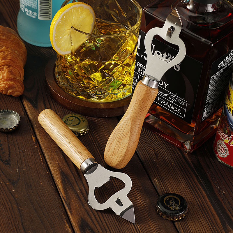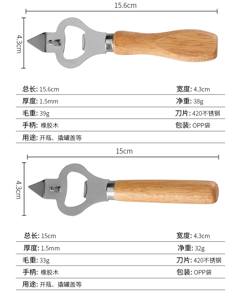工厂现货多功能不锈钢啤酒开瓶器橡胶木柄开罐器罐头刀可印LOGO