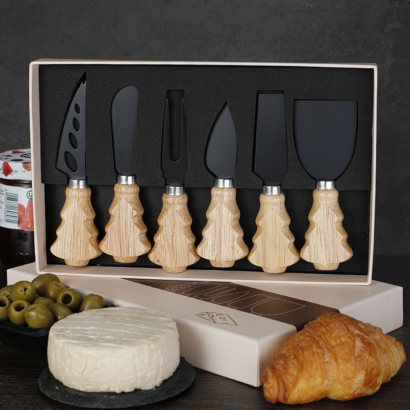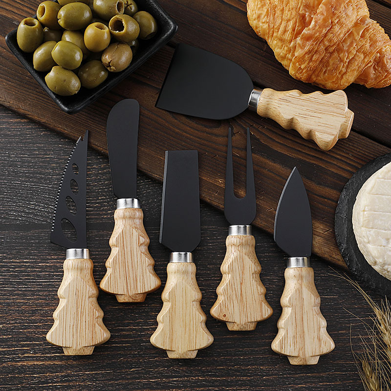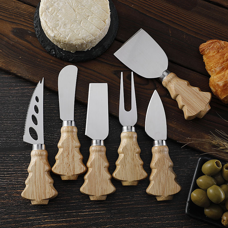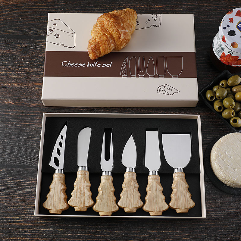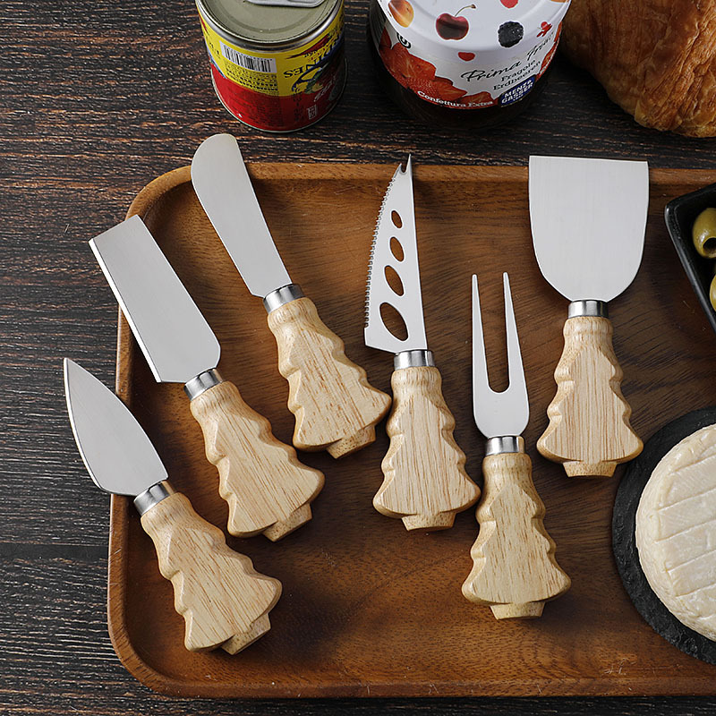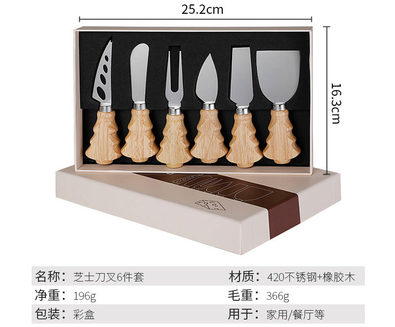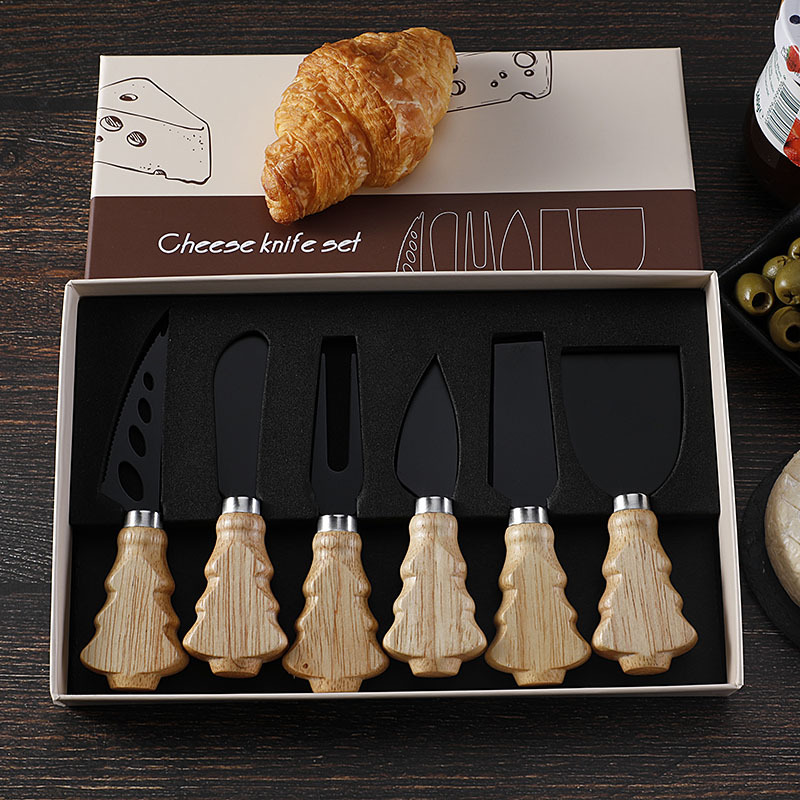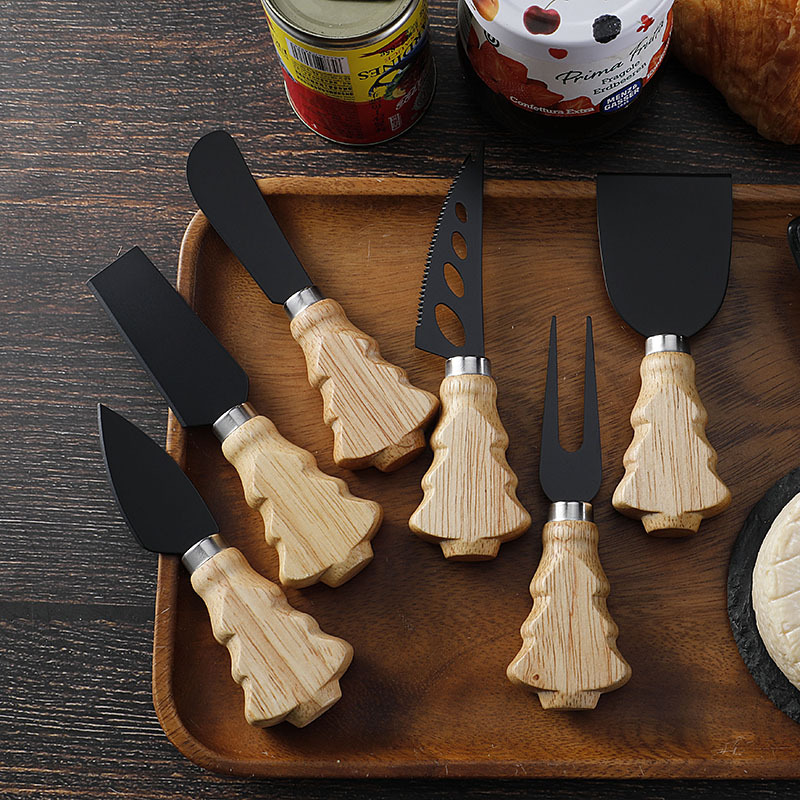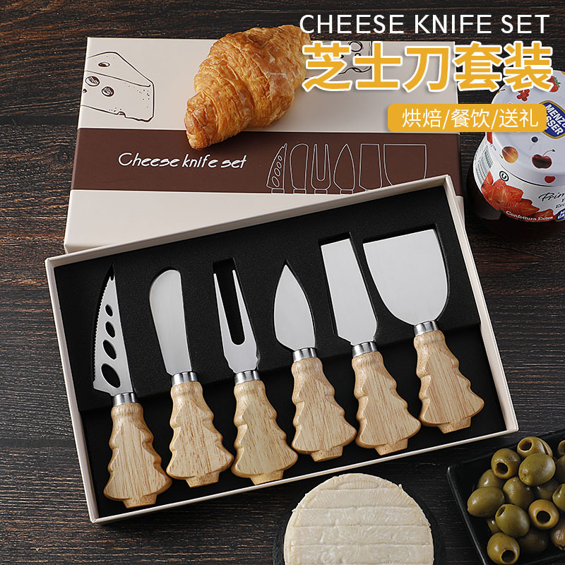 跨境西餐刀具圣诞树橡胶木柄奶酪刀黄油刀礼盒芝士刀套装6件套